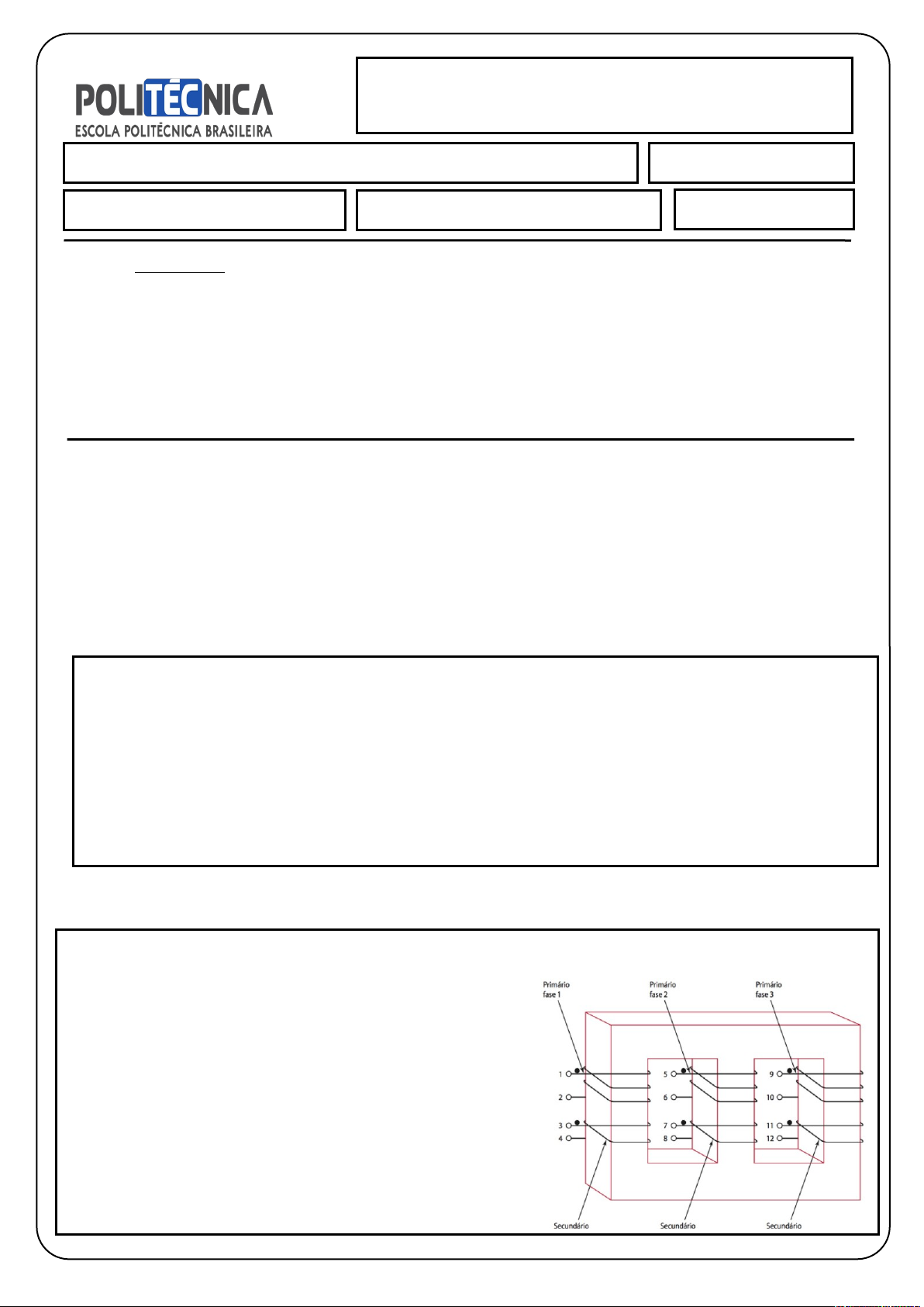 Fundamentos da Eletricidade II Aluno (a): ROBSON JULIO FREITAS Data: 30 / 03 /26 Atividade de Pesquisa 02 NOTA: INSTRUÇÕES: · Esta Avaliação de pesquisa contém 10 questões, totalizando 10 (dez) pontos. · Você deve preencher dos dados no Cabeçalho para sua identificação · Nome / Data de entrega · Utilize o espaço delimitado abaixo de cada questão para desenvolver suas respostas. · Só serão aceitas as respostas que estiverem dentro do espaço delimitado. · Ao terminar grave o arquivo com o nome Atividade de Pesquisa 01 (nome do aluno). · Salve o arquivo no formato .pdf e envie o arquivo pelo sistema. 1) Dois enrolamentos do secundário devem ser conectados em série. Um enrolamento tem valores nominais de 11V e 2 A. O outro tem valores nominais de 8 V e 1,5 A. a) Quais são a tensão e a corrente disponíveis se uma polaridade instantânea + é conectada à outra polaridade instantânea + ? b) Quais são a tensão e a corrente disponíveis se uma polaridade instantânea + é conectada à outra polaridade instantânea - ? Espaço para a resposta: A- TENSÃO – 11 V CORRENTE – 2 A B- TENSÃO- 19 V CORRENTE – 3,4 A 2) Considere a Figura abaixo. Para uma configuração do primário em estrela, quais terminais devem ser conectados juntos? Espaço para a resposta: 1,5 e 9 ou 2,6 e 10 ( conjuntos alternativos que identificam os terminais de cada fase primária para formar o nó da estrela) 3) Um indutor de 5 mH e um resistor de 1500 Ω estão conectados em série com uma fonte de tensão CA. Qual é a impedância desse circuito em 30 kHz? Determine também a corrente e a potência para este circuito quando a amplitude da fonte de tensão é 50 V. Espaço para a resposta: A IMPEDÊNCIA DESSE CIRCUITO EM 30 KHZ SERÁ 1771,5Ω A CORRENTE E A POTÊNCIA PARA ESTE CIRCUITO QUANDO A AMPLITUDE DA FONTE DE TENSÃOÉ DE 50 SERÁ RESPECTIVAMENTE 28,2 m A e 1,2 W 4) Altere o valor de R na Figura abaixo para 2,2 kΩ e determine IT e Z. Espaço para a resposta:REATÂNCIA INDUTIVA (XL) XL = 2π f L = 2π x 50.000 x 0,1≈ 3141,6Ω corrente do resistor: IR = V/R = 50/2200≈0,2227 A =22,7 m A IMPEDANCIA TOTAL: (Z) P/ R e L em paralelo Z= R X jXL / RjXL ≈1385 Ω VALOR MÓDULO APROXIMADO 5) Determine a velocidade síncrona de um motor de 8 polos, 240 V, 60 Hz. Espaço para a resposta: Vs = 120 x f / p Vs = 120 x 60 / 8 Vs = 900 RPM 6) Determine o escorregamento de um motor de 2 polos, 120 V, 60 Hz como velocidade nominal de 3450 rpm. Espaço para a resposta: ESCORREGAMENTO ≈ 4,17% cálculo velocidade síncrona = 3600 RPM ; S = 3600 – 3450 / 3600 x 100 7) A chave de partida geralmente abre quando a velocidade de motor atinge entre ___80_______ e ___90________ % da velo- cidade nominal. 8) Qual é a sensibilidade de um voltímetro que usa um medidor de conjunto móvel de 25 μA? Espaço para a resposta: sensibilidade = 40.000 Ω / V 1 / 25 x 10-6 = 40.000) 9) Um medidor de conjunto móvel de 150 μA, 200 Ω, é usado em um voltímetro de 50 V. Qual é a resistência do multiplicador e a potência dissipada por ele? Espaço para a resposta: tensão do medidor: Vm = Im x Rm= 150 x 10-6 x 200=0,03 V resistência total do voltímetro: Rtotal = Vtotal / Im =50 / 150 x 10-6 ≈ 333.333,33 Ω resistência do multiplicador: Rp = Rtotal – Rm ≈ 333.133,33 Ω potência dissipada : 0,0075 W ou 7,5 mW 10) Qual é a resistência interna de um voltímetro de 250 V, que usa um medidor de conjunto móvel de 50 μA? Espaço para a resposta: RESISTÊNCIA INTERNA 5.000.000 Ω CÁLCULO R = V / I = 250 / 50 X 10-6 = 5.000.000 Ω Atividade de Pesquisa 02: Fundamentos da Eletricidade II image1.png image2.png image3.png