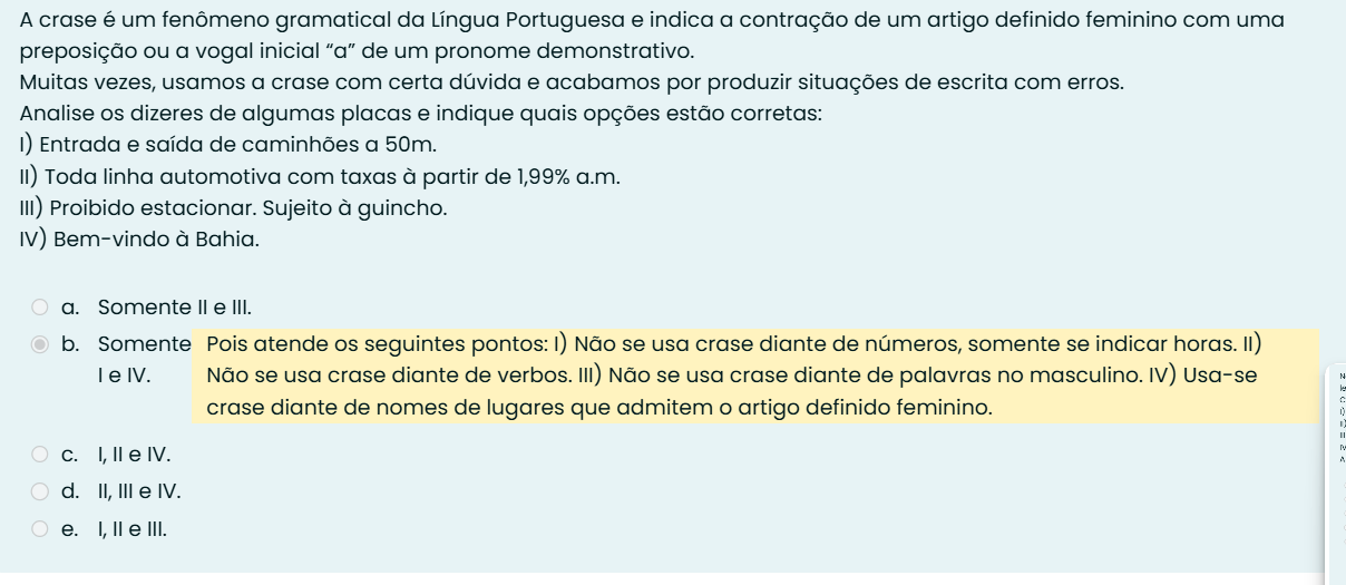 A crase é um fenômeno gramatical da Língua Portuguesa e indica a contração de um artigo definido feminino com uma preposição ou a vogal inicial "a" de um pronome demonstrativo. Muitas vezes, usamos a crase com certa dúvida e acabamos por produzir situações de escrita com erros. Analise dizeres de algumas placas e indique quais opções estão corretas: Entrada e saída de caminhões a 50m. II) Toda linha automotiva com taxas à partir de 1,99% a.m. III) Proibido estacionar. Sujeito à guincho. IV) Bem-vindo à a. Somente e III. b. Somente Pois atende seguintes pontos: Não se usa crase diante de números, somente se indicar horas. II) I e IV. Não se usa crase diante de verbos. III) Não se usa crase diante de palavras no masculino. IV) Usa-se crase diante de nomes de lugares que admitem artigo definido feminino. C. I, e IV. d. II, III e IV. e. I, e III.