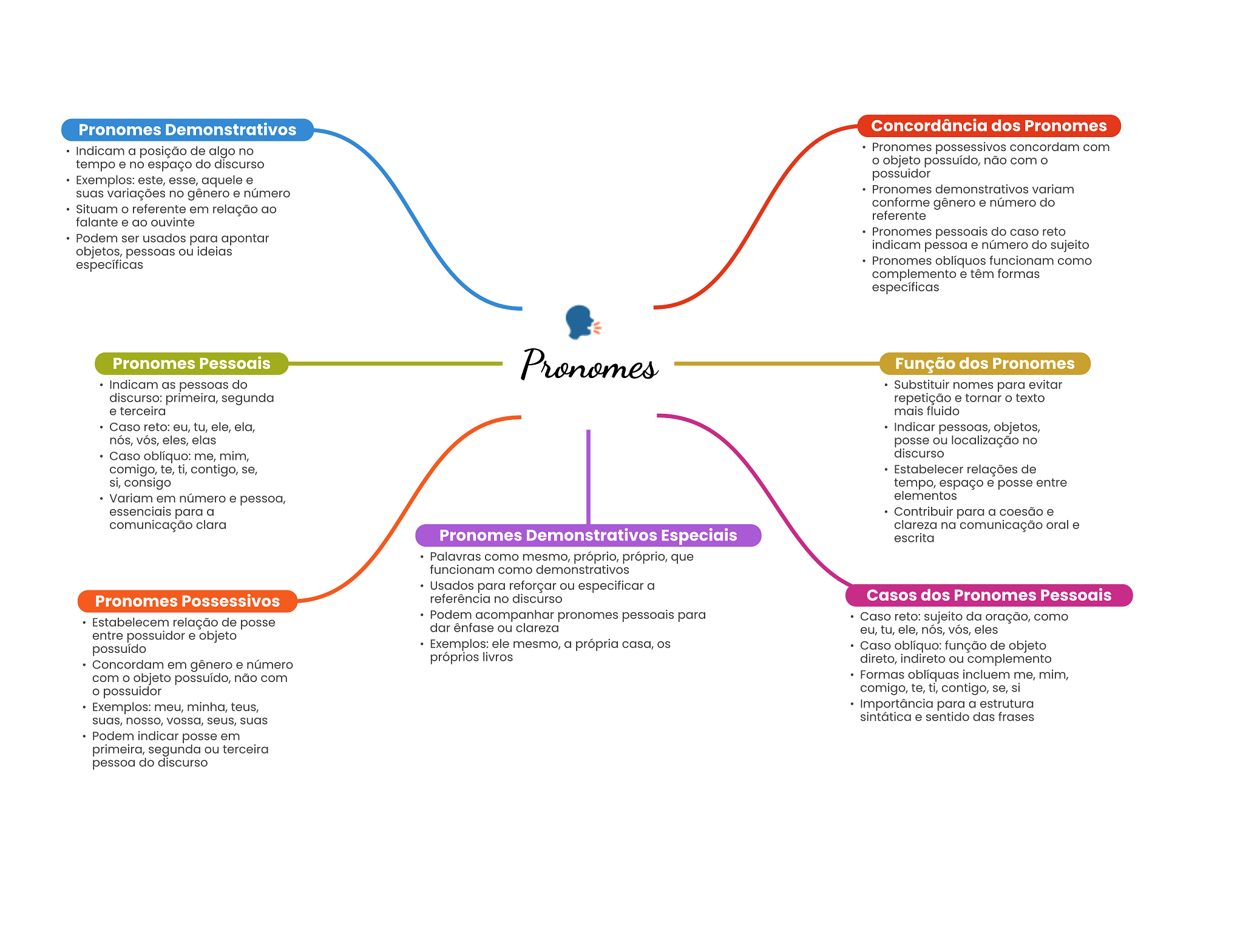 Pronomes Demonstrativos Concordância dos Pronomes Indicam a posição de algo no Pronomes possessivos concordam com tempo e no espaço do discurso objeto possuído, não com Exemplos: este, esse, aquele e possuidor suas variações no gênero e número Pronomes demonstrativos variam Situam referente em relação ao conforme gênero e número do referente falante e ao ouvinte Podem ser usados para apontar Pronomes pessoais do caso reto objetos, pessoas ou ideias indicam pessoa e número do sujeito específicas Pronomes oblíquos funcionam como complemento e têm formas específicas Pronomes Pessoais Pronomes Função dos Pronomes Indicam as pessoas do Substituir nomes para evitar discurso: primeira, segunda repetição e tornar texto e terceira mais fluido Caso reto: eu, tu, ele, ela, Indicar pessoas, objetos, nós, eles, elas posse ou localização no Caso oblíquo: me, mim, discurso comigo, te, ti, contigo, se, Estabelecer relações de si, consigo tempo, espaço e posse entre Variam em número e pessoa, elementos essenciais para a Contribuir para a coesão e comunicação clara clareza na comunicação oral e Pronomes Demonstrativos Especiais escrita Palavras como mesmo, próprio, próprio, que funcionam como demonstrativos Usados para reforçar ou especificar a Pronomes Possessivos referência no discurso Casos dos Pronomes Pessoais Podem acompanhar pronomes pessoais para Estabelecem relação de posse Caso reto: sujeito da oração, como dar ênfase ou clareza entre possuidor e objeto eu, tu, ele, nós, eles possuído Exemplos: ele mesmo, a própria casa, Caso oblíquo: função de objeto próprios livros Concordam em gênero e número direto, indireto ou complemento com objeto possuído, não com Formas oblíquas incluem me, mim, possuidor comigo, te, ti, contigo, se, si Exemplos: meu, minha, teus, Importância para a estrutura suas, nosso, vossa, seus, suas sintática e sentido das frases Podem indicar posse em primeira, segunda ou terceira pessoa do discurso
