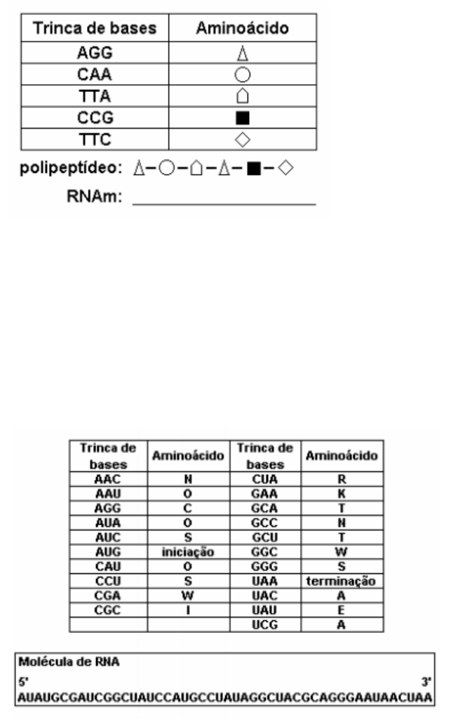 ESTUDO DIRIGIDO TEXTO: DO GENE À PROTEÍNA O DNA é um polímero constituído por vários nucleotídeos e as proteínas são polímeros constituídos por vários aminoácidos. Um gene é constituído por um número N de nucleotídeos que codifica uma proteína constituída por P aminoácidos. Por que sempre encontramos N > P ? Considere a tabela abaixo, contendo códigos de trincas de bases do DNA com os aminoácidos correspondentes, para resolver os itens seguintes: a) determine a sequência de bases do RNAm que foi utilizado para sintetizar o Polipeptídio esquematizado abaixo da tabela. b) se ocorresse uma substituição, por uma purina, na 3ª base do código correspondente ao 6º aminoácido do polipeptídio, qual seria o aminoácido da tabela a ser incorporado? c) qual é anticódon correspondente ao novo aminoácido incorporado? A tabela adiante representa uma versão fictícia do código genético. Entretanto, esse código segue o padrão do código genético universal, no qual três bases codificam um aminoácido. Analise a tabela e faça o que se pede: a) Cite o nome da enzima que catalisa a síntese de RNA mensageiro. b) Cite a sequência do anticódon correspondente ao códon de iniciação. c) Qual a sequência de aminoácidos que resultará da tradução da molécula de RNA mensageiro? Ver figura anterior. d) Qual a sequência de aminoácidos que resultará da tradução da mesma molécula de RNAm, após uma deleção do TERCEIRO nucleotídeo? Os códons AGA, CUG, e ACU do RNA mensageiro codificam, respectivamente os aminoácidos arginina, leucina e treonina. Escreva esses aminoácidos na ordem correspondente à sequência TGA - TCT - GAC de um segmento de DNA. Uma fita de DNA tem a seguinte sequência de bases 5'ATGCGT3'. a) Considerando que tenha ocorrido a ação da DNA-polimerase, qual será a sequência de bases da fita complementar? b) Se a fita complementar for usada durante a transcrição, qual será a sequência de bases do RNA resultante e que nome recebe esse RNA se ele traduzir para síntese de proteínas? O que é o processo de Splicing? Qual sua importância? O que são os processos de iniciação, elongação e terminação na síntese proteica? Caracterize cada um deles.