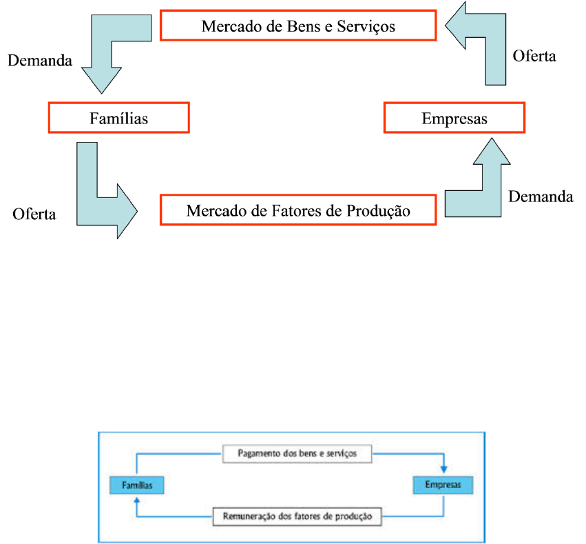 Economia de Mercado – Fluxos real e monetário Para entender o funcionamento do sistema econômico suponha uma economia de mercado que não tenha interferência do governo nem transações com o exterior (economia fechada). Os agentes econômicos são as famílias (unidades familiares) e as empresas (unidades produtoras). As famílias são proprietárias dos fatores de produção e os fornecem às unidades de produção (empresas) no mercado dos fatores de produção. As empresas, pela combinação dos fatores de produção, produzem bens e serviços e os fornecem às famílias no mercado de bens e serviços. A esse fluxo, (figura abaixo, de fatores de produção, bens e serviços denominamos fluxo real da economia. Na prática famílias e empresas exercem um duplo papel. No mercado de bens e serviços, as famílias demandam bens e serviços, enquanto as empresas os oferecem; no mercado de fatores de produção, as famílias oferecem serviços dos fatores de produção (que são de sua propriedade), enquanto as empresas os demandam. No entanto, o fluxo real da economia só se torna possível com a presença da moeda, que é utilizada para remunerar os fatores de produção e para o pagamento dos bens e serviços. Desse modo, paralelamente ao fluxo real, temos um fluxo monetário da economia. Unindo os fluxos real e monetário da economia, tem-se o chamado Fluxo circular da renda. Em cada um dos mercados atuam conjuntamente as forças da oferta e da demanda determinando o preço. Assim no mercado de bens e serviços formam-se os preços dos bens e serviços, enquanto no mercado de fatores de produção são determinados os preços dos fatores de produção (salários juros, lucros, aluguéis...) Esse fluxo também chamado de fluxo básico é o que se estabelece entre famílias e empresas. O fluxo completo incorpora o setor público, adicionando o efeito dos impostos e dos gastos públicos, bem como o setor externo, que inclui todas as transações com mercadorias, serviços e o movimento financeiro com o resto do mundo.