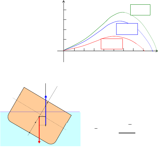 Mecânica do Navio – ESTÁTICA – Parte II 1 3.5 – ESTABILIDADE TRANSVERSAL 3.5.1 – INTRODUÇÃO Até agora verificamos as características de estabilidade inicial do navio e estabelecemos o conceito de que o indicador da estabilidade a pequenos ângulos (até cerca de 8º) é a altura metacên- trica GM. É claro, porém, que tanto os engenheiros quanto os utilizadores do navio não podem se sa- tisfazer apenas com as características de estabilidade inicial. É preciso saber qual o comportamento do navio, sob o aspecto da estabilidade, quando os ângulos de banda são grandes. Sabemos que, nestas condições (º ou 8º), o metacentro não tem mais “posição fixa”; a forma submersa da carena varia bastante, de modo que a posição de M também varia com sendo preciso estabelecer métodos de cálculo para determinar o conjugado de recuperação quando é grande. Este é o assunto que será apreciado agora. - Curva de estabilidade Os métodos para obtenção destas curvas serão analisados a seguir; alguns deles dão valores aproximados, havendo, porém, um método de cálculo que é geral, chamado método das curvas cruzadas. O método mais divulgado para a abordagem do problema da estabilidade a grandes ângulos é o das “Curvas Cruzadas”, também conhecidas como “Curvas Isóclinas”. De modo geral, a forma de representar as caracterís- ticas de estabilidade de um navio a grandes ângulos de inclinação é através de cur- vas cujas abscissas repre- sentam os ângulos de banda () e as ordenadas o Braço do Conjugado de Endirei- tamento. Podem ser traça- das várias curvas de estabi- lidade de um mesmo navio, variando-se valores de des- locamento e de KG. Braço de Endiretamento (em cm) Ângulo de Banda (em º) 10 20 30 40 50 60 70 80 Leve c/ lastro Carregado s/ lastro Leve s/ lastro Vimos que quando um navio está com banda grande, como mostra a fig. 2 a nova linha d’água L1A1 não cruza a linha d’água corres- pondente à flutuação sem banda ( LA ) no pla- no de simetria; além disso, os vetores referen- tes ao EMPUXO na condição de flutuação sem banda e com banda não se cruzam mais no METACENTRO INICIAL, M, mas em outro ponto m, de modo que o braço do conjugado de endireitamento GZ não é mais: GZ = GM x sen L1 A1 A L K B G m M B1 50 100 150 200 Fig. 1 – Curva de estabilidade Fig. 2– Navio com banda elevada Z D Mecânica do Navio – ESTÁTICA – Parte II 2 Para a obtenção destas curvas são usadas as Balizas já empregadas no Plano de Linhas e Regras de Integração já discutidas. A REF (C) tem uma explicação detalhada do assunto. Em primeiro lugar, deve-se selecionar alguns valores de deslocamento (conseqüentemente de calado) e de ângulos de banda para os quais serão calculados os BRAÇOS DE ENDIREITAMEN- TO. Os ângulos poderão ser, por exemplo, 10º, 15º, 30º, 45º, 60º, 75º etc. Para cada ângulo são escolhidos cerca de 5 ou 6 calados para o cálculo de GZ. De modo geral procura-se uma faixa tal que abranja os valores de deslocamento passíveis de serem encontrados na operação do navio. Considera-se que o Centro de Gravidade do navio está numa certa posição assumida (Ga); pode ser, por exemplo, a posição G mostrada na FIG 2. Quando o navio está com banda, a parte da bali- za que está imersa é aquela abaixo da linha d’água L1A1. Usa-se como referência um plano vertical longitudinal passando pela posição G adotada arbitra- riamente para o centro de gravidade. O traço deste plano é a reta GD. - Para cada valor de ângulo de banda determina-se: (a) uma curva de áreas de balizas com relação ao comprimento do navio; (b) uma curva de momentos estáticos das balizas com relação ao plano de referência GD. 0 1 2 3 4 5 6 7 10.000 15.000 20.000 25.000 30.000 (tons) 35.000 15º 30º 45º 60º 75º G a Z - B ra ço d e E nd ir ei ta m en to ( ft ) 23.000 Fig. 3– Curvas Cruzadas de Estabilidade (KGa = 20 ft) 90º Fig. 4– Plano de balizas KGa = 20 ft Mecânica do Navio – ESTÁTICA – Parte II 3 As duas curvas são traçadas com relação ao comprimento do navio. As áreas sob as duas curvas acima darão o volume de deslocamento sob a linha d’água inclina- da e o momento deste volume com relação ao plano de referência GD. O resultado da divisão do momento pelo volume dará a distância do Centro de Carena ao plano de referência. Esta distância é exatamente B1D = GZ, isto é, o braço de endireitamento do conjugado de recu- peração do navio no deslocamento estabelecido e no ângulo de banda ( para os quais o cálculo foi feito e para a posição do Centro de Gravidade que foi adotada arbitrariamente. Repete-se a mesma operação acima para todos os valores de deslocamento que foram previa- mente selecionados. Pela descrição efetuada vê-se que cada cálculo realizado fornecerá os seguintes resultados: um valor de braço de endireitamento GZ para um valor de em cada inclinação em função de certa posição adotada arbitrariamente para G. Nestas condições, pode-se efetuar uma representação gráfica dos braços de endireitamento em função do deslocamento, para valores constantes de obtidos com a posição assumida Ga, como mostra a figura 3. Estas são as Curvas Cruzadas de Estabilidade. Estas curvas também são chama- das curvas isóclinas porque os valores de braços de endireitamento são obtidos em função de , para valores constantes da inclinação. Trata-se de uma informação muito valiosa para o navio. Com auxílio destas curvas será possí- vel traçar curvas de estabilidade para qualquer condição de carga e posição do centro de gravidade do navio. 3.5.2 – Dificuldades que cercam a obtenção das CURVAS CRUZADAS A preparação das Curvas Cruzadas é de grande importância para o conhecimento do navio, mas há algumas dificuldades para sua obtenção; a maior delas reside na grande quantidade de cál- culos. Suponhamos que se queira obter uma curva como a da Fig. 3 com seis 