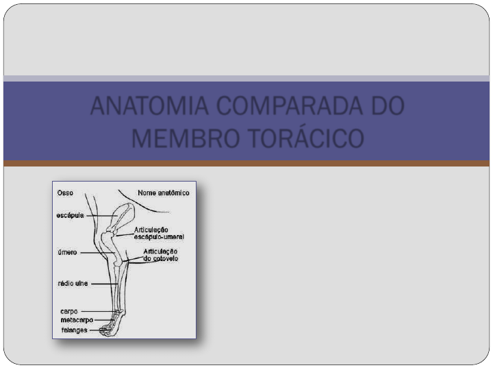 Profa. Kátia Moema Sampaio DCAA/ UESC ANATOMIA COMPARADA DO MEMBRO TORÁCICO Anatomia Animal I Curso de Medicina Veterinária INTRODUÇÃO Regiões anatômicas • Ombro (a) • Braço (b) • Antebraço (c) • Mão (d) a b c d Esqueleto do equino OMBRO OSSO: Escápula EQUINO Face Lateral Face Medial OMBRO OSSO: Escápula SUÍNO BOVINO CANINO FELINO Acrômio Acrômio Processo hamato Processo supra- hamato Acrômio Processo hamato OMBRO MÚSCULOS - Grupo lateral - Grupo medial EQUINO Face Lateral Face Medial OMBRO MÚSCULOS - Grupo lateral SUINO BOVINO MÚSCULO DELTÓIDE CANINO FELINO Parte Escapular Parte Acromial BRAÇO OSSO: Úmero EQUINO Forame supracondilar Fossa coronóide BRAÇO OSSO: Úmero SUÍNO FELINO BOVINO Forame supratroclear Cristas do tubérculo menor e maior CANINO CANINO BRAÇO MÚSCULOS - Grupo cranial - Grupo caudal EQUINO Face Lateral Face Medial BRAÇO MÚSCULOS - Grupo caudal CANINO MÚSCULO TRÍCEPS BRAQUIAL Cabeça longa (a) Cabeça lateral (b) Cabeça medial (c) Cabeça acessória (d) a b c d ANTEBRAÇO OSSOS: Rádio e Ulna EQUINO ANTEBRAÇO OSSOS: Rádio e Ulna SUÍNO BOVINO CANINO 1 2 3 4 Extremidade proximal do rádio do cão 1 2 3 4 5 6 Extremidade proximal da ulna do cão Circunferência articular Incisura radial MÃO OSSOS: • Carpo • Metacarpos • Falanges • Sesamóides EQUINO MÃO BOVINO MÃO SUINO MÃO CANINO 1 2 3 4 5 6 7 8 9 10 11 12 13 Superfície dorsal da mão do cão MÃO Canino Suíno Bovino Equino Dígito V Dígito IV Dígito III Dígito II Dígito I ANTEBRAÇO E MÃO MÚSCULOS - Grupo extensores - Grupo flexores EQUINO Face Lateral Face Medial ANTEBRAÇO E MÃO MÚSCULOS - Grupo extensores BOVINO MÚSCULO EXTENSOR DIGITAL COMUM CANINO -Ventre medial - Ventre lateral ANTEBRAÇO E MÃO MÚSCULOS - Grupo flexores BOVINO ANTEBRAÇO E MÃO MÚSCULOS - Grupo flexores CANINO MÚSCULO FLEXOR DIGITAL SUPERFICIAL MÚSCULO FLEXOR ULNAR DO CARPO -Cabeça ulnar -Cabeça umeral ANTEBRAÇO E MÃO MÚSCULOS CANINO MÚSCULO SUPINADOR MÚSCULO PRONADOR REDONDO MÚSCULO PRONADOR QUADRADO FIM DA AULA!