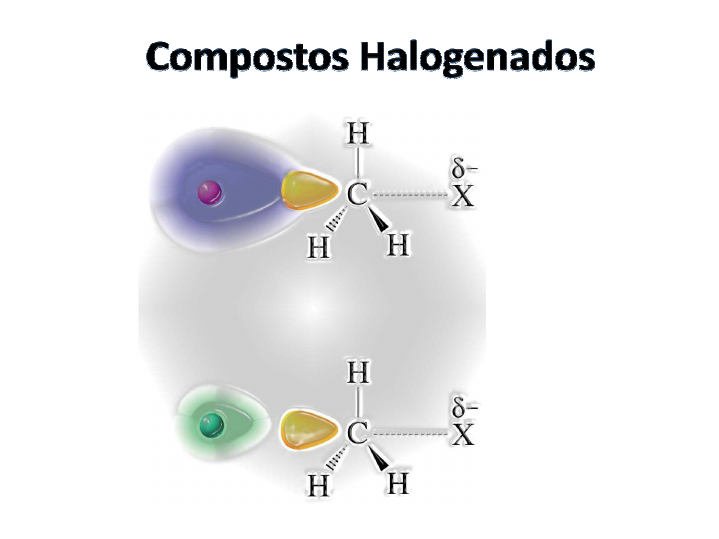 CH2Cl2 CHCl3 CH3I Classificação dos Haletos Orgânicos Haletos de alquila: átomo de halogênio ligado a um carbono hibridizado sp3. diclorometano (cloreto de metileno) triclorometano (clorofórmio) iodometano (iodeto de metila) 2-bromo-2-cloro- 1,1,1-trifluoroetano (Halotano) diclorodifluorometano (Freon-12) 1,1,1-tricloroetano CF2Cl2 CCl3–CH3 CF3–CHClBr C C X X Haletos de vinila: átomo de halogênio ligado a um carbono hibridizado sp2. Haletos de arila: átomo de halogênio ligado a um carbono hibridizado sp2 aromático. Haletos de vinílico Haletos de fenila ou arila Importância de Haletos Orgânicos 1) Solventes (relativamente não polares): CCl4, CHCl3, CCl3CH3, CH2Cl2, ClCH2CH2Cl, etc. 2) Reagentes: reações nucleofílicas, reações de eliminação, formação de organometálicos, etc. 3) Gases refrigerantes: Freons (ChloroFluoroCarbon) 4) Pesticidas: DDT, Aldrin, Clordano H ClCl ClCl Aldrin C CCl3 Cl Cl Cl Cl H H3C CH3 Cl Cl ClCl Cl ClCl Cl ClCl Cl Cl Cl DDT [1,1,1-tricloro-2,2-bis(p-clorofenil)etano Plocameno B Clordano OCH2CO2H ClCl OCH2CO2H ClCl Cl 5) Herbicidas: 2,4,5-T ácido 2,4,5-triclorofenoxiacético Agente laranja: mistura 50:50 dos ésteres 2,4-D e 2,4,5-T Dioxina (carcinogênico, teratogênico e mutagênico) 2,4-D ácido 2,4-diclorofenoxiacético Cl O Cl Cl Cl Cl Cl Cl Cl OHOH HH Cl Cl 6) Germicides: Cl O Cl para-diclorobenzeno (usado em naftalina)Hexaclorofeno (desinfetante para a pele) Propano μ = 0,0 D P.E. = -42oC Fluoroetano μ = 1,9 D P.E. = -32oC Cloroetano μ = 2,6 D P.E. = 12oC Comparação das propriedades físico-químicas Pontos de Ebulição (1 atm) Analisando as ligações C-X em Haletos de Alquila Ligação Comprimento da ligação (Å) Força da ligação (Kcal/mol) Momento de Dipolo (D) Reação de Substituição Nucleofílica em Haletos de Alquila Nu ‾ + R—X R — Nu + X ‾ Produto de Substituição Grupo Abandonador Eletrófilo δ+ δ- Nucleófilo Carregado Nu: + R—X R— Nu+ + X ‾ Produto de GrupoEletrófilo δ+ δ- Nucleófilo O átomo ou grupo que é substituído nestas reações é chamado grupo abandonador, em geral, envolvendo átomo mais eletronegativo que o átomo de carbono, por exemplo, um halogênio. A reação ocorre via heterólise da ligação R-X, onde o átomo ou grupo abandonador fica com o par de elétrons da ligação. Produto de Substituição Grupo Abandonador Eletrófilo Nucleófilo Neutro Reação de Substituição Nucleofílica de Segunda Ordem = SN2 v e l o c i d a d e v e l o c i d a d e H3C—Br + HO – H3C—OH + Br – [H C—Br] [HO–] V = k [MeBr][OH-] → reação de segunda ordem: SN2 [H3C—Br] [HO –] Mecanismo da Reação SN2 Ambos reagentes estão envolvidos no estado de transiçãode transição A formação da ligação nova acontece ao mesmo tempo que a ligação entre C-Halogênio está se rompendo. Um substituinte volumoso no haleto de alquila reduz a reatividade do haleto: impedimento estéreo Estrutura do Haleto de Alquila e a Reação de SN2 Em halogenetos terciários a reação é extremamente lenta. Mesmo sendo primário o carbono do grupo neopentila também é estericamente impedido para reagir. Força do Nucleófilo e Velocidade Relativa na Reação de SN2 Efeito do Solvente: velocidade relativa da S 2 por azida em Efeito do Solvente: velocidade relativa da SN2 por azida em vários solventes Não têm um hidrogênio ligado a um átomo eletronegativo (não formam ligações hidrogênio com o nucleófilo, como os solventes próticos) Efeitos de solventes polares apróticos sobre as reações SN2 Solvatam bem cátions e Solvatam bem cátions e deixam ânions (nucleófilos) não solvatados, pois os centros positivos no solvente são relativamente impedidos estericamente. Conduzem a geração de nucleófilos “nus”, portanto, muito reativos Estereoquímica da Reação SN2 Usando um haleto de alquila secundário onde a ligação C-Halogênio está em um carbono assimétrico é observada a inversão da configuração do carbono assimétrico (Inversão de Walden). Versatilidade: Transformações Usando SN2 Álcool Éter Tiol Tioéter NitrilaNitrila Alquino Éster Sal de amônio quaternário Azida alquília v e l o c i d a d e v e l o c i d a d e NaOH Reação de Substituição Nucleofílica de Primeira Ordem Considere a lei de velocidade empírica da reação: V = k [tBuBr] → reação de primeira ordem SN1 Substituição Nucleofílica Primeira Ordem Mecanismo da Reação SN1 A reação ocorre em duas etapaslenta rápida A primeira etapa é lenta pois envolve a quebra da ligação C-X e formação de um carbocátion intermediário. A segunda etapa é rápida, levando a formação da ligação C-Nu. Diagrama de energia livre para a reação SN1 do cloreto de terc-butila com água Perfil energético da SN1 etapa por etapa Etapa mais lenta lenta rápida Etapa 1 Etapa 2 rápida rápida Etapa 3 Estrutura do Haleto de Alquila na Reação SN1 Velocidade relativa nas reações de SN1 para diversos haletos de alquila (solvente e núcleófilo = H2O) *Embora a velocidade relativa nas reações de SN1 para estes com água seja zero, uma pequena taxa é observada como resultado de uma reação SN2 Ao contrário da reação por SN2, a reação por SN1 acontece mais rapidamente com haletos de alquila terciários. Reatividade relativa de haletos de alquila na reação de SN1 Haleto de alquila 3o > Haleto de alquila 2o > Haleto de alquila 1o Esta ordem está diretamente relacionada com a estabilidade relativa do carbocátion intermediário . Estabilidade relativa dos carbocátions carbocátion 3o > carbocátion 2o > carbocátion 1o Quanto mais estável o carbocátion, mais rápida será a reação por mecanismo SN1 . Estereoquímica da Reação SN1 Usando um haleto de alquila secundário onde a ligação C-Halogênio está em um carbono assimétrico é observada a formação de uma mistura racêmica e consequente perda da atividade óptica. produto com configuração invertida produto com retenção 