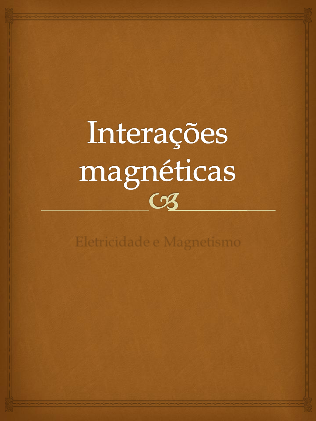 Interações magnéticas Eletricidade e Magnetismo Força Magnética sobre um fio conduzindo Corrente Torque sobre Espira de Corrente Ex.02) Um anel circular com raio igual a 2,00 cm tem 10 voltas de fio e conduz uma corrente de 3A. O eixo do anel faz um ângulo de 30° com o campo magnético de 8000G (1T = 104 G) Determine a magnitude do torque do anel. Lei de Biot - Savat Quando uma carga puntiforme q move-se com velocidade v ela produz um campo magnético B no espaço, dado por: Anel de Corrente Um elemento de corrente de um anel de raio R e vetor unitário r, aponta do elemento até o centro do anel. O campo magnético no centro do anel, devido a esse elemento de corrente, está orientado ao longo do eixo do anel e seu módulo obtido por: Eixo de uma Bobina Uma bobina circular tem raio igual a 5 cm, 12 voltas e está no plano z=0, centrada na origem. Ela conduz uma corrente de 4,0A e o momento magnético da bobina está na direção +z. Determine o campo magnético no eixo z em: a) z=0, b) z=15cm. Outras Fontes de Campo Magnético Região interna e longe das bordas do solenoide, o campo magnético é calculado por: Devido a um fio retilíneo Devido a dois fios paralelos Um fio retilíneo e longo conduz uma corrente de 1,7A na direção +z e está linha x=-3,0 cm e y=0. Um segundo fio como este conduz uma corrente de 1,7ª e está na linha x=3,0cm e y=0, como mostrado na figura. Determine a o campo magnético no ponto P no eixo y em y =6,0 cm.