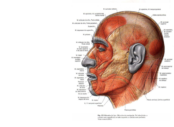 Couro cabeludo *Epicrânio é uma vasta lâmina musculotendinosa que reveste o vértice e as faces laterais do crânio, desde o osso occipital até a sobrancelha. - Ventre occipital e ventre frontal *Temporoparietal*Temporoparietal *Gálea aponeurótica (extensa aponeurose intermediária) Músculos da face * PÁLPEBRAS - M. Orbicular do olho: (Ramos temporal e zigomáticos do nervo facial) Origem: Porção orbital: Parte nasal do osso frontal, Porção lacrimal: processoPorção lacrimal: processo frontal da maxila, crista lacrimal posterior; Porção palpebral: Superfície anterior e bordas do ligamento palpebral medial. Inserção: Circunda a órbita, como um esfíncter. Ação: Fechamento ativo das pálpebras Músculos da face * PÁLPEBRAS - M. Corrugador do Supercílio (Ramos temporal e zigomáticos do nervo facial) Origem: Extremidade medial do arco superciliar. Inserção: Superfície profunda daInserção: Superfície profunda da pele. Ação: Traciona a sobrancelha para baixo e medialmente, produzindo rugas verticais na fronte. Músculos da expressão de sofrimento. Músculos da face * PÁLPEBRAS -M. Prócero (Ramos bucais do nervo facial) Origem: Fáscia que reveste a parte mais inferior do osso nasal e a parte superior da cartilagem nasal lateral.cartilagem nasal lateral. Inserção: Pele da parte mais inferior da fronte entre as duas sobrancelhas. Ação: Traciona para baixo o ângulo medial da sobrancelha e origina as rugas transversais sobre a raiz do nariz. Músculos da face * NARIZ - M. Nasal (Ramos bucais do nervo facial) Origem: - Porção Transversal: maxila, acima e lateralmente à fossa incisiva -Porção Alar: asa do nariz.-Porção Alar: asa do nariz. Inserção: - Porção Transversal: dorso do nariz - Porção Alar: imediações do ápice do nariz Ação: Dilatação do nariz Músculos da face * NARIZ -M. Depressor do septo (Ramos bucais do nervo facial) Origem: Fossa incisiva da maxila. Inserção: Septo e na parte dorsal da asa do narizdorsal da asa do nariz Ação: Traciona para baixo as asas do nariz, estreitando as narinas. Músculos da face * ORELHA - M. Auricular Anterior (Ramos bucais do nervo facial) Ação: Traciona o pavilhão da orelha para frente e para cima. - M. Auricular Superior- M. Auricular Superior (Ramos bucais do nervo facial) Ação: Traciona o pavilhão da orelha para cima. - M. Auricular Posterior (Ramos bucais do nervo facial) Ação: Traciona o pavilhão da orelha para trás. Músculos da face - M. Levantador do lábio superior (Ramos bucais do nervo facial) Origem: Margem inferior da órbita acima do forame infra- orbital, maxila e zigomático. Inserção: Lábio superior e asa do nariz.do nariz. Ação: Levanta o lábio superior e leva-o um pouco para frente Músculos da face - M. Levantador do lábio superior e da asa do nariz (Ramos bucais do nervo facial) Origem: Processo frontal da maxila . Inserção: Se divide em dois fascículos. Um se insere na cartilagem alar maior e na pelecartilagem alar maior e na pele do nariz e o outro se prolonga no lábio superior . Ação: Dilata a narina e levanta o lábio superior. Músculos da face - M. Levantador ângulo da boca (Ramos bucais do nervo facial) Origem: Fossa canina (maxila). Inserção: ângulo da boca Ação: Eleva o ângulo da boca e acentua o sulco nasolabial.acentua o sulco nasolabial. Músculos da face - M. Zigomático menor (Ramos bucais do nervo facial) Origem: Superfície malar do osso zigomático. Inserção: Lábio superior (entre o levantador do lábio superior e o zigomático maior). Ação: Auxilia na elevação do lábio superior e acentua o sulco nasolabial. Músculos da face - M. Zigomático maior (Ramos mandibular e bucal do nervo facial) Origem: Superfície malar do osso zigomático. Inserção: Ângulo da boca. Ação: Traciona o ângulo daAção: Traciona o ângulo da boca para trás e para cima (risada). Músculos da face - M. Risório (Ramos mandibular e bucal do nervo facial) Origem: Fáscia do masseter. Inserção: Pele no ângulo da boca. Ação: Retrai o ângulo da bocaAção: Retrai o ângulo da boca lateralmente (riso forçado). Músculos da face -M. Depressor do lábio inferior (Ramos mandibular e bucal do nervo facial) Origem: Linha oblíqua da mandíbula. Inserção: Tegumento do lábio inferior. Ação: Repuxa o lábio inferior diretamente para baixo e lateralmente (expressão de ironia) . Músculos da face -M. Depressor do ângulo da boca (Ramos mandibular e bucal do nervo facial) Origem: Linha oblíqua da mandíbula. Inserção: Ângulo da boca.Inserção: Ângulo da boca. Ação: Deprime o ângulo da boca (expressão de tristeza). Músculos da face -M. Mentoniano (Ramos mandibular e bucal do nervo facial) Origem: Eminências alveolares dos incisivos Inserção: Tegumento do queixo. Ação: Eleva e projeta para foraAção: Eleva e projeta para fora o lábio inferior e enruga a pele do queixo. Músculos da face -M. Orbicular da boca (Ramos bucais do nervo facial) Origem: Parte marginal e parte labial. Inserção: Rima da boca Ação: Fechamento direto dos lábios.lábios. Músculos da face -M. Bucinador (Ramos bucais do nervo facial) Importante músculo acessório na mastigação, mantendo o alimento sob a pressão direta dos dentes. Origem: Superfície externa dos processos alveolares da maxila,processos alveolares da maxila, acima da mandíbula. Inserção: Ângulo da boca Ação: Comprime a bochecha puxa o ângulo da boca lateralmente. Músculos da ATM -M. Temporal (Nervo temporal (Ramo mandibular do nervo Trigêmeo - V Par Craniano) Origem: Face externa do temporal. Inserção: Processo coronóide da mandíbula e face anterior doda mandíbula e face anterior do ramo da mandíbula. Ação: Elevação (oclusão) e retração da mandíbula Músculos da ATM -M. Masseter (Nervo massetérico - Ramo mandibular do nervo Trigêmeo - V Par Craniano) Origem: Arco zigomático Inserção: Fascículo Superficial: Ângulo e ramo da mandíbularamo da mandíbula F