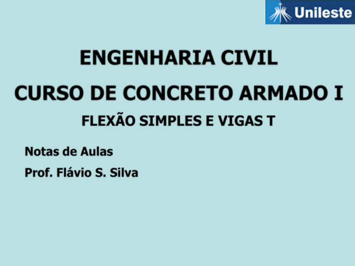 ENGENHARIA CIVIL CURSO DE CONCRETO ARMADO I FLEXÃO SIMPLES E VIGAS T BIBLIOGRAFIA ARAÚJO, José Milton; “Curso de concreto armado”, Volumes 1 e 2 Rio Grande do Sul, Editora DUNAS, 2ª Edição, 2003. Notas de Aulas Prof. Flávio S. Silva Durabilidade das estruturas de concreto Classes de agressividade ambiental em função das condições de exposição As exigências relativas à durabilidade destinam-se a garantir a conservação das características das estruturas ao longo de toda a sua vida útil. Durante este período não devem ser necessárias medidas extras de manutenção ou reparo das estruturas. Geralmente, as normas de projeto estabelecem um período de vida útil de 50 anos. Durabilidade das estruturas de concreto Classes de agressividade ambiental em função das condições de exposição Durabilidade das estruturas de concreto Propriedades do concreto em função da agressividade do ambiente Cobrimento nominal (cm) das armaduras para concreto armado Durabilidade das estruturas de concreto Limites de fissuração para peças de edifícios usuais Desde que não ultrapasse valores da ordem de 0,3 a 0,4 mm, as fissuras não tem importância significativa na evolução da corrosão das armaduras para estruturas de concreto armado. Podem ser adotados limites para a abertura das fissuras, em função da classe de agressividade ambiental: •Classe de agressividade I – abertura máxima de 0,4mm; •Classe de agressividade II – abertura máxima de 0,3mm; •Classe de agressividade III – abertura máxima de 0,2mm Fundamentos de segurança das estruturas de concreto armado Além dos aspectos econômicos e estéticos, uma estrutura de concreto armado deve ser projetada para atender aos seguintes requisitos de qualidade: 1. Segurança – Suportar as ações que lhe são impostas durante sua vida útil; 2. Bom desempenho em serviço – as deformações das estruturas e o grau de fissuração devem ser suficientemente pequenos para não afetar seu uso; 3. Durabilidade – As estruturas devem se manter em bom estado de conservação sob influencias ambientais previstas, sem necessidade de reparos de alto custo ao longo de sua vida útil. Fundamentos de segurança das estruturas de concreto armado Estados limite: 1. Estados limite últimos (ou de ruína) – São os relacionados ao colapso, ou qualquer outra forma de ruína estrutural, que determine a paralisação do uso da estrutura. deve-se verificar as estruturas de concreto armado em relação: • Ruptura ou deformação plástica; • Instabilidade do equilíbrio; • Perda de equilíbrio da estrutura; • Transformação da estrutura em um sistema hipostático. • custo de manutenção ao longo de sua vida útil. Fundamentos de segurança das estruturas de concreto armado Estados limite: 2. Estados limite de utilização (ou de serviço) – Correspondem aos estados em que a utilização da estrutura torna-se prejudicada por apresentar deformações excessivas (incluindo vibrações) ou por um nível de fissuração que comprometa a sua durabilidade. No projeto de estruturas usuais de concreto armado são considerados o estado limite de deformações e o estado limite de abertura de fissuras. Observa-se que o requisito de segurança das estruturas está relacionado com os estados limites últimos, enquanto a durabilidade, a aparência e o conforto estão ligados aos estados limites de utilização. Fundamentos de segurança das estruturas de concreto armado Procedimentos da NBR-6118: 1. Em seções parcialmente comprimidas, a deformação da borda comprimida ocorre quando atinge o valor 3,5‰; 2. Em seções totalmente comprimidas, a deformação da fibra situada a 3h/7 da borda mais comprimida atinge o valor de 2‰. Estes valores limites de deformação correspondem aos valores médios das deformações e0 e eu . 3. A deformação máxima de tração das armaduras é igual a 10‰, evitando-se deformações plásticas excessivas e incompatíveis com o conjunto concreto armado. Fundamentos de segurança das estruturas de concreto armado Situações de ruptura de uma seção de concreto armado submetida à flexão simples: Fundamentos de segurança das estruturas de concreto armado Ações nas estruturas – usualmente, as forças e as deformações são impostas pelas ações são consideradas como se fossem as próprias ações. Porém, de acordo com a NBR-8681, as forças são as designadas ações diretas e as deformações impostas por ações indiretas. Em função da variabilidade com o tempo, as ações são classificadas em: Ações Permanentes – aquelas que ocorrem com valor constante ou de pequena variação durante a vida útil da construção. • Diretas – peso próprio, alvenarias, revestimentos, peso de equipamentos fixos, empuxos de solos, etc. • Indiretas – recalques de apoio, retração e fluência do concreto, protensão, e imperfeições geométricas de pilares. Ações Variáveis – São as que ocorrem com valores que sofrem significativas variações durante a vida útil da construção. Considera-se as ações variáveis normais as que ocorrem nas estruturas como o peso de pessoas, móveis, veículos, forças de frenagem, impacto, centrífugas, efeitos do vento, variações de temperatura, etc As ações variáveis especiais tem-se as ações sísmicas ou algumas cargas acidentais de natureza ou intensidade especiais. Ações Excepcionais – são aquelas que têm uma duração muito curta e uma probabilidade de ocorrência muito pequena durante a vida da construção (explosões, choques de veículos, incendios, enchentes e sismos excepcionais. Fundamentos de segurança das estruturas de concreto armado Ações de Cálculo e combinações de ações As ações de cálculo Fd são obtidas multiplicando-se os seus valores característicos pelos coeficientes de segurança gf que para identificar o tipo de ação considerada será representado: gg – coeficiente de segurança para aç