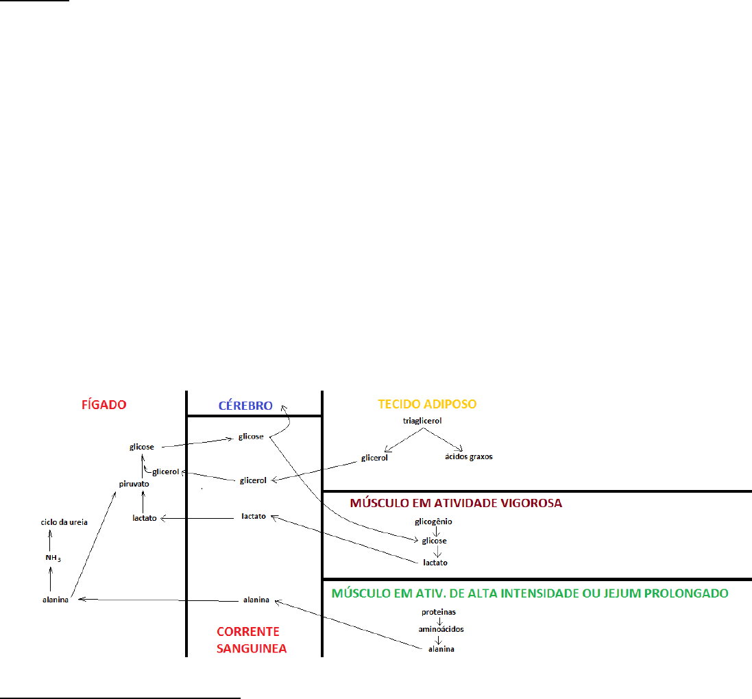 Gliconeogênese Definição: Síntese de glicose a partir de compostos que não são carboidratos/glicídios (“nova formação de açúcar) Ocorre no fígado Jejum prolongado: córtex renal Converte em glicose o piruvato e os compostos relacionados, com 3 e 4 carbonos. O substrato inicial da gliconeogênese é o piruvato, mas outros compostos de 3 e 4 carbonos vão ser transformados em piruvato para que aconteça a gliconeogênese Os precursores da gliconeogênese são glicerol, lactato e aminoácidos Aminoácidos formam glicose: todas exceto lisina e leucina Amino = ureia = tóxico Em situações de jejum o fígado fabrica glicose para enviar para o cérebro, que usa glicose mesmo quando o nível desta está baixo, e quem tem que mandar essa glicose para ele é o fígado por meio da gliconeogênese Durante o jejum, o glicogênio quebrado é o hepático, já o muscular é quebrado durante o exercício físico. Os glicogênios hepáticos e musculares são iguais, entretanto, a função do glicogênio hepático é manter a glicemia constante, já o muscular tem função de fornecer energia para o próprio músculo Quando o glicogênio é quebrado, tanto no fígado quanto no músculo, é formada a glicose-6-fosfato, mas como o fígado tem a glicose-6-fosfatase, é possível tirar o fosfato da glicose-6-fosfato e mandá-la para fora, já o músculo não tem essa enzima, então a glicose 6-fosfato fica presa na célula muscular Precursores para a gliconeogênese: Glicerol: Vem da quebra do triaglicerol no tecido adiposo O triaglicerol é formado por 3 ácidos graxos e 1 glicerol Esse glicerol é mandado para o fígado para ser transformado em piruvato para formar glicose em situação de jejum O ácido graxo vai sofrer β-oxidação gerando energia para o fígado O fígado está realizando uma via anabólica, gastando energia para produzir glicose e precisa de uma fonte de energia, que vai vir da β-oxidação dos ácidos graxos. Isto porque ele parou de usar glicose, uma vez que esta está em baixa quantidade. Aminoácidos: Vem da proteólise muscular, ou seja, a reserva muscular de proteínas. Essa proteína muscular é quebrada e os aminoácidos são enviados para o fígado, que o transformam em glicose Lactato: Em situação de exercício físico anaeróbico, o músculo precisa de energia e realiza fermentação, que tem como função reoxidar o NAD+ para ser usado na glicólise que, por sua vez, gera ATP O músculo está em exercício intenso, quebrando glicose, através da glicólise, e produzindo piruvato e formando lactato. Esse lactato vai para o fígado, onde será transformado em piruvato para dar início à gliconeogênese No músculo o piruvato vira lactato e no fígado o lactato vira piruvato Obs¹: O único que NÃO para de usar glicose mesmo quando seu nível está baixo é o cérebro Obs²: Em situação anaeróbica, a única fonte de energia da célula é a glicose, uma vez que a quebra de ácido graxo e aminoácidos para gerar energia dependem de oxigênio e ocorrem na mitocôndria. Já a glicólise não depende de oxigênio e ocorre no citosol Obs³: A fermentação lática NÃO tem a função de gerar ATP, sua função é transformar piruvato em lactato para regenerar o NAD+ para que a glicólise não pare de acontecer. Se não houvesse a fermentação, a glicólise pararia por falta de NAD+ pois ela consome NAD+ para formar NADH, logo o NAD+ precisa ser reposto Ciclo de Cori: Exercício físico Ocorre quando o músculo está em exercício intenso e encontra-se em situação anaeróbica e está gastando ATP, por isso, precisa gerar o ATP que ele mesmo vai gastar durante a contração muscular, quebrando sua reserva de glicogênio. Essa quebra gera glicose-6-fosfato. Como o músculo não tem glicose-6-fosfatase, essa glicose-6-fosfato permanece no músculo e entra na glicólise gerando ATP e lactato. Esse lactato é mandado para o fígado e usado como precursor para a gliconeogênese e vai formar glicose, que vai para a corrente sanguínea e será captada pelo músculo para se recuperar do exercício físico que gastou glicogênio. Jejum: No jejum, o músculo quebra proteína da reserva muscular e manda aminoácidos, principalmente alanina, para o fígado, onde serão transformados em piruvato, que vai ser utilizado na gliconeogênese Nessa situação, a glicose é enviada para o cérebro e não para o músculo Reações da gliconeogênese: A gliconeogênese é a “reversão” da glicólise mas não 100%, uma vez que 3 enzimas da glicólise são irreversíveis: a hexoquinase, PK1 e a piruvato quinase. Essas enzimas são importantes porque são irreversíveis e reguladoras, ou seja, ela regula uma via e quando ela está ativa a via também está. Deste modo, não ficam ativas ao mesmo tempo glicólise e gliconeogênese. Se ambas ocorressem ao mesmo tempo haveria um ciclo fútil em que se produz energia atoa. Geraria calor Essas enzimas atuam somente na via glicolítica e se elas forem ativadas, a via é ativada e se forem inibidas, a via é também inibida A gliconeogênese faz “supostamente” o caminho contrário da glicólise. Ela não pode usar as enzimas 1 (hexoquinase), 3 (PFK1) e 10 (piruvato quinase) É preciso desviar delas, ou seja, ter uma outra enzima que faça a reação contrária, já que essas enzimas são irreversíveis. As outras 7 enzimas da glicólise, que são reversíveis, vão trabalhar ao contrário, ou seja, tudo aquilo que elas produziam na glicólise, vão gastar na gliconeogênese. A gliconeogênese é a reversão da glicólise com 3 desvios: 1º desvio: 10ª reação da glicólise piruvato quinase 2º desvio: 3ª reação da glicólise PFK1 3ª desvio: 1ª reação da glicólise hexoquinase 1º desvio: A via pode começar pelo piruvato ou pelo lactato. Se começar pelo piruvato, há a formação de malato para sair da mitocôndria Se a via começar pelo piruvato (3C) , este entra na mitocôndria, ganha carbono, forma o oxaloacetato (4C) pe
