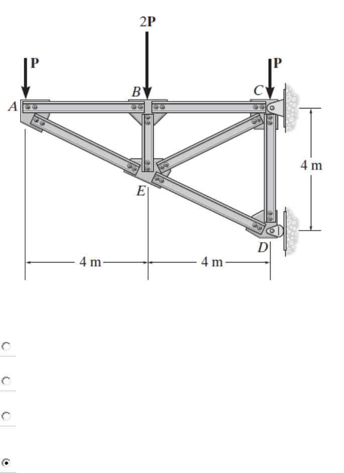 Questão 1/10 Determine a força máxima desenvolvida na treliça. Indique em qual membro esta força é desenvolvida, e se ela é de tração ou compressão. Considere cada nó como um pino. Faça P = 4 kN. A FAE=8,944 kN (C) B FBE=24 kN (C) C FEC=8,944 kN (T) D FED=17,89 kN (C) Você acertou! Questão 2/10 Determine a força máxima desenvolvida na treliça. Indique em qual membro esta força é desenvolvida e indique se o membro está sob tração ou compressão. Faça P = 4 kN. CERTA LETRA B A FAB=4,0 kN (C) B FBC=17,0 kN (C C FBD=20,50 kN (T) D FEB=9,192 kN (T) Questão 3/10 A treliça de ponte Howe está sujeita ao carregamento mostrado. Determine as forças nos membros HD e CD e indique se os membros estão sob tração ou compressão. A FCD=50 kN (T); FHD=14,14 kN (T) B FCD=25 kN (C); FHD=7,07 kN (T) C FCD=50 kN (T); FHD=7,07 kN (C) Você acertou! D FCD=25 kN (T); FHD=14,14 kN (C) Questão 4/10 Determine a força nos membros BC, CG e GF, da treliça Warren. Indique se os membros estão sob tração ou compressão. A FBC=5,60 kN (C); FCG=0,550 kN (T); FGF=3,15 kN (C); B FBC=5,40 kN (T); FCG=0,490 kN (C); FGF=7,65 kN (T); C FBC=6,80 kN (C); FCG=0,370 kN (T); FGF=9,18 kN (C); D FBC=7,70 kN (T); FCG=0,770 kN (C); FGF=8,08 kN (T); Você acertou! Questão 5/10 Determine a força normal interna, o esforço cortante e o momento no ponto F da viga. A NF=50 N;VF=284 N; MF=550 N.m; B NF=0;VF=215 N; MF=660 N.m; Você acertou! C NF=0 N;VF=312 N; MF=4400 N.m; D NF=50 N;VF=375 N; MF=690 N.m; Questão 6/10 Determine a força normal interna, o esforço cortante e o momento no ponto C da viga. A NC=0 kN;VC=16,25 kN; MF=52,5 kN.m; Você acertou! B NC=4 kN;VC=11,25 kN; MF=52,5 kN.m; C NC=0 kN;VC=32,50 kN; MF=51,7 kN.m; D NC=40 kN;VC=11,55 kN; MF=45,2 kN.m; Questão 7/10 Determine a força normal interna, o esforço cortante e o momento no ponto D da viga simplesmente apoiada. O ponto D está localizado à esquerda da força de 5 kN. A ND=9 kN;VD=0,75 kN; MD=6,55 kN.m; B ND=0 kN;VD=1,25 kN; MD=7,15 kN.m; C ND=0 kN;VD=1,75 kN; MD=9,75 kN.m; Você acertou! D ND=9 kN;VD=1,85 kN; MD=11,85 kN.m; Questão 8/10 Determine os diagramas de esforço cortante e de momento fletor para a viga. Qual o momento fletor máximo (em módulo) desenvolvido na viga? Faça P=4 kN, a=1,5 m e L=3,6 m. A M=3 kN.m B M=4 kN.m C M=5 kN.m D M=6 kN.m Você acertou! Questão 9/10 Determine os diagramas de esforço cortante e de momento fletor para a viga em balanço. Qual o momento fletor máximo (em módulo) desenvolvido na viga? A M=1,456 kN.m B M=2,681 kN.m C M=2,521 kN.m D M=2,795 kN.m Você acertou! Questão 10/10 Determine os diagramas de esforço cortante e de momento fletor para a viga simplesmente apoiada. Qual o momento fletor máximo (em módulo) desenvolvido na viga? A M=4 kN.m B M=5 kN.m C M=7 kN.m D M=6 kN.m Você acertou!