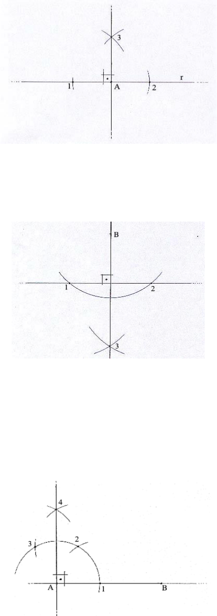TRAÇADO DE PERPENDICULARES a) Perpendicular que passa por um ponto qualquer, pertencente a uma reta. Seja a reta r e o ponto A, pertencente à mesma. 1) Centro (ponta seca do compasso) em A, abertura qualquer, cruza-se a reta com dois arcos, um para um lado e o outro para o outro lado, gerando os pontos 1 e 2. 2) Centro em 1 e 2 com a mesma abertura, suficiente para obter o cruzamento desses dois arcos, gerando o ponto 3. 3) A perpendicular será a reta que passa pelos pontos A e 3. b) Perpendicular que passa por um ponto não pertencente a uma reta. Seja a reta r e o ponto B, não pertencente à mesma 1) Centro em B, abertura qualquer, suficiente para traçar um arco que corte a reta em dois pontos: 1 e 2. 2) Centro em 1 e 2, com a mesma abertura, cruzam-se os arcos, obtendo-se o ponto 3. 3) A perpendicular é a reta que passa pelos pontos B e 3. c) Perpendicular que passa pela extremidade de um segmento de reta. 1º Método: Seja o segmento de reta AB 1) Centro em uma das extremidades, abertura qualquer, traça-se o arco que corta o segmento, gerando o ponto 1. 2) Com a mesma abertura, e com centro em 1, cruza-se o primeiro arco, obtendo-se o ponto 2. 3) Centro em 2, ainda com a mesma abertura, cruza-se o primeiro arco, obtendo-se o ponto 3. 4) Continuando com a mesma abertura, centra-se em 2 e 3, cruzando estes dois arcos e determinando o ponto 4. 5) Nossa perpendicular é a reta que passa pela extremidade escolhida e o ponto 4. 2º Método: Basta lembrar que todo segmento de reta é uma parte limitada de uma reta, que é infinita. Assim sendo, podemos prolongar o segmento em qualquer uma de suas extremidades, raciocinando-se então como se estivéssemos trabalhando com uma reta e a extremidade do segmento como um ponto que pertence a esta mesma reta, o que nos leva ao caso a ( perpendicular que passa por um ponto qualquer, pertencente a uma reta). d) Perpendicular que passa pelo ponto médio de um segmento de reta (Mediatriz) 1) Centro em uma das extremidades, com abertura maior que a metade do segmento, traça-se o arco que percorre as regiões acima e abaixo do segmento. 2) Com a mesma abertura, centra-se na outra extremidade e cruza-se com o primeiro arco, nos pontos 1 e 2. A Mediatriz é a reta que passa pelos pontos 1 e 2. TRAÇADO DE PARALELAS a) Caso geral: Paralela que passa por um ponto qualquer não pertencente a uma reta Sejam a reta r e o ponto E, fora da reta. 1) Centro em E, raio (abertura) qualquer, traça-se o arco que cruza a reta em 1. 2) Com a mesma abertura, inverte-se a posição, ou seja, centro em 1, raio 1E, traça-se o arco que vai cruzar a reta no ponto 2. Com a ponta seca do compasso em 2, faz-se abertura até E, medindo-se, portanto esse arco. 4) Transporta-se, então, a medida do arco 2E a partir de 1, sobre o primeiro arco traçado, obtendo-se o ponto 3. 5) Nossa paralela é a reta que passa pelos pontos 3 e E. Traçado de uma paralela a uma distância determinada de uma reta Neste caso, temos que primeiramente estabelecer a distância pretendida, o que equivale dizer que temos que determinar a menor distância entre as retas, então: 1) Por um ponto qualquer (A) da reta, levanta-se um perpendicular (vide o caso específico no estudo das perpendiculares). 2) Sobre a perpendicular mede-se a distância determinada (5 cm), a partir do ponto escolhido (A), obtendo-se o segmento de reta AB, igual a 5 cm. 3) Procede-se, então, como no caso anterior, pois temos, agora, uma reta e um ponto (B), fora desta, ou: 4) Se, pelo ponto B, traçarmos uma perpendicular à reta que contém esse segmento, ela será paralela à primeira reta. DIVISÃO DE UM SEGMENTO DE RETA EM PARTES IGUAIS Seja o segmento de reta AH. Vamos dividi-lo em 7 partes iguais. 1) Por uma das extremidades, traçamos uma reta com inclinação aproximada de 30°. 2) Atribui-se uma abertura no compasso e aplica-se essa distância sobre a reta inclinada o número de vezes em que vamos dividir o segmento (7 vezes). 3) Enumeramos as marcações de distâncias a partir da extremidade escolhida. 4) A última marcação (nº 7) é unida à outra extremidade. 5) Através do deslizamento de um esquadro sobre o outro, passando pelas demais divisões, mas sempre alinhado pela última divisão (no nosso exemplo a de nº 7), o segmento é dividido em partes iguais.