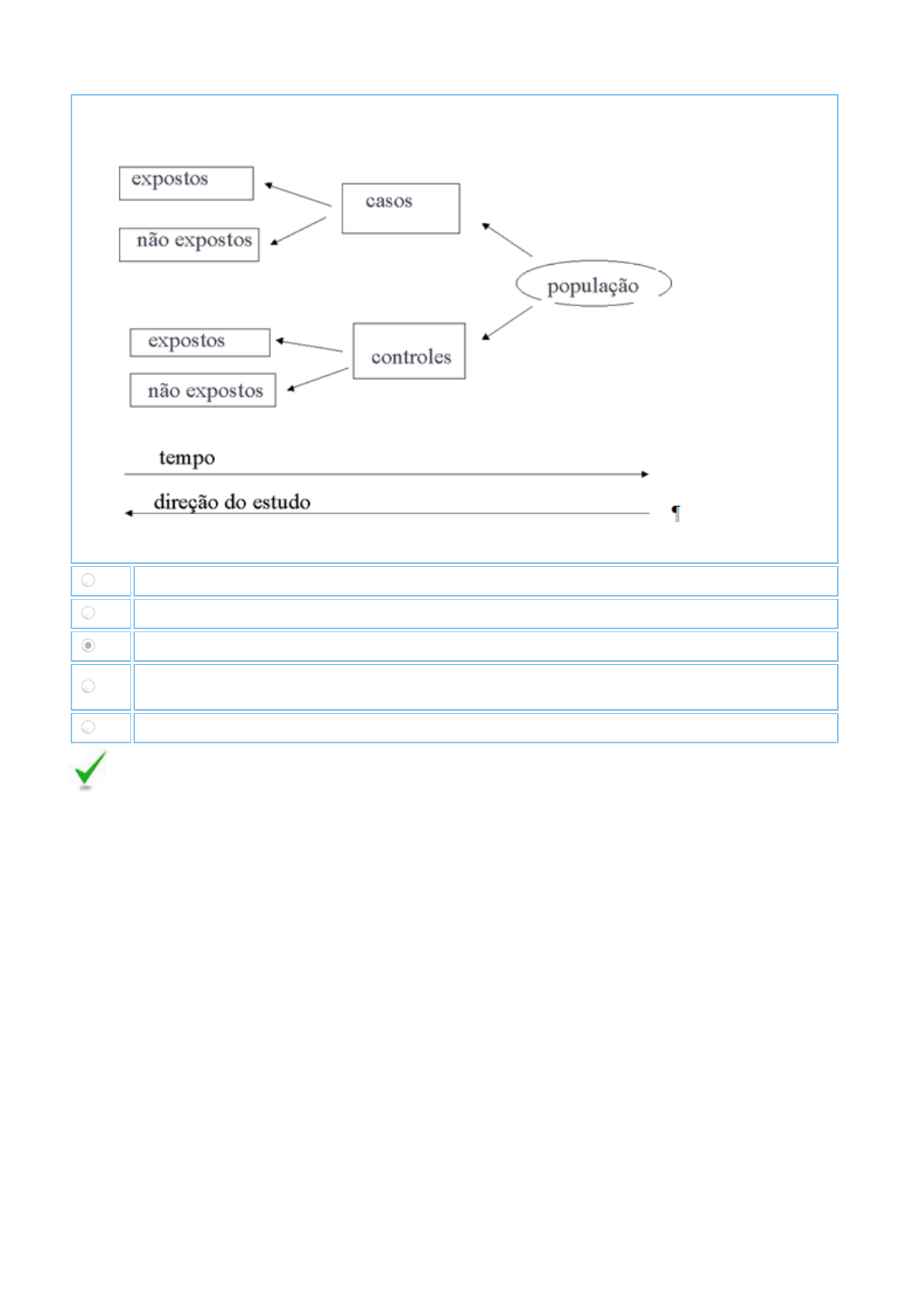 2017518 UNIP Universidade Paulista : DisciplinaOnline Sistemas de conteúdo online para Alunos. http://online.unip.br/disciplina/detalhes/6690 1/1 Estas são etapas de que delineamento epidemiológico? A Coorte B Intervenção C Casocontrole D Transversal E Ecológico Você já respondeu e acertou esse exercício. A resposta correta é: C.