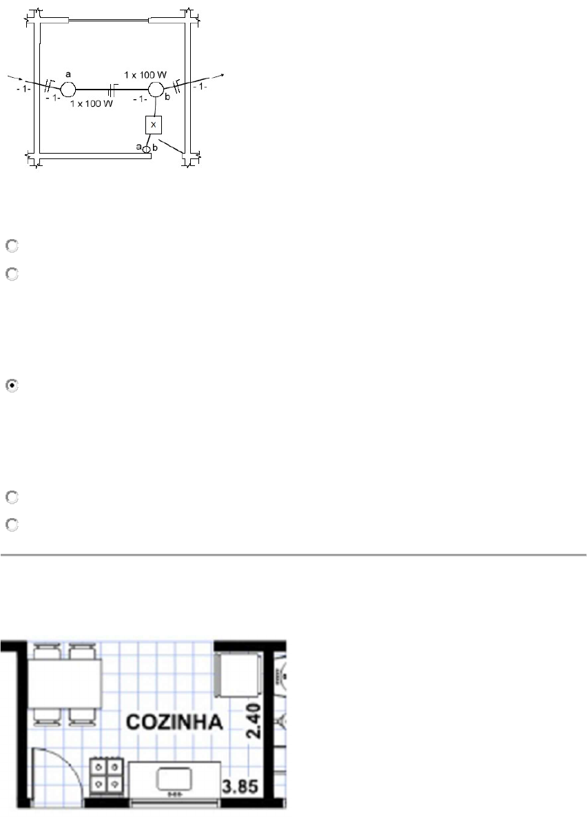 Questão 1/5 - Instalações Elétricas Analise o circuito da instalação elétrica da figura a seguir. Observe o eletroduto que desce para o interruptor; nele há um quadrado com um “X”. Esse “X” representa os condutores necessários para o correto funcionamento do circuito. Para esse funcionamento correto os condutores devem ser: Nota: 20.0 A Fase, neutro e retorno B Fase a, fase b e retorno C Fase, retorno a, retorno b Você acertou! O neutro nunca é interrompido e ele já está na caixa octogonal do teto. A fase desce ao interruptor de duas teclas e os dois retornos voltam para as lâmpadas “a” e “b”. Resposta: fase, retorno a, retorno b. D Fase a, fase b e neutro E Fase, neutro e condutor de proteção Questão 2/5 - Instalações Elétricas Para a cozinha apresentada a seguir calcule, segundo a norma NBR 5410:2004, o número mínimo de tomadas. Nota: 20.0 A 3 B 4 Você acertou! A norma determina que devemos ter uma tomada para cada 3,5 metros de perímetro ou fração. O perímetro da cozinha é: 2,40 m + 3,85 m + 2,40 m + 3,85 m. Logo o perímetro é de: 12,5 m. Então, o número de tomadas é de 12,5/3,5. O resultado da divisão é 3,57 o que nos leva a 4 tomadas. C 5 D 6 E 7 Questão 3/5 - Instalações Elétricas Verifique a simples instalação da iluminação da figura a seguir. Para os trechos de eletroduto X, Y e Z devemos respectivamente optar por qual das alternativas a seguir? Nota: 20.0 A B C D Você acertou! A fase desce para um dos interruptores paralelos (do ramo X por exemplo). Os retornos do primeiro interruptor vão ao outro interruptor. Logo passam pelo ramo Y e Z. O terceiro retorno volta do segundo interruptor paralelo passando por Z e Y. O neutro passa por Y para completar o circuito da luminária. E Questão 4/5 - Instalações Elétricas Para otimizarmos os recursos e não dimensionarmos toda a instalação elétrica em função da carga total instalada a NBR 5410:2004 prevê que devemos considerar “as possibilidades de não-simultaneidade de funcionamento destes equipamentos”. Para que isso ocorra devemos, como diz a norma, aplicar um: Nota: 20.0 A Fator de recurso B Fator de demanda Você acertou! C Fator de convergência D Fator de não simultaneidade coletiva E Fator diminutivo Questão 5/5 - Instalações Elétricas Para o quarto apresentado a seguir calcule, segundo a norma NBR 5410:2004, a potência demandada para a iluminação. Nota: 20.0 A 100 VA B 230VA C 340 VA D 460 VA Você acertou! A norma NBR 5410 nos determina 100 VA para os primeiros 6 m2; e 60 VA para os próximos 4 m2 inteiros. A área da suíte é: A= 7,1 m x 4,3 m A= 30,53 m2. Temos 100 VA para os primeiros 6 m2. Sobram 24,53 m2. Desses, temos 6 x 4m2 inteiros. Ou, 6 x 60 VA ou 360 VA. Somando com os primeiros 100 VA obtemos um total de 460 VA. E 520 VA