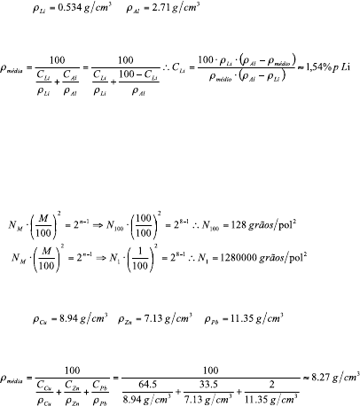 Unidade 03 - Exercício Extra 02 Data - 22/01/2014 DISCIPLINAS: ENG041 e ENG 360 Professor – Manuel de Almeida Barreto Filho Aluno - Assinatura _________________________________ 1 – Ligas alumínio-lítio foram desenvolvidas pela indústria aeronáutica para reduzir o peso e melhorar o desempenho de suas aeronaves. Deseja-se obter um material para a fuselagem de uma aeronave comercial que possua uma massa específica de 2.55 g/cm3. Calcule a concentração de Li (em %p) necessária. Dados: e Solução: 2 – Para um tamanho de grão ASTM igual a 8, quantos grãos devem existir aproximadamente em cada polegada quadrada: a) Para uma ampliação de 100X; b) Sem qualquer ampliação. Solução: a) b) 3 – Determine a massa específica aproximada de um latão com alto teor de chumbo que possui a composição de 64.5%p Cu, 33.5%p Zn e 2%p Pb. Dados: , e Solução: 4 – Para o alumínio, a capacidade calorífica a volume constante, Cv, a 30 K é de 0.81 [J/(mol.K)] e a temperatura de Debye é de 375 K. Estime o calor específico nas seguintes condições: a) 50 K; b) 425 K. Dados: e . Solução: a) b) Desde que , 5 – Um arame de cobre é esticado com uma tensão de 70 MPa a 20oC. Se o comprimento for mantido constante, até que temperatura o arame deverá ser aquecido para que a tensão seja reduzida para 35 MPa? Dados: Para o Cobre puro - e . Solução: