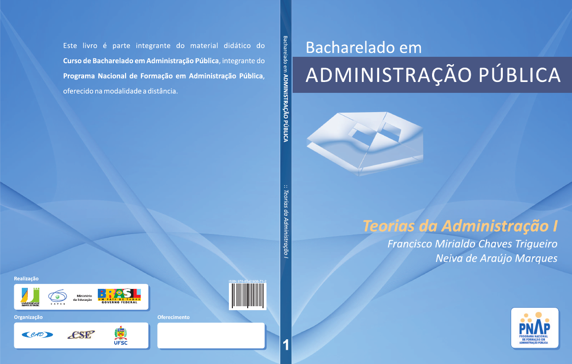 9 788561 608712 TEORIAS DA ADMINISTRAÇÃO I 2009 Francisco Mirialdo Chaves Trigueiro Neiva de Araújo Marques Ministério da Educação – MEC Coordenação de Aperfeiçoamento de Pessoal de Nível Superior – CAPES Diretoria de Educação a Distância – DED Universidade Aberta do Brasil – UAB Programa Nacional de Formação em Administração Pública – PNAP Bacharelado em Administração Pública T828t Trigueiro, Francisco Mirialdo Chaves Teorias da Administração I/ Francisco Mirialdo Chaves Trigueiro, Neiva de Araújo Marques. – Florianópolis : Departamento de Ciências da Administração / UFSC; [Brasília] : CAPES : UAB, 2009. 170p. : il. Inclui bibliografia Bacharelado em Administração Pública ISBN: 978-85-61608-71-2 1. Teoria da administração. 2. Administração de empresas. 3. Processo decisório. 4. Educação a distância. I. Marques, Neiva de Araújo. II. Coordenação de Aperfeiçoamento de Pessoal de Nível Superior (Brasil). III. Universidade Aberta do Brasil. IV. Título. CDU: 65.01 Catalogação na publicação por: Onélia Silva Guimarães CRB-14/071 © 2009. Universidade Federal de Santa Catarina – UFSC. Todos os direitos reservados. A responsabilidade pelo conteúdo e imagens desta obra é do(s) respectivos autor(es). O conteúdo desta obra foi licenciado temporária e gratuitamente para utilização no âmbito do Sistema Universidade Aberta do Brasil, através da UFSC. O leitor se compromete a utilizar o conteúdo desta obra para aprendizado pessoal, sendo que a reprodução e distribuição ficarão limitadas ao âmbito interno dos cursos. A citação desta obra em trabalhos acadêmicos e/ou profissionais poderá ser feita com indicação da fonte. A cópia desta obra sem autorização expressa ou com intuito de lucro constitui crime contra a propriedade intelectual, com sanções previstas no Código Penal, artigo 184, Parágrafos 1º ao 3º, sem prejuízo das sanções cíveis cabíveis à espécie. PRESIDENTE DA REPÚBLICA Luiz Inácio Lula da Silva MINISTRO DA EDUCAÇÃO Fernando Haddad PRESIDENTE DA CAPES Jorge Almeida Guimarães UNIVERSIDADE FEDERAL DE SANTA CATARINA REITOR Álvaro Toubes Prata VICE-REITOR Carlos Alberto Justo da Silva CENTRO SÓCIO-ECONÔMICO DIRETOR Ricardo José de Araújo Oliveira VICE-DIRETOR Alexandre Marino Costa DEPARTAMENTO DE CIÊNCIAS DA ADMINISTRAÇÃO CHEFE DO DEPARTAMENTO João Nilo Linhares SUBCHEFE DO DEPARTAMENTO Gilberto de Oliveira Moritz SECRETARIA DE EDUCAÇÃO A DISTÂNCIA SECRETÁRIO DE EDUCAÇÃO A DISTÂNCIA Carlos Eduardo Bielschowsky DIRETORIA DE EDUCAÇÃO A DISTÂNCIA DIRETOR DE EDUCAÇÃO A DISTÂNCIA Celso José da Costa COORDENAÇÃO GERAL DE ARTICULAÇÃO ACADÊMICA Nara Maria Pimentel COORDENAÇÃO GERAL DE SUPERVISÃO E FOMENTO Grace Tavares Vieira COORDENAÇÃO GERAL DE INFRAESTRUTURA DE POLOS Francisco das Chagas Miranda Silva COORDENAÇÃO GERAL DE POLÍTICAS DE INFORMAÇÃO Adi Balbinot Junior COMISSÃO DE AVALIAÇÃO E ACOMPANHAMENTO – PNAP Alexandre Marino Costa Claudinê Jordão de Carvalho Eliane Moreira Sá de Souza Marcos Tanure Sanabio Maria Aparecida da Silva Marina Isabel de Almeida Oreste Preti Teresa Cristina Janes Carneiro METODOLOGIA PARA EDUCAÇÃO A DISTÂNCIA Universidade Federal de Mato Grosso COORDENAÇÃO TÉCNICA – DED André Valente de Barros Barreto Soraya Matos de Vasconcelos Tatiane Michelon Tatiane Pacanaro Trinca AUTORES DO CONTEÚDO Francisco Mirialdo Chaves Trigueiro Neiva de Araújo Marques EQUIPE DE DESENVOLVIMENTO DE RECURSOS DIDÁTICOS CAD/UFSC Coordenador do Projeto Alexandre Marino Costa Coordenação de Produção de Recursos Didáticos Denise Aparecida Bunn Supervisão de Produção de Recursos Didáticos Flavia Maria de Oliveira Designer Instrucional Denise Aparecida Bunn Andreza Regina Lopes da Silva Supervisora Administrativa Erika Alessandra Salmeron Silva Capa Alexandre Noronha Ilustração Igor Baranenko Projeto Gráfico e Finalização Annye Cristiny Tessaro Editoração Rita Castelan Revisão Textual Sergio Meira Créditos da imagem da capa: extraída do banco de imagens Stock.xchng sob direitos livres para uso de imagem. PREFÁCIO Os dois principais desafios da atual idade na área educacional do país são a qualificação dos professores que atuam nas escolas de educação básica e a qualificação do quadro funcional atuante na gestão do Estado Brasileiro, nas várias instâncias administrativas. O Ministério da Educação está enfrentando o primeiro desafio através do Plano Nacional de Formação de Professores, que tem como objetivo qualificar mais de 300.000 professores em exercício nas escolas de ensino fundamental e médio, sendo metade desse esforço realizado pelo Sistema Universidade Aberta do Brasil (UAB). Em relação ao segundo desafio, o MEC, por meio da UAB/CAPES, lança o Programa Nacional de Formação em Administração Pública (PNAP). Esse Programa engloba um curso de bacharelado e três especializações (Gestão Pública, Gestão Pública Municipal e Gestão em Saúde) e visa colaborar com o esforço de qualificação dos gestores públicos brasileiros, com especial atenção no atendimento ao interior do país, através dos Polos da UAB. O PNAP é um Programa com características especiais. Em primeiro lugar, tal Programa surgiu do esforço e da reflexão de uma rede composta pela Escola Nacional de Administração Pública (ENAP), do Ministério do Planejamento, pelo Ministério da Saúde, pelo Conselho Federal de Administração, pela Secretaria de Educação a Distância (SEED) e por mais de 20 instituições públicas de ensino superior, vinculadas à UAB, que colaboraram na elaboração do Projeto Político Pedagógico dos cursos. Em segundo lugar, esse Projeto será aplicado por todas as instituições e pretende manter um padrão de qualidade em todo o país, mas abrindo margem para que cada Instituição, que ofertará os cursos, possa incluir assuntos em atendimento às diversidades econômicas e cu