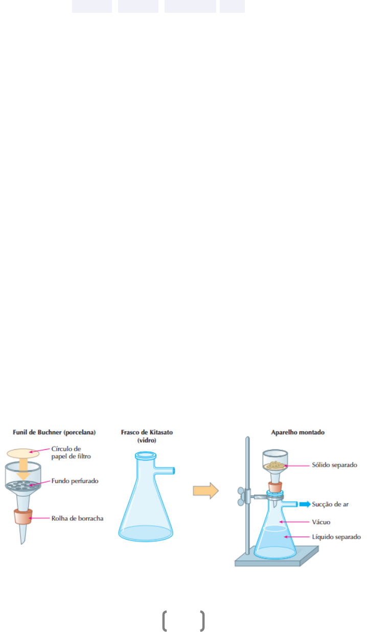 Relatório experimental Práticas de Química – QUI0446 PRÁTICA 2. TÉCNICAS DE SEPARAÇÃO DE MISTURAS Cristine Bolzan, Taciane Rech Universidade de Caxias do Sul Departamento de Química e Física � Introdução Uma mistura consiste em duas ou mais substancias puras que podem ser separadas por técnicas físicas. (Treichel; Treichel; Townsend,2016) Em algumas delas, as partículas que as compõem são tão grandes que é possível reconhecê-las com a ajuda de um microscópio óptico ou mesmo a olho nu. Essas colchas de retalhos de diferentes substâncias são chamadas de misturas heterogêneas. (ATKINS; JONES, 2012) Já em outras, as moléculas ou íons componentes estão tão bem dispersos que a composição é a mesma em toda a amostra, independentemente do seu tamanho. Essas misturas são chamadas de misturas homogêneas. (ATKINS; JONES, 2012) As misturas homogêneas são também chamadas de soluções. O componente da solução que está em maior quantidade é, em geral, chamado de solvente. As substâncias dissolvidas são chamadas de solutos. Na precipitação, o soluto se separa tão rapidamente da solução, que não há tempo para que se formem cristais simples. Em vez disso, o soluto forma um pó fino a que chamamos de precipitado. (ATKINS; JONES, 2012) Os produtos naturais, como as enzimas e as vitaminas, são quase sempre extraídos de misturas. Para analisar a composição de qualquer amostra que é supostamente uma mistura, é preciso separar seus componentes por métodos físicos e identificar cada substância presente. (ATKINS; JONES, 2012) A decantação aproveita a diferença de densidades. Um líquido que flutua sobre outro líquido ou está acima de um sólido pode ser decantado. (ATKINS; JONES, 2012) A filtração simples é usada para separar substâncias quando existem diferenças de solubilidade (a capacidade de se dissolver em um dado solvente). Agita-se a amostra com o solvente que, então, passa por uma malha fina, o filtro. Os componentes da mistura que são solúveis se dissolvem no líquido e passam pelo filtro, mas os componentes insolúveis ficam retidos. (ATKINS; JONES, 2012) Há casos em que a filtração é muito demorada. Para apressá-la, usa-se a filtração a “vácuo” ou, melhor dizendo, a filtração à pressão reduzida: (Feltre, 2004) Imagem 1 (Feltre, 2004) A dissolução fracionada é aplicável quando apenas um dos componentes da mistura é solúvel num dado líquido. Por exemplo, colocando-se uma mistura de sal comum e areia em água, o sal irá se dissolver, enquanto a areia não; por decantação, separamos a solução de sal e água da areia; e, por evaporação, recuperamos o sal. (Feltre, 2004) A sublimação é aplicável quando apenas um dos componentes da mistura é sublimável. É como se purifica o iodo: (Feltre, 2004) Imagem 2 (Feltre, 2004) A destilação é um processo físico que serve para desdobrar as misturas homogêneas, como as soluções de sólidos em líquidos (destilação simples) ou as soluções de dois ou mais líquidos (destilação fracionada). Em laboratório, a aparelhagem normalmente utilizada é a seguinte: (Feltre, 2004) Imagem 3 (Feltre, 2004) Quando destilamos dois líquidos miscíveis entre si, a separação tende a ser melhor quanto maior for a diferença entre as temperaturas de ebulição dos dois líquidos; nesse caso o líquido mais volátil destila em primeiro lugar. (Feltre, 2004) Objetivo Saber diferenciar os tipos de misturas, sendo elas heterogêneas ou homogêneas. Identificar os processos de separação de mistura e aplica-los. Relacionar os processos estudados com os tipos de misturas em que são utilizados. Procedimento experimental A) Filtração simples: dobramos corretamente o papel filtro retirando os pedaços que sobravam em relação ao diâmetro do mesmo, após pesamos exatos 0,1g de óxido de cálcio (CaO) em um papel encerado com o auxilio da balança analítica e transferimos o CaO para um copo de Becker de 150 ml. Em uma proveta medimos 50 ml de água destilada e adicionamos ao copo de Becker onde contem o CaO então mechemos ate dissolver a mistura. Montamos o suporte universal e fixamos a argola de suspenção para suspender o funil de vidro. Posicionamos o funil colocando o papel filtro corretamente e adicionamos uma pequena quantidade de agua destilada apenas para aderi-lo, em baixo do funil posicionamos um copo de Becker onde ficara o que será filtrado. Utilizamos 25 ml da mistura CaO com agua destilada, filtramos a mistura aonde observamos que o CaO ficou contido no papel filtro e a água destilada atravessou o papel. Após eliminamos o papel filtro com o conteúdo (CaO) no contêiner para resíduos sólidos perigosos, e o que restou de resíduo no copo de Becker adicionamos pequenos jatos de agua destilado e descartamos no contêiner 004. B) Filtração a vácuo: Montamos o funil de Buchner e Kitazato, onde pegamos a medida de seu diâmetro e cortamos o papel filtro com a medida exata do diâmetro, conectamos o kitazato a bomba de vácuo e ligamos a mesma, adicionamos o conteúdo de 25 ml de CaO e água destilada ao funil de Buchner , após a filtragem a substância CaO contida no papel filtro foi descartada no contêiner para resíduos sólidos perigosos, e o resíduo liquido foi descartado no contêiner 004. C) Decantação de uma mistura solido-liquido: em um copo de Becker (150 ml) adicionamos duas colheres de areia, após pegamos uma proveta aonde medimos exatos 50 ml de agua destilada e adicionamos ao copo de Becker onde obtém duas colheres de areia. Após obtermos a decantação aonde a areia se submete ao fundo do copo de Becker, transferimos a agua para um copo de Erlenmeyer (125 ml). A areia que ficou contida no copo de Becker foi descartada no lixo orgânico. D) Decantação de uma mistura líquido-líquido: No suporte universal colocamos uma argola de suspenção aonde apoiamos o funil de separação. Com o auxilio da pipeta e do bulbo pipetador, pi