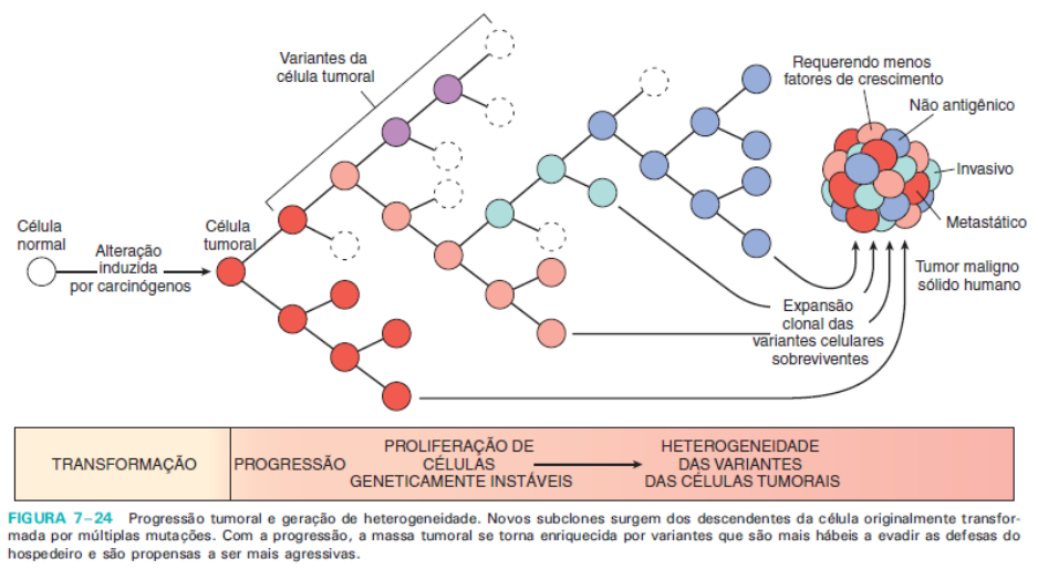 CARCINOGÊNESE (PROVA 3) As sete alterações-chave para a malignidade são as seguintes: Autossuficiência nos sinais de crescimento: Os tumores apresentam a capacidade de proliferação sem estímulos externos, em geral como consequência da ativação de oncogêneses. Insensibilidade aos sinais inibidores do crescimento: Os tumores podem não responder as moléculas que são inibidoras da proliferação de células normais, como o fator de crescimento transformador β (TGF-β) e inibidores diretos das cinases dependentes de ciclina (CDKI). Evasão da apoptose: Os tumores podem ser resistentes a morte celular programada, como consequência da inativação do p53 ou de ativação de genes antiapoptoticos. Potencial de replicação ilimitado: As células tumorais apresentam capacidade de proliferação sem restrições, evitando a senescência celular e a catástrofe mitótica. Angiogênese mantida: As células tumorais, assim como as células normais, não são capazes de crescer sem a formação de um suprimento vascular para trazer nutrientes e oxigênio e remover os produtos do catabolismo. Portanto, os tumores devem induzir a angiogênese. Capacidade de invadir e metastatizar: As metástases tumorais são a causa da grande maioria das mortes por câncer e dependem de processos que são intrínsecos a célula ou são iniciados por sinais do ambiente tecidual. Defeitos no reparo do DNA: Os tumores podem falhar em reparar ao dano ao DNA causado por carcinógenos ou causado durante a proliferação celular desregulada, levando a instabilidade genômica e a mutações em proto-oncogenes ou genes supressores de tumor. Um tumor é formado pela expansão clonal de uma única célula precursora que incorreu em lesão genética. Autossuficiência nos Sinais de Crescimento As células cancerosas utilizam uma série de estratégias para impulsionar sua proliferação e se tornar insensíveis aos reguladores do crescimento normal. Sob condições fisiológicas, a proliferação celular pode ser facilmente resolvida nas seguintes etapas: 1. Ligação de um fator de crescimento ao seu receptor específico na membrana celular. 2. Ativação transitória e limitada do receptor do fator de crescimento, que por sua vez ativas várias proteínas transdutoras de sinal no folheto interno da membrana plasmática. 3. Transmissão do sinal transduzido através do citosol para o núcleo por meio de segundos mensageiros ou de uma cascata de moléculas de transdução de sinal. 4. Indução e ativação de fatores reguladores nucleares que iniciam e regulam a transcrição do DNA. 5. Entrada e progressão da célula em um ciclo celular, acabando por resultar em divisão celular. Fatores de Crescimento Todas as células normais requerem estimulação por fator de crescimento para se submeter à proliferação. Normalmente, as células que produzem fator de crescimento não expressam o receptor cognato. Essa especificidade impede a formação de circuitos de feedback positivo dentro da mesma célula. - Muitas células cancerosas adquirem autossuficiência de crescimento pela aquisição da capacidade de sintetizar os mesmos fatores de crescimento aos quais são responsivas. - Outro mecanismo pelo qual as células cancerosas adquirem autossuficiência é por interação com o estroma. Em alguns casos, as células tumorais enviam sinais para ativar as células normais no estroma de suporte, o qual por sua vez produz fatores de crescimento que promovem o crescimento tumoral. Receptores do Fator de Crescimento e Tirosina Quinases Não Receptoras Proteínas receptoras mutantes liberam sinais mitogênicos contínuos para as células, mesmo na ausência do fator de crescimento no ambiente. Mutações mais comuns são as de superexpressão dos receptores do fator de crescimento, que podem tornar as células cancerosas hiper-responsivas a níveis do fator de crescimento que normalmente não deflagrariam a proliferação. Proteínas Transdutoras de Sinal a Jusante Um mecanismo relativamente comum, pelo qual as células cancerosas adquirem autonomia de crescimento, é o de mutações em genes codificadores de vários componentes das vias de sinalização a jusante dos receptores do fator de crescimento. Essas proteínas sinalizadoras acoplam-se ao fator de crescimento ativado e o transmitem ao núcleo, seja por meio de segundos mensageiros ou de cascata de fosforilação e ativação das moléculas de transdução de sinal. Fatores de Transcrição Nuclear Finalmente, todas as vias de transdução de sinal entram no núcleo e causam impacto sobre um grande banco de genes respondedores que orquestram o avanço ordenado das células através do ciclo mitótico. Proto-oncogenes: genes celulares normais cujos produtos promovem a proliferação celular. Oncogenes: versões mutantes ou suprexpressas de proto-oncogenes que funcionam de maneira autônoma sem necessidade de sinais promotores de crescimento normais. As oncoproteínas promovem a proliferação descontrolada de células por meio de vários mecanismos: • Expressão independente de estímulo do fator de crescimento e de seu receptor, estabelecendo um circuito autócrino de proliferação celular. Receptor PDGF-PDGF em tumores cerebrais. • Mutações em genes codificadores dos receptores do fator de crescimento ou tirosinas quinases que levam à sinalização constitutiva. Membro da família de receptor EGF, incluindo HER2/NEU (mama, pulmão e outros tumores). A fusão da tirosina quinase ABL com a proteína BCR em certas leucemias gera uma proteína híbrida com atividade de quinase constitutiva. • Mutações em genes codificadores das moléculas de sinalização. RAS geralmente sofrem mutação nos cânceres humanos e normalmente oscilam entre um estado de repouso ligado à GDP e um estado ativo ligado à GTP; as mutações bloqueiam a hidrólise de GTP para GDP, levando à sinalização não verificada. • Superprodução ou atividade desregulada dos fatores de