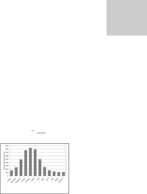 Hidrologia Estatística s variáveis hidrológicas como chuva e vazão têm como característica básica uma grande variabilidade no tempo. Para analisar a vazão de um rio ou a precipitação em um local ou região, incluindo a sua variabilidade temporal, é necessário utilizar alguns valores estatísticos que resumem, em grande parte, o comportamento hidrológico do rio ou da bacia. Entre as estatísticas mais importantes estão a média, a média mensal, a variância, os mínimos e máximos. A média A vazão ou precipitação média é a média de toda a série de vazões ou precipitações registradas, e é muito importante na avaliação da disponibilidade hídrica total de uma bacia. n x x n i i∑ = = 1 A vazão média específica é a vazão média dividida pela área de drenagem da bacia. As vazões médias mensais representam o valor médio da vazão para cada mês do ano, e são importantes para analisar a sazonalidade de um rio. A figura ao lado apresenta um gráfico das vazões médias mensais do rio Cuiabá na seção da cidade de Cuiabá, com base nos dados de 1967 a 1999. Capítulo 14 A Figura 14. 1 : Vazões médias por mês do ano no rio Cuiabá, em Cuiabá. I N T R O D U Z I N D O H I D R O L O G I A 162 Observa-se nesta figura que há uma sazonalidade marcada, com estiagem no inverno e vazões altas no verão. As maiores vazões mensais médias ocorrem em Fevereiro e as menores em Agosto, o que é conseqüência direta da sazonalidade das chuvas, que ocorrem de forma concentrada no período de verão. A mediana A mediana é o valor que é superado em 50% dos pontos da amostra. A média e a mediana podem ter valores relativamente próximos, porém não iguais. A mediana pode ser obtida organizando os n valores xi da amostra em ordem crescente. Sendo kx com k = 1 a n, os valores de x organizados em ordem decrescente, a mediana é obtida por: pxMediana = com 12 1 + − = np se n for ímpar; e 2 1++ = pp xxMediana se n for par. O desvio padrão O desvio padrão é uma medida de dispersão dos valores de uma amostra em torno da média. O desvio padrão é dado por: ( ) 1 1 2 − − = ∑ = n xx s n i i o quadrado do desvio padrão s2 é chamada variância da amostra. O coeficiente de variação O coeficiente de variação é uma relação entre o desvio padrão e a média. O coeficiente de variação é uma medida da variabilidade dos valores em torno da média, relativamente à própria média. I N T R O D U Z I N D O H I D R O L O G I A 163 x s cv = EXEMP LO 1) O seguinte conjunto de valores apresenta a chuva anual ocorrida em uma cidade ao longo de 30 anos. Calcule a média, o desvio padrão e o coeficiente de variação destes dados. ano P (mm) ano P (mm) ano P (mm) 1954 1671 1964 2024 1974 1357 1955 1485 1965 1305 1975 2023 1956 1766 1966 1644 1976 1390 1957 1565 1967 1908 1977 1641 1958 2082 1968 1913 1978 1585 1959 1370 1969 1485 1979 1526 1960 1926 1970 1693 1980 1962 1961 2042 1971 1313 1981 1672 1962 1691 1972 1567 1982 1404 1963 1491 1973 1493 1983 1352 A média é de 1645,1 mm por ano, o desvio padrão é de 241,9 mm por ano e o coeficiente de variação é de 0,15. O coeficiente de assimetria O coeficiente de assimetria é um valor que caracteriza o quanto uma amostra de dados é assimétrica com relação à média. Uma amostra é simétrica com relação à média se o histograma dos dados revela o mesmo comportamento de ambos os lados da média. ( ) 3 n 1i 3 i sn xx G ⋅ − = ∑ = A assimetria é chamada positiva quando o valor de G é positivo e a assimetria é negativa quando o valor de G é negativo. Algumas variáveis importantes na hidrologia, como as vazões máximas anuais em rios, apresentam uma assimetria positiva. I N T R O D U Z I N D O H I D R O L O G I A 164 Assimetria Valor de G Exemplo de histograma Nula 0 ou próximo de zero Positiva G > 0 Negativa G < 0 O cálculo da assimetria de uma amostra é um pouco mais complexo do que o da média e do desvio padrão. A maior parte das calculadoras simples não permite calcular diretamente o coeficiente de assimetria. No programa Excel a função chamada “Distorção” permite calcular o coeficiente de assimetria. Quartis e quantis Quantis separam a amostra de forma semelhante à mediana, porém em intervalos diferentes. Enquanto a mediana separa a amostra em dois grupos, com 50% dos dados com valores inferiores e 50% dos dados com valores superiores à mediana, os quartis e os quantis divdem a amostra em grupos de tamanhos diferentes. O primeiro Quartil é o valor que separa a amostra em dois grupos em que 25% dos pontos tem valor inferior ao quartil e 75% tem valor superior ao quartil. O terceiro Quartil é o valor que separa a amostra em dois grupos em que 75% dos pontos tem valor inferior ao quartil e 25% tem valor superior ao quartil. Já o segundo quartil é a própria mediana. Além dos três quartis, que separam a amostra em quatro, podem ser definidos quantis arbitrários, que dividem a amostra arbitrariamente em frações diferentes. Por exemplo, I N T R O D U Z I N D O H I D R O L O G I A 165 o quantil 90 % divide a amostra em dois grupos. O primeiro (90% dos dados) tem valores inferiores ao quantil 90% e o segundo (10% dos dados) tem valores superiores ao quantil 90%. A curva de permanência A elaboração da curva de permanência é uma das análises estatísticas mais simples e mais importantes na hidrologia. A curva de permanência auxilia na análise dos dados de vazão com relação a perguntas como as destacadas a seguir. • O rio tem uma vazão aproximadamente constante ou extremamente variável entre os extremos máximo e mínimo? • Qual é a porcentagem do tempo em que o rio apresenta vazões em determinada faixa? • Qual é a porcentagem do tempo em que um rio tem vazão suficiente para atender determinada demanda? A curva de permanência expressa a relação entre a vazão e a freqüência com que esta vazão é superada ou igualada. A curva de permanência pode ser