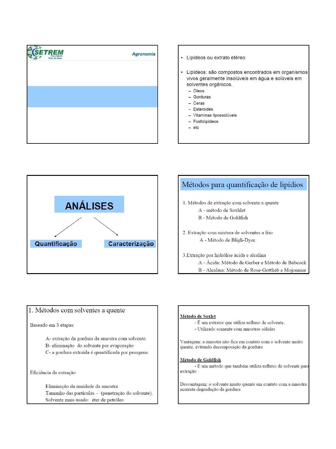 15/05/2011 1 Determinação de Gordura Bruta ou do Extrato Etéreo. Prof. Ana Paula Cecatto Mestranda em Agronomia 15/05/2011 2 15/05/2011 3 Determinação do Nitrogênio Total e da Proteína Bruta. 15/05/2011 4 Nos alimentos, além da função nutricional, as proteínas têm propriedades organolépticas e de textura. Podem vir combinados com lipídios e carboidratos. Origem vegetal Arroz integral 7,5% - 9,0% Arroz polido 5,2% - 7,6% Farinha de trigo 9,8% - 13,5% Milho 7,0% - 9,4% Soja 33% - 42% Amendoim 25% - 28% batata 10% - 13% maçã 0,3% 15/05/2011 5 15/05/2011 6 Determinação de Carboidratos 15/05/2011 7 Os carboidratos são os componentes mais abundantes e amplamente distribuídos entre os alimentos. Sua determinação nos alimentos é importante porque eles têm várias funções: 1. Nutricional 2. Adoçantes naturais 3. Matéria-prima para produtos fermentados 4. Principal ingrediente dos cereais 5. Propriedades reológicas das maioria dos alimentos de origem vegetal (polissacarídeos) 6. Responsáveis pela reação de escurecimento em muitos alimentos. 15/05/2011 8 Nas tabelas de composição de alimentos, o conteúdo em carboidratos tem sido dado como carboidratos totais pela diferença, isto é, a porcentagem de água, proteína, gordura e cinza subtraída de 100. Tabela de conteúdo de carboidratos nos alimentos Frutas 6% - 12% de sacarose Milho e batata 15% de amido Trigo 60% de amido Farinha de trigo 70% de amido Condimentos 9 % - 39% de açúcares redutores Açúcar branco comercial 99,5% de sacarose Açúcar de milho 87,5% de glicose mel 75% de açúcares redutores 15/05/2011 9 REFERÊNCIAS SILVA, D. J.; QUEIROZ, A. C. Análise de alimentos: métodos químicos e biológicos. 3ª Edição. Editora UFV, 2006. 235p. CECCHI, H. M. Fundamentos teóricos e práticos em análise de alimentos. 2.ed.rev. Campinas-SP: Editora da UNICAMP, 2003. 207p. OLIVEIRA, F.C. Bromatologia para o curso de Farmácia. Material didático. Porto Alegre: UFRGS, 2010.