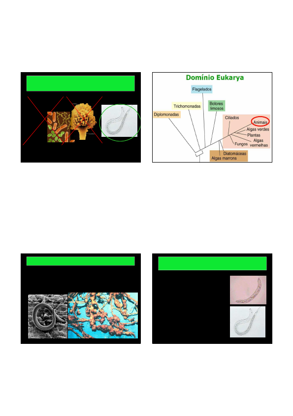 24/9/2013 1 MICROBIOLOGIA Bacteriologia Micologia Nematologia • Conceito • Do grego nema = fio, agulha e • oid =semelhante, parecido, forma NEMATÓIDES • São VERMES de corpo cilíndrico • Geralmente esguios e alongados • Afilando-se de modo gradual ou abrupto nas extremidades anterior e posterior. NEMATÓIDES 24/9/2013 2 • Características • Apresentam simetria bilateral • Ausência de segmentação • Transparentes • Não apresentam aparelho circulatório e respiratório NEMATÓIDES NEMATÓIDES Sistema reprodutor São dióicos - os sexos se encontram separados em indivíduos diferentes • Freqüentemente mostram dimorfismo sexual (machos menores do que as fêmeas) • Sistema Digestivo • Apresentam tubo digestivo completo: • cavidade oral, esôfago, intestino e ânus • Boca apresenta 6 lábios que podem estar fundidos em pares • Algumas espécies têm somente 2 lábios ou NENHUM • Pode apresentar dentes ou lâminas • Papilas sensoriais NEMATÓIDES 24/9/2013 3 Alimentação NEMATÓIDES • Fitoparasitas tem a região labial indivisa, por fusão completa dos lábios →Todos têm ESTILETE. • Estruturas móveis (estiletes) ou imóveis • (dentes) • Nematóides predadores: dentes, dentículos, placas cortantes • Bacteriófagos (Rhabditis): cavidade bucal cilíndrica, estreita e não armada NEMATÓIDES • Vida livre PREDADORES NEMATÓIDESNEMATÓIDES Alimentam-se de microrganismos �Micófagos �Protozoófagos �Nematófagos Mononchus sp. predando outro nematóide. 24/9/2013 4 • FITOPARASITAS • Órgãos subterrâneos → raízes, rizomas, tubérculos, bulbos, • Órgãos aéreos → caules, folhas, flores, frutos, sementes NEMATÓIDES • Parasitas de plantas se alimentam de plantas vasculares utilizando um estilete • Envolve os gêneros • Meloidogyne • Heterodera • Pratylenchus • Rotylenchulus • Globodera • Bursaphelenchu • Radopholus, entre outros. NEMATÓIDES 24/9/2013 5 • ZOOPARASITAS • Invertebrados • Vertebrados parasita do intestino delgado de ruminantes NEMATÓIDES • Nematóides parasitas de plantas apresentam em geral sexos separados → macho e a fêmea. • Apesar disso, a reprodução pode ser sexuada ou não NEMATÓIDES • Características • Freqüentemente apresentam dimorfismo sexual • Fêmeas podem ser maiores ou em formato de pêra ou saco = perda da capacidade locomotora = sedentárias NEMATÓIDES • Características • Diversidade morfológica a) Tretameres b) Rhabtidis (bacteriófago) c) Criconemoides d) Draconema e) Bunonema NEMATÓIDES 24/9/2013 6 • O tamanho é muito variável. • Medem de 0,3 a 3,0 mm de comprimento • Os que vivem no solo e nas águas→ de vida livre (comedores de algas, fungos, bactérias) • Os que se especializaram em parasitar as plantas, ocorrendo principalmente associados às raízes destas NEMATÓIDES • Podem medir de 0,3 mm a 15 cm • os que se especializaram no parasitismo de animais, vertebrados ou invertebrados, como na lombriga intestinal do homem, Ascaris lumbricoides • Podem atingir até 8 metros • Como por exemplo Placentonema gigantissima, parasito da baleia de espermacete. NEMATÓIDES • Vivem em quaisquer ambientes / ecossistemas onde exista ÁGUA • São geralmente sensíveis a fortes estresses hídricos. • Algumas spp. desenvolveram a habilidade de suportar ambientes com baixa umidade por meses ou anos, como o interior de sementes de plantas mantidas armazenadas. NEMATÓIDES • OCORREM • na água salgada • na água doce • no vinagre • no solo • em órgãos vegetais →raízes, tubérculos, caule, folhas, sementes • tecidos de diferentes tipos de animais. NEMATÓIDES 24/9/2013 7 • Têm o ciclo de vida relativamente simples constituído por: • ovo • quatro estágios larvais ou juvenis • estágio adulto NEMATÓIDES Estágio de desenvolvimento do ovo A. Ovo em estágio de mórula B. Ovo em desenvolvimento embrionado C. Ovo embrionado D. Larva em início de eclosão CICLO DE VIDA • Possui seis fases: • Ovo • Quatro fases juvenis • Adulto → macho ou fêmea • O nematóide que sai do ovo está em fase juvenil e movimenta-se no solo em direção à planta, na maioria das vezes, as raízes, onde vai se alimentar. NEMATÓIDES CICLO DE VIDA NEMATÓIDES 24/9/2013 8 Estágios de desenvolvimento do ovo J 1 1ª ecdise J 2 J2 Adulto • Ciclo de vida de Meloidogyne hapla em morangueiro NEMATÓIDES Ciclo de vida típico de um nematóide parasito de plantas 24/9/2013 9 • Em condições favoráveis, o ciclo completo geralmente ocorre em 30 a 40 dias • pode variar, dependendo • do nematóide • da planta hospedeira • de fatores ambientais, como a temperatura NEMATÓIDES SINTOMAS EM RELAÇÃO À PLANTA •Ação tóxica: bulbos produzem saliva (que é excretado pelo estilete) provocando reações •Ação espoliadora: desvia parte da alimentação que serviria para a planta como reserva •Ação traumática: ferimentos nas paredes da célula (parasitismo=introdução do estilete) • PARASITISMO NEMATÓIDES •Ectoparasita: o corpo fica do lado de fora e apenas o estilete é introduzido •Endoparasita: todo corpo é introduzido nos órgãos parasitados • Os sedentários vão ficando com o corpo muito volumoso quando começam a se alimentar e não conseguem mais sair do local onde parasitam. • Os migradores mantêm o corpo esbelto, alongado, e podem sempre mudar de lugar NEMATÓIDES 24/9/2013 10 • Migradores NEMATÓIDES Radopholus similis - cavernicola Pratylenchus sp. • Sedentário NEMATÓIDES
