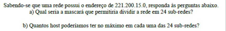 A rede IP 210.106.14.0 tem seu endereço usando uma máscara /24. Quantos endereços de redes e host utilizáveis podem ser obtidos? Considere um rede de classe C, e a necessidade de uma empresa de dez subnets. Considere que o administrador deseja ter muitos endereços disponíveis para hosts tantos quantos forem possíveis. Qual das máscaras de subnet seguintes deveria ser usada? Assumindo que um servidor DHCP está configurado para utilizar o IP 200.100.50.1 e distribuir IPs para, no máximo, 50 Hosts, qual máscara deverá da melhor forma possível ser atribuída à essa rede? Vocẽ foi contratado por uma empresa que recebeu de um ISP de nível 1 um o seguinte endereço IP 200.23.16.0, qual seria a melhor maneira de dividir esse bloco em sub-redes iguais sendo que a empresa necessita de redes com 100 host cada. Uma interface de roteador recebeu o endereço IP 172.13.190.166 com a máscara 255.255.255.248. A qual sub-rede o endereço IP pertence? Uma empresa fabricante de sapatos resolveu interligar suas filiais, de São Paulo, Curitiba, Brasília e uma última em Franca. Comprou SOMENTE o endereço IP 210.20.30.40. Pede-se: 1) Quais os endereços de Rede de cada UMA das sub-redes ? 2) Qual a máscara de sub-rede utilizada ? 3) Em que sub-rede estará o endereço IP 210.20.30.178, pertencente ao Diretor ? 4) Você como Analista de Suporte da Empresa GURUGONET, foi consultado para especificar uma máscara de sub-rede, para Rede de Passagem (entre o Firewall e o Roteador) desta empresa, utilizando um outro endereço IP, onde poderão existir no MÁXIMO 2 Hosts. Qual será esta máscara de sub-rede ? O endereço de broadcast para a rede classe C 192.168.20.0 ==> Sabendo-se que uma rede possui o endereço de 221.200.15.0, responda às perguntas abaixo: a. Qual seria a máscara que permitiria dividir a rede de forma que cada sub-rede tivesse que ter 26 hosts? b. Em quantas sub-redes a rede poderia ser dividida?