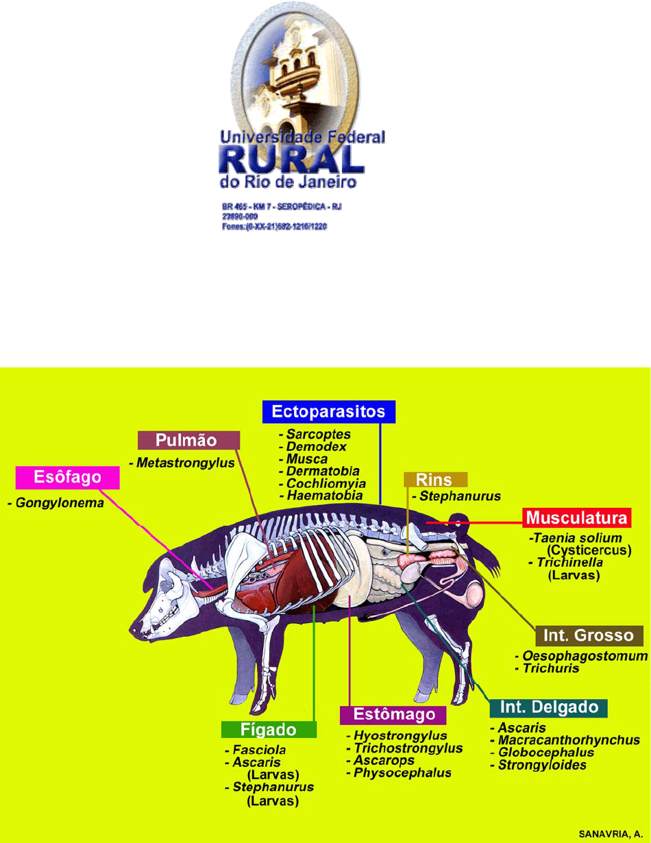 HELMINTOSES DE SUÍNOS PROF. ARGEMIRO SANAVRIA - IV 105 - DOENÇAS PARASITÁRIAS -UFRRJ.2006 sanavria@ufrrj.br HELMINTOSES DE SUÍNOS PROF. ARGEMIRO SANAVRIA - IV 105 - DOENÇAS PARASITÁRIAS -UFRRJ.2006 sanavria@ufrrj.br Espécies Localização Forma cor e comprimento Prevalênci a Sinais clínicos Metastrongylus spp Brônquios traquéias Linha grossa branco Machos : 1,5 - 2,0 cm Fêmeas : 3,3 - 4,5 cm Jovens (4 a 6 meses) Respiratórios,Hemorragias alvéolos,atelectasia.Bronquites (tosse, Pneumonias) enfizema Crescimento retardado Hyostrongilus rubidus Estômago Pequena linha vermelha Macho: 0,4-0,7 cm Adultos > 6m Gastrite difteróide hipertrófica Anemia, anorexia, emaciação, desidratação, perda de peso. Arduenna spp. Estômago Cordão branco Macho: 1,0 -1,5 cm Fêmea 1,6 - 2,2 cm. Jovens Anorexia ,Emaciação Ascaris suum (*) Intestino Delgado Redonda branco rosada Macho 20 - 25 cm Fêmea : 15 - 18 cm Jovens (5 sem- 6 meses) Gastricos, Hepatites traumáticas Trófico(perda de pêlos Nervosos (Epilepsias (Tossse,Pneumonias) Enfizema,Crescimento retardado Strongyloides ransoni Intestino Delgado Pequena linha fina Machos Não parasitam Fêmeas ), 0,35 - 0.4 cm Leitões (2-3 semanas) Anorexia, Diarréias, Crescimento retardado.Hemorragias petequiais nos pulmões,coração,intestinais. Macracanthorhynchus hirudinaceus Intestino Delgado Alongados e cilindricos brancos Machos: 5 - 1) cm Fêmeas 2) - 35 cm Adultos Gastricos (dores abdominais agudas.Emaciação, Anêmicos com diarréias Oesophagostomum spp Intestino Grosso Forma de cordão Branco rosado Machos : 0,8 - 1,0 cm Adultos > 6m Gástricos (Fezes diarréicas ou sanguinolentas).Lesões nodulares no intestino grosso. Trichuris suis Intestino Grosso Chicote, Branco Machos: 3,5 - 5,0 cm Fêmeas: 3,0 - 5,0 cm Jovens (5-6 meses) Anemia,Diarréias,Emagrecim ento.Erosões mucosa cecal. Tiflite fibrino ulcerativa. Stephanurus dentatus Tecido renal e peri- renal Cordão grosso,castanho vermelha Machos : 3,4 -4,0 cm Fêmeas: 3,4 - 4,0 cm Adultos Fibrose portal.Ascite.Destruição de tecido peri-renal.Dificuldade de monta,Dificuldade locomotora, Paresia do trem posterior.Crescimento retardado Cysticercus cellulosae *(Forma larval de Taenia solium que parasita o homem ) Músculos,coração,lingu a,diafragma e outros Vesicular Semi- transparente 1,3 cm de comprimento 0,7 cm de largura Adultos Não apresenta sintomas clínicos Cysticercus tenuicollis (Forma larval de Taenia hydatigena que é um cestoda de cão e carnívoros) Superfície do fígado e orgãos da cavidade abdominal Vesicular Semi- transparente 5,7 cm em diâmetro Adultos Não apresenta sintomas clínicos Cisto hidático(*) (Forma larval de Echinococcus granulosos que é um cestoda de cão e carnívoros) Fígado, pulmão e rim Forma vesicular. Tamanho variável 1 a 15 cm Adultos Não apresenta sintomas clínicos Trichinella spiralls(*) (larvas) Adultos parasitam o intestino delgado do homem, suínos,ovinos e ratos Músculos da parede do intestino delgado Larvas encistadas medem 1mm de comprimento no músculo Adultos Não apresenta sintomas clínicos (*) zoonoses transmitidas ao homem DOENÇAS PARASITÁRIAS PROF. ARGEMIRO SANAVRIA - IV 105 - DOENÇAS PARASITÁRIAS -UFRRJ.2006 sanavria@ufrrj.br + Menos importância; ++ Importante; (*)++ Quando os animais tiverem acesso ao pasto. +++StrongyloidesransomiVerme fino +0 0 Trichuris suis Verme chicote +/-+/-++(*)Oesophagostomumdentatum Verme nodular 0 0 ++(*)Hyostrongylusrubidus Verme vermelho do estômago +++++Ascaris suumAscaris EngordaLeitões Porcas Nome científico Nome comum Importância da parasitose em diferentes categorias Importância da parasitose em diferentes categorias DOENÇCAS PARASITÁRIAS-UFRRJ PROF.DR. ARGEMIRO SANAVRIA -2006 sanavria@ufrrj.br HELMINTOSES DE SUÍNOS Ascaris suum Os efeitos patológicos das infecções por Ascaris suum adultos no intestino delgado são menos dramáticos que os das migrações larvais, mas eles são indubitavelmente significativos. Pode haver diarréia, mas o efeito mais importante é a interferência com a nutrição apropriada e o crescimento normal. Porcos maciçamente infectados não geram ganhos economicamente lucrativos. Acidentes bizarros ocasionais, como a oclusão do ducto biliar ou a perfuração da parede intestinal, resultaram da tendência dos ascarídeos em deambular.O diagnóstico da ascaridiose clínica freqüentemente depende de achados clínicos e de necrópsia, porque os principais eventos patológicos ocorrem durante o estágio prepatente. Sinais clínicos de severa angústica respiratória em um grupo de porcos em crescimento, e a decoberta de extensas hemorragias pulmonares petequiais e equimóticas, além de edema, contribuem para o diagnóstico de ascaridose. Pedaços de tecido pulmonar devem ser fatiados e colocados num aparelho de Baermann, para demonstração das larvas migrantes. Os casos menos agudos são distinguidos por angústia respiratória, desnutrição em graus variáveis e lesões de pneumonia intersticial. A ascaridose crônica caracteriza-se por definhamento e emaciação, uma copiosa eliminação de ovos de Ascaris suum nas fezes, e lesões de pneumonia intersticial crônica e fibrose hepática; tais suínos são inaproveitáveis, sob o ponto de vista econômico. Medicação Anti-helmíntica - Ascaris suum, o nematódeo economicamente mais importante dos suínos, continua a ameaçar a indústria de suínos, a despeito de má suscetibilidade às piperazinas, higromicina B, diclorvós, fenbendazole, levamisole e tartarato de pirantel. É óbvio que apenas as drogas não têm sucesso no controle desse parasito ubíquo. contudo, o tratamento e limpeza das porcas parideiras com sabão e água quente, duas semanas antes de sua remoção para as gaiolas de parição, irão reduzir materialmeente a contaminação a que estarão expostos os leitãozinhos. Um novo tratamento no desmame, com atenção continuada sobre as condições higiênicas das instalaç