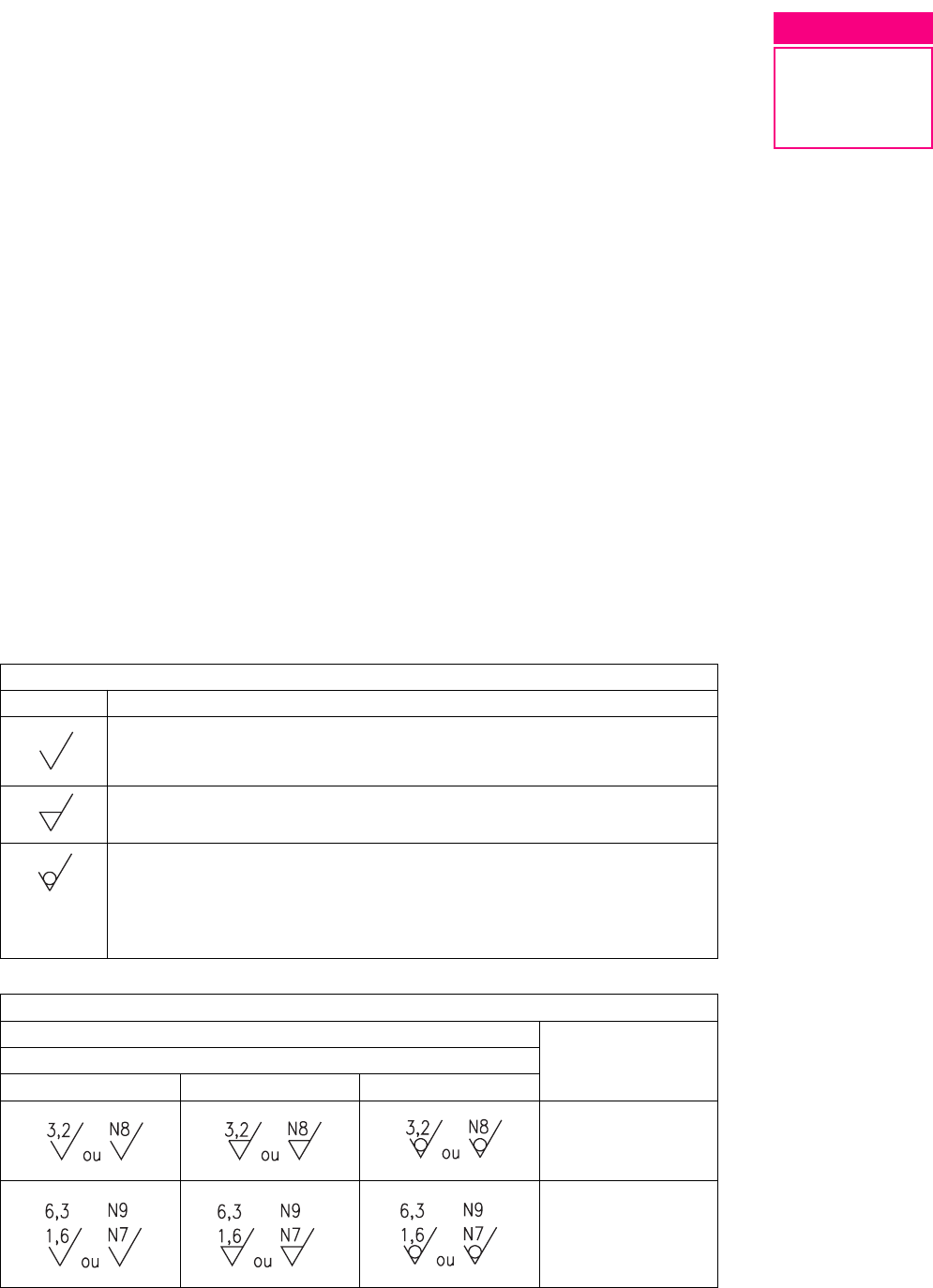 20 A U L A Existem vÆrios tipos de superfície de peças. Qual o melhor meio para identificar rapidamente cada um desses tipos e o estado das superfícies? Essa questªo foi resolvida com símbolos convencionados, representados por desenhos tØcnicos. Vamos conhecer essa simbologia? Simbologia: Norma ABNT - NBR 8404/1984 A Norma ABNT - NBR 8404 fixa os símbolos e indicaçıes complementares para a identificaçªo do estado de superfície em desenhos tØcnicos. Um problema 20 A U L A QUADRO 2: S˝MBOLOS COM INDICA˙ˆO DA CARACTER˝STICA PRINCIPAL DA RUGOSIDADE, RA S˝MBOLO A remoçªo do material Ø: facultativa exigida nªo permitida Superfície com rugosidade de valor mÆximo Ra = 3,2 mm. Superfície com rugosidade de valor mÆximo Ra= 6,3 mm e mínimo Ra = 1,6 mm. SIGNIFICADO Símbolo bÆsico; só pode ser usado quando seu significado for complementado por uma indicaçªo. Caracteriza uma superfície usinada, sem mais detalhes. Caracteriza uma superfície na qual a remoçªo de material nªo Ø permi- tida e indica que a superfície deve permanecer no estado resultante de um processo de fabricaçªo anterior, mesmo se ela tiver sido obtida por usinagem. QUADRO 1: S˝MBOLO SEM INDICA˙ˆO S˝MBOLO SIGNIFICADO Representaçªo de rugosidade 20 A U L A Esses símbolos podem ser combinados entre si, ou utilizados em combina- çªo com os símbolos que tenham a indicaçªo da característica principal da rugosidade Ra. Indicaçıes do estado de superfície no símbolo Cada uma das indicaçıes do estado de superfície Ø disposta em relaçªo ao símbolo. a = valor da rugosidade Ra, em mm, ou classe de rugosidade N1 atØ N12 b = mØtodo de fabricaçªo, tratamento ou revestimento c = comprimento de amostra, em milímetro (cut of f) d = direçªo de estrias e = sobremetal para usinagem, em milímetro f = outros parâmetros de rugosidade (entre parŒnteses) QUADRO 3: S˝MBOLOS COM INDICA˙ÕES COMPLEMENTARES S˝MBOLO SIGNIFICADO Processo de fabricaçªo: fresar. Comprimento de amostragem cut off = 2,5 mm. Direçªo das estrias: perpendicular ao plano; projeçªo da vista. Sobremetal para usinagem = 2mm. Indicaçªo (entre parŒnteses) de um outro parâmetro de rugosidade diferente de Ra, por exemplo, Rt = 0,4 mm. QUADRO 4: S˝MBOLOS PARA INDICA˙ÕES SIMPLIFICADAS S˝MBOLO SIGNIFICADO Uma indicaçªo complementar explica o significado do símbolo. Uma indicaçªo complementar explica o significado dos símbolos. fresar 20 A U L AIndicaçªo nos desenhos Os símbolos e inscriçıes devem estar orientados de maneira que possam ser lidos tanto com o desenho na posiçªo normal como pelo lado direito. Direçªo das estrias Paralela ao plano de projeçªo da vista sobre o qual o símbolo Ø aplicado. Perpendicular ao plano de projeçªo da vista sobre o qual o símbolo Ø aplicado. Cruzadas em duas direçıes oblíquas em relaçªo ao plano de projeçªo da vista sobre o qual o símbolo Ø aplicado. Muitas direçıes. Aproximadamente central em relaçªo ao ponto mØdio da super- fície ao qual o símbolo Ø referido. Aproximadamente radial em relaçªo ao ponto mØdio da superfície ao qual o símbolo Ø referido. QUADRO 5: S˝MBOLO PARA DIRE˙ˆO DAS ESTRIAS S˝MBOLO INTERPRETA˙ˆO X M C R = ^ 20 A U L A Se for necessÆrio definir uma direçªo das estrias que nªo esteja claramente definida por um desses símbolos, ela deve estar descrita no desenho por uma nota adicional. A direçªo das estrias Ø a direçªo predominante das irregularidades da superfície, que geralmente resultam do processo de fabricaçªo utilizado. Rugosímetro O rugosímetro Ø um aparelho eletrônico amplamente empregado na indœs- tria para verificaçªo de superfície de peças e ferramentas (rugosidade). Assegu- ra um alto padrªo de qualidade nas mediçıes. Destina-se à anÆlise dos problemas relacionados à rugosidade de superfícies. Aparelhos eletrônicos Inicialmente, o rugosímetro destinava-se somente à avaliaçªo da rugosidade ou textura primÆria. Com o tempo, apareceram os critØrios para avaliaçªo da textura secundÆria, ou seja, a ondulaçªo, e muitos aparelhos evoluíram para essa nova tecnologia. Mesmo assim, por comodidade, conservou-se o nome genØrico de rugosímetro tambØm para esses aparelhos que, alØm de rugosidade, medem a ondulaçªo. Os rugosímetros podem ser classificados em dois grandes grupos: • Aparelhos que fornecem somente a leitura dos parâmetros de rugosidade (que pode ser tanto analógica quanto digital). • Aparelhos que, alØm da leitura, permitem o registro, em papel, do perfil efetivo da superfície. Os primeiros sªo mais empregados em linhas de produçªo, enquanto os segundos tŒm mais uso nos laboratórios, pois tambØm apresentam um grÆfico que Ø importante para uma anÆlise mais profunda da textura superficial. rugosímetro portátil digital 20 A U L A Os aparelhos para avaliaçªo da textura superficial sªo compostos das seguintes partes: Apalpador - TambØm chamado de pick-up, desliza sobre a superfície que serÆ verificada, levando os sinais da agulha apalpadora, de diamante, atØ o amplificador. Unidade de acionamento - Desloca o apalpador sobre a superfície, numa velocidade constante e por uma distância desejÆvel, mantendo-o na mesma direçªo. Amplificador - ContØm a parte eletrônica principal, dotada de um indica- dor de leitura que recebe os sinais da agulha, amplia-os, e os calcula em funçªo do parâmetro escolhido. Registrador - É um acessório do amplificador (em certos casos fica incorpo- rado a ele) e fornece a reproduçªo, em papel, do corte efetivo da superfície. rugosímetro digital com registro gráfico incorporado sistema para avaliação de textura superficial (analógico) esquema de funcionamento de um rugosímetro 20 A U L A Processo da determinaçªo da rugosidade Esse processo consiste, basicamente, em percorrer a rugosidade com um apalpador de formato normalizado, acompanhado de uma guia (patim) em relaçªo ao qual ele s