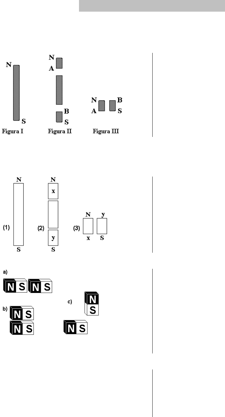 1ª Lista de exercícios do 2º ano do E.M. – 4º bimestre. Física A – Prof. Marco Antônio MAGNETISMO, CAMPO MAGNÉTICO INDUZIDO E FORÇA MAGNÉTICA � 1. (FUVEST) A figura I adiante representa um imã permanente em forma de barra, onde N e S indicam, respectivamente, pólos norte e sul. Suponha que a barra seja dividida em três pedaços, como mostra a figura II. � Colocando lado a lado os dois pedaços extremos, como indicado na figura III, é correto afirmar que eles a) se atrairão, pois A é pólo norte e B é pólo sul. b) se atrairão, pois A é pólo sul e B é pólo norte. c) não serão atraídos nem repelidos. d) se repelirão, pois A é pólo norte e B é pólo sul. e) se repelirão, pois A é pólo sul e B é pólo norte. � 2. (UECE) Um ímã permanente retilíneo, cujos extremos N e S são os pólos norte e sul, respectivamente, acha-se representado na figura (1). Suponha que a barra ímã seja dividida em três partes, segundo mostra a figura (2). Por fim, os segmentos das extremidades são colocados lado a lado, como na figura (3). Nesta situação, é correto afirmar que: � a) eles se atrairão, pois x é pólo norte e y é pólo sul b) eles se atrairão, pois x é pólo sul e y é pólo norte c) eles se repelirão, pois x é pólo norte e y pólo sul d) eles se repelirão, pois x é pólo sul e y é pólo norte � 3. Pares de imãs em forma de barra são dispostos conforme indicam as figuras a seguir: � A letra N indica o pólo Norte e o S o pólo Sul de cada uma das barras. Entre os imãs de cada um dos pares anteriores (a) , (b) e (c) ocorrerão, respectivamente, forças de: a) atração, repulsão, repulsão; b) atração, atração, repulsão; c) atração, repulsão, atração; d) repulsão, repulsão, atração; e) repulsão, atração, atração. � 4. Tem-se três barras, AB, CD, EF, aparentemente idênticas. Experimentalmente constata-se que: � I - a extremidade A atrai a extremidade D; II - A atrai a extremidade C; III - D repele a extremidade E ; Então: a) AB, CD e EF são ímãs. b) AB é ímã, CD e EF são de ferro. c) AB é de ferro, CD e EF são ímãs. d) AB e CD são de ferro, EF é ímã. e) CD é ímã, AB e EF são de ferro. � 5. (UFRS) A figura (a) representa uma metade magnetizada de uma lâmina de barbear, com os pólos norte e sul indicados respectivamente pelas letras N e S. Primeiramente, esta metade de lâmina é dividida em três pedaços, como indica a figura (b). A seguir, os pedaços 1 e 3 são colocados lado a lado, como indica a figura (c). � Nestas condições, podemos afirmar que os pedaços 1 e 3 se __________, pois P assinala um pólo __________ e Q um pólo __________ . A alternativa que preenche corretamente as lacunas na afirmativa anterior é: a) atrairão - norte - sul b) atrairão - sul - norte c) repelirão - norte - sul d) repelirão - sul - norte e) atrairão - sul - sul � 6. (FATEC) Dispõe-se de três barras, idênticas nas suas geometrias, x, y e z, e suas extremidades são nomeadas por x�, x‚, y�, y‚, z� e z‚. � Aproximando-se as extremidades, verifica-se que x‚ e y‚ se repelem; x� e z� se atraem; y� e z‚ se atraem e x� e y‚ se atraem. É correto concluir que somente a) x e y são ímãs permanentes. b) x e z são ímãs permanentes. c) x é ímã permanente. d) y é ímã permanente. e) z é ímã permanente. � 7. (FUVEST) Um objeto de ferro, de pequena espessura e em forma de cruz, está magnetizado e apresenta dois pólos Norte (N) e dois pólos Sul (S). Quando esse objeto é colocado horizontalmente sobre uma mesa plana, as linhas que melhor representam, no plano da mesa, o campo magnético por ele criado, são as indicadas em 8. (UFPEL) Considere um ímã permanente e uma barra de ferro inicialmente não imantada, conforme a figura a seguir. � Ao aproximarmos a barra de ferro do ímã, observa-se a formação de um pólo ______ em A, um pólo ______ em B e uma ______ entre o ímã e a barra de ferro. A alternativa que preenche respectiva e corretamente as lacunas da afirmação anterior é a) norte, sul, repulsão b) sul, sul, repulsão. c) sul, norte, atração. d) norte, sul, atração e) sul, norte, repulsão. � 9. (UNESP) A figura a seguir representa um condutor retilíneo, percorrido por uma corrente i, conforme a convenção indicada. O sentido do campo magnético no ponto p, localizado no plano da figura, é � a) contrário ao da corrente b) saindo perpendicularmente da página c) entrando perpendicularmente na página d) para sua esquerda, no plano do papel. e) para sua direita no plano do papel. � 10. (FUVEST) A figura representa 4 bússolas apontando, inicialmente, para o polo norte terrestre. Pelo ponto O, perpendicularmente ao plano do papel, coloca-se um fio condutor retilíneo e longo. Ao se fazer passar pelo condutor uma corrente elétrica contínua e intensa no sentido do plano do papel para a vista do leitor, permanece praticamente inalterada somente a posição � a) das bússolas A e C. b) das bússolas B e D. c) das bússolas A, C e D. d) da bússola C. e) da bússola D. � 11. (UNESP) Um fio longo e retilíneo é percorrido por uma corrente elétrica constante I e o vetor indução magnética em um ponto próximo ao fio tem módulo B. Se o mesmo fio for percorrido por uma corrente elétrica constante igual a 3I, determine o valor do módulo do vetor indução magnética, no mesmo ponto próximo ao fio. 12. Uma espira circular tem raio 0,2 m e é percorrida por uma corrente de 5A no sentido horário. Determine a intensidade e a orientação do vetor campo magnético no centro da espira. Adote m0 = 4 .10-7 T.m/A 13 Uma espira circular de raio R=0,2 m é percorrida por uma corrente elétrica de intensidade i=8A no sentido horário. Dê as características do vetor campo magnético no centro da espira. Adote 0 = 4 .10-7 T.m/A 14. Duas espiras circulares concêntricas e coplanares de raios 0,4 m e 0,8 m são percorridas por corrente