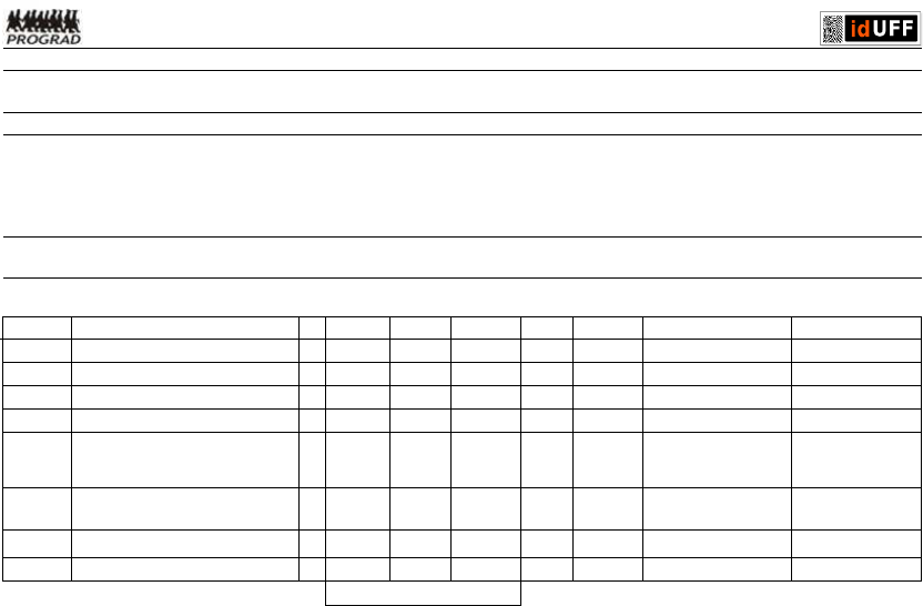 MATRIZ CURRICULAR - UFF GRAU - Graduação Currículo: 15.05.001 Curso: FARMÁCIA Versão: 1 Turno: Integral (OB) Carga horária obrigatória: 4474 (O) Carga horária optativa: 420 (EL) Carga horária eletiva: 0 (E) Carga horária obrigatória de escolha: 506 (ON) Carga horária optativa de ênfase: 0 (OL) Carga horária obrigatória livre: 0 (AC) Carga horária de atividade complementar: 0 Carga horária total: 5400 Titulação: FARMACÊUTICO Habilitação: - Enfâse: - Linha de Formação: - TEMPO PARA INTEGRALIZAÇÃO EM SEMESTRES LETIVOS: MÁXIMO - 15 PREVISTO - 10 1º período CHEestágioNomeCódigo Tipo Pré-requisitos Co-requisitosCHTeórica CHPrática CHTotal CHPre-Req GAN00150 MATEMÁTICA I 0 0OB 54 54 GBG00053 GENÉTICA E EVOLUÇÃO HUMANA 0 0OB 36 36 GCM00026 BIOLOGIA CELULAR II 12 0OB 42 54 GFI00170 FÍSICA PARA FARMÁCIA 0 0OB 90 90 GQI00044 QUÍMICA GERAL I 0 0OB 72 72 [1 - GQI00045] QUÍMICA GERAL EXPERIMENTAL I GQI00045 QUÍMICA GERAL EXPERIMENTAL I 54 0OB 0 54 [1 - GQI00044] QUÍMICA GERAL I MGF00010 INTRODUÇÃO ÀS CIÊNCIASFARMACÊUTICAS 0 0OB 36 36 MMO00065 MORFOLOGIA 0 0OB 126 126 522Total de Carga Horária obrigatória do Semestre: 1 Gerado em: 10/05/2014 - 10:39 MATRIZ CURRICULAR - UFF GRAU - Graduação 2º período CHEestágioNomeCódigo Tipo Pré-requisitos Co-requisitosCHTeórica CHPrática CHTotal CHPre-Req GAN00151 MATEMÁTICA II 0 0OB 54 54 [1 - GAN00150] MATEMÁTICA I GCM00027 BIOLOGIA MOLECULAR 6 0OB 30 36 [1 - GCM00026] BIOLOGIA CELULAR II GET00120 BIOESTATÍSTICA APLICADA A FARMÁCIA 0 0OB 54 54 [1 - GAN00150] MATEMÁTICA I GNE00024 BIOFÍSICA I 0 0OB 36 36 [1 - GFI00170] FÍSICA PARA FARMÁCIA GQA00019 QUIMICA ANALITICA I 0 0OB 60 60 [2 - GQA00020] QUIMICA ANALITICA I EXPERIMENTAL [1 - GQI00044] QUÍMICA GERAL I [1 - GQI00045] QUÍMICA GERAL EXPERIMENTAL I GQA00020 QUIMICA ANALITICA I EXPERIMENTAL 45 0OB 0 45 [2 - GQA00019] QUIMICA ANALITICA I [1 - GQI00044] QUÍMICA GERAL I [1 - GQI00045] QUÍMICA GERAL EXPERIMENTAL I GQI00046 QUÍMICA INORGÂNICA 0 0OB 72 72 [1 - GQI00044] QUÍMICA GERAL I [1 - GQI00045] QUÍMICA GERAL EXPERIMENTAL I GQO00058 QUÍMICA ORGÂNICA V 0 0OB 54 54 [2 - GQO00059] QUÍMICA ORGÂNICA EXPERIMENTAL V [1 - GQI00044] QUÍMICA GERAL I [1 - GQI00045] QUÍMICA GERAL EXPERIMENTAL I GQO00059 QUÍMICA ORGÂNICA EXPERIMENTAL V 54 0OB 0 54 [2 - GQO00058] QUÍMICA ORGÂNICA V [1 - GQI00044] QUÍMICA GERAL I [1 - GQI00045] QUÍMICA GERAL EXPERIMENTAL I 2 Gerado em: 10/05/2014 - 10:39 MATRIZ CURRICULAR - UFF GRAU - Graduação MSS00020 FUNDAMENTOS DE SAÚDE COLETIVA 0 0OB 54 54 519Total de Carga Horária obrigatória do Semestre: 3º período CHEestágioNomeCódigo Tipo Pré-requisitos Co-requisitosCHTeórica CHPrática CHTotal CHPre-Req GCM00025 BIOQUÍMICA IV 36 0OB 72 108 [2 - GCM00027] BIOLOGIA MOLECULAR [2 - GQA00019] QUIMICA ANALITICA I [2 - GQO00058] QUÍMICA ORGÂNICA V GFQ00027 FÍSICO-QUÍMICA VII 0 0OB 72 72 [1 - GFI00170] FÍSICA PARA FARMÁCIA [2 - GAN00151] MATEMÁTICA II GQA00021 QUIMICA ANALITICA II 0 0OB 45 45 [3 - GQA00022] QUIMICA ANALITICA II EXPERIMENTAL [2 - GQA00019] QUIMICA ANALITICA I GQA00022 QUIMICA ANALITICA II EXPERIMENTAL 45 0OB 0 45 [3 - GQA00021] QUIMICA ANALITICA II [2 - GQA00020] QUIMICA ANALITICA I EXPERIMENTAL GQO00060 QUÍMICA ORGÂNICA VI 0 0OB 72 72 [3 - GQO00061] QUÍMICA ORGÂNICA EXPERIMENTAL VI [2 - GQO00058] QUÍMICA ORGÂNICA V GQO00061 QUÍMICA ORGÂNICA EXPERIMENTAL VI 54 0OB 0 54 [3 - GQO00060] QUÍMICA ORGÂNICA VI [2 - GQO00059] QUÍMICA ORGÂNICA EXPERIMENTAL V GQO00064 MÉTODOS FÍSICOS DE ANÁLISEORGÂNICA I 0 0OB 54 54 [2 - GQO00058] QUÍMICA ORGÂNICA V MAF00016 DEONTOLOGIA 0 0OB 36 36 [2 - MSS00020] 3 Gerado em: 10/05/2014 - 10:39 MATRIZ CURRICULAR - UFF GRAU - Graduação FUNDAMENTOS DE SAÚDE COLETIVA MBO00024 INTRODUÇÃO À CIÊNCIA DOSALIMENTOS 0 0OB 18 18 [3 - GCM00025] BIOQUÍMICA IV MSS00021 MEDICAMENTOS, SAÚDE E CULTURA 0 0OB 18 18 [2 - MSS00020] FUNDAMENTOS DE SAÚDE COLETIVA 522Total de Carga Horária obrigatória do Semestre: 4º período CHEestágioNomeCódigo Tipo Pré-requisitos Co-requisitosCHTeórica CHPrática CHTotal CHPre-Req GFQ00028 FÍSICO-QUÍMICA VIII 0 0OB 72 72 [4 - GFQ00029] FÍSICO- QUÍMICA EXPERIMENTAL VIII [3 - GFQ00027] FÍSICO- QUÍMICA VII GFQ00029 FÍSICO-QUÍMICA EXPERIMENTAL VIII 72 0OB 0 72 [4 - GFQ00028] FÍSICO- QUÍMICA VIII [3 - GFQ00027] FÍSICO- QUÍMICA VII GIM00028 IMUNOLOGIA II 27 0OB 36 63 [1 - GCM00026] BIOLOGIA CELULAR II [1 - MMO00065] MORFOLOGIA [2 - GCM00027] BIOLOGIA MOLECULAR [2 - GNE00024] BIOFÍSICA I GQA00018 ANALISE INSTRUMENTAL IEXPERIMENTAL 30 0OB 0 30 [4 - GQA00032] ANALISE INSTRUMENTAL [3 - GQA00022] QUIMICA ANALITICA II EXPERIMENTAL GQA00032 ANALISE INSTRUMENTAL 0 0OB 30 30 [4 - GQA00018] ANALISE INSTRUMENTAL I EXPERIMENTAL [3 - GQA00021] QUIMICA ANALITICA II 4 Gerado em: 10/05/2014 - 10:39 MATRIZ CURRICULAR - UFF GRAU - Graduação GQO00062 QUÍMICA ORGÂNICA VII 0 0OB 54 54 [4 - GQO00063] QUÍMICA ORGÂNICA EXPERIMENTAL VII [3 - GQO00060] QUÍMICA ORGÂNICA VI GQO00063 QUÍMICA ORGÂNICA EXPERIMENTAL VII 54 0OB 0 54 [4 - GQO00062] QUÍMICA ORGÂNICA VII [3 - GQO00061] QUÍMICA ORGÂNICA EXPERIMENTAL VI MAF00030 ESTÁGIO SUPERVISIONADO EMFARMÁCIA COMUNITÁRIA I 0 54OB 0 54 [2 - MSS00020] FUNDAMENTOS DE SAÚDE COLETIVA MFL00067 FISIOLOGIA I 18 0OB 90 108 [1 - MMO00065] MORFOLOGIA [2 - GNE00024] BIOFÍSICA I [3 - GCM00025] BIOQUÍMICA IV 537Total de Carga Horária obrigatória do Semestre: 5º período CHEestágioNomeCódigo Tipo Pré-requisitos Co-requisitosCHTeórica CHPrática CHTotal CHPre-Req GQO00065 ANÁLISE ORGÂNICA I 0 0OB 36 36 [5 - GQO00066] ANÁLISE ORGÂNICA EXPERIMENTAL I [4 - GQO00062] QUÍMICA ORGÂNICA VII [4 - GQO00063] QUÍMICA ORGÂNICA EXPERIMENTAL VII GQO00066 ANÁLISE ORGÂNICA EXPERIMENTAL I 54 0OB 0 54 [5 - GQO00065] ANÁLISE ORGÂNICA I [4 - GQO00062] QUÍMICA ORGÂNICA VII [4 - GQO00063] QUÍMICA ORGÂNICA EXPERIMENTAL VII 5 Gerado em: 10/05/2014 - 10:39 MATRIZ CURRICULAR - UFF GRAU - Graduaç