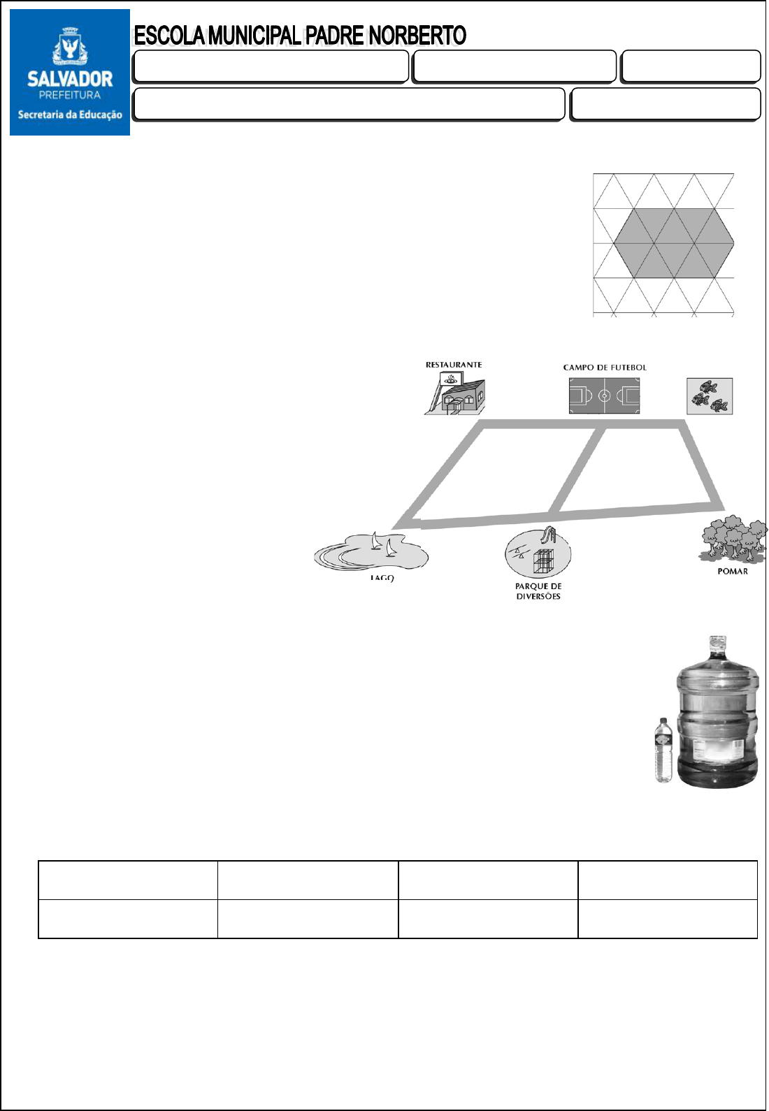 Coordenadoria Regional de Educação – CRE São Caetano Pessoas grandes são aquelas que lutam por ideais. Boa sorte! 01. Nesta malha triangular, o lado de cada triângulo equilátero mede 1,5 cm. O polígono destacado tem perímetro igual a a) 24,5 cm. b) 15 cm. c) 12 cm. d) 10 cm. 02. Ao lado, temos o mapa de um clube. Veja o comprimento de cada trilha entre um local e outro do clube. Para ir do restaurante até o pomar, passando primeiro pelo campo de futebol e depois pelo parque de diversão, quantos quilômetros serão percorridos? a) 3,9 km. b) 5,2 km. c) 5,5 km. d) 8,2 km. 03. Uma escola compra garrafões de água de 20 litros para colocar nas salas de aulas, conforme a ilustração a seguir. Para uma atividade extraclasse 100 alunos encheram suas garrafinhas de 500ml. Qual a quantidade equivalente de água, em número de garrafões, que foi consumida pelos alunos? a) 3 garrafões. b) 2 garrafões. c) 2 garrafões e meio. d) 3 garrafões e meio. 04. Na volta de ciclismo do Estado de São Paulo em 2004, a comissão organizadora do evento fez as seguintes estimativas para um dos percursos. Percurso Horário previsto de largadas Tempo estimado Horário previsto de chegada De São Paulo a São José dos Campos 15:00 02:17 17:17 Um competidor que fez a largada no horário previsto e chegou em São José dos Campos às 18 horas e 23 minutos ultrapassou o tempo estimado em a) 1 hora e 6 minutos. b) 1 hora e 16 minutos. c) 3 horas e 13 minutos. d) 3 horas e 23 minutos. 05. Determine o volume de líquido que cabe nessa jarra em cm³: a) 20 cm³ b) 200 cm³ c) 2000 cm³ d) 40 cm³ 06. Vovô Pedro mediu a altura da parede da sala. Indique a alternativa que mostra um resultado possível dessa medição. 3 metros 86 metros 99 centímetros 50 quilômetros 07. Cristina fará alguns laços. Para isso precisa recortar uma peça de fita, que mede 43,2 m em pedaços de 24 cm. Quantos lacinhos Cristina fará? 280 180 140 120 08. Márcia planejou uma viagem. Se ela viajar 6 horas e meia por dia, durante 5 dias, o total de horas dessa viagem será igual a: a) 30 horas. b) 31 horas e meia. c) 32 horas e meia. d) 40 horas. 09. Observe ao lado a receita de pão que a vovó Luciane costuma fazer: Baseando-se nessa receita, assinale a receita necessária para fazer apenas 8 desses pãezinhos. a) 500g de farinha de trigo, 0,5 litros de água gelada, 1 tablete de fermento biológico, 20 gramas de sal. b) 500g de farinha de trigo, 0,25 litros de água gelada, 1 tablete de fermento biológico, 18 gramas de sal. c) 750g de farinha de trigo, 0,25 litros de água gelada, 1 tablete de fermento biológico, 15 gramas de sal. d) 500g de farinha de trigo, 0,25 litros de água gelada, 1 tablete de fermento biológico, 15 gramas de sal. 10. Calcule em metros o valor da expressão 2,4 km + 82 hm + 12,5 dam. O valor dessa expressão é: a) 96,9 metros km hm dam m dm cm mm b) 10 725 metros c) 23,1 metros d) 231 metros Turma: TAP IV Aluno(a): Data): Professor(a): Erica Viviane Disciplina: Matemática AVALIAÇÃO FINAL – III UNIDADE