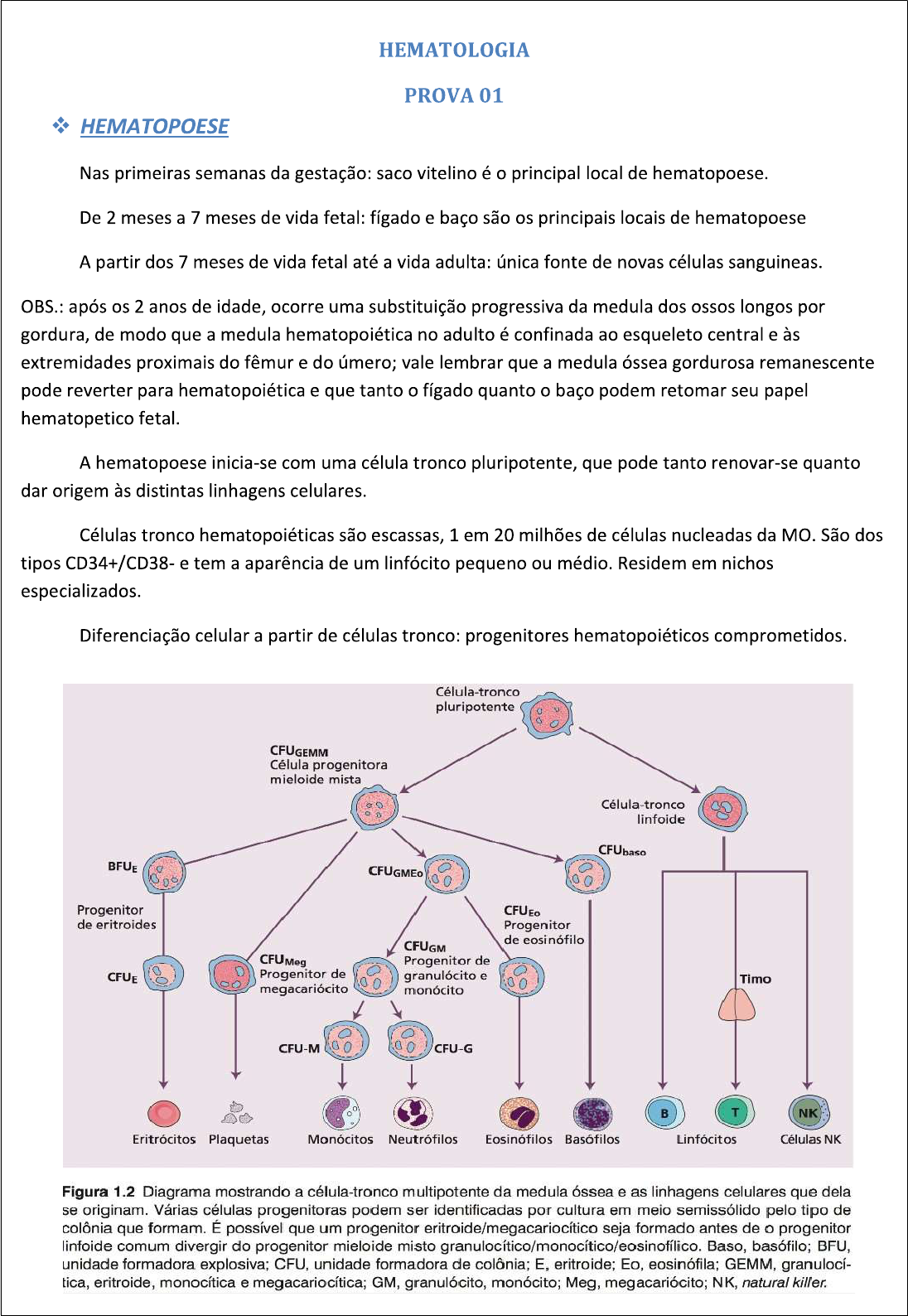 ANEMIAS Síndrome clínica causada pela redução das hm/Hb circulantes e conseqüente diminuição da capacidade de transporte de O2. O hematócrito é a fração volumétrica ocupada pelos eritrócitos no sangue. De forma geral, o hematócrito está em torno de 3x maior do que a Hb. Os pacientes anêmicos geralmente procuram cuidados médicos devido a sinais e sintomas da doença base independentes da anemia; sinais e sintomas decorrentes da anemia; ou os dois. Mais comumente o paciente é oligossintomatico ou assintomático, fazendo com que o diagnostico de anemia seja feito após analise de exames de rotina. Os sintomas, no geral, provem do prejuízo na capacidade carreadora de O2, predispondo à hipoxia tecidual e aumento do debito cardíaco na forma compensatória. Anemia relativa: •Gravidez •Insuficiência renal •Insuficiência cardíaca •Doenças crônicas •Hipoalbuminemia Anemia verdadeira: •Perda sanguínea aguda •Menor produção das hemácias •Diminuição da sobrevida das hemácias A intensidade dos sintomas anêmicos depende da rapidez da instalação da anemia, bem como da reserva miocárdica, coronariana, pulmonar e cerebral do paciente. Os sinais e sintomas decorrentes de sangramento agudo são muito piores, pois juntamente à anemia temos hipovolemia, promovendo má perfusão orgânica, às vezes choque, acidose lática e morte (choque hemorrágico). • Investigação etiológica do quadro anêmico Tempo de instalação dos sintomas: as anemias carenciais (ferropriva e megaloblástica) são de caráter insidioso; a anemia hemolítica autoimune e hemorrágica aguda geralmente têm inicio abrupto; anemia falciforme, talassemia e esferocitose são anemias hereditárias, com inicio na infância. Sintomas associados: podem denunciar a existência de uma doença base Queilite angular e glossite: sugestivo de anemias carenciais Icterícia: comum nas anemias megaloblásticas e hemolíticas Esplenomegalia: anemia hemolítica Pétequias: anemia aplásica e leucemias agudas Deformidades ósseas na face e no crânio: talassemia Hemorragias e infecções: Anemia aplásica ou Leucemias Parestesias: Anemia Perniciosa Dores ósseas, fraturas patológicas: Mieloma, Metástases • Investigação laboratorial • ERITROGRAMA Homem adulto - Hb< 13g/dL Mulher adulta - Hb<12g/dL Mulher grávida - Hb< 11g/dL 6 meses a 6 anos- Hb< 11g/dL 6 anos a 14 anos- Hb<12g/dL • Índices hemantimétricos VCM (Volume Corpuscular Médio) - 79 a 99 fl HCM (Hemoglobina Corpuscular Média) - 27 a 34 pg CHCM (Concentração de Hemoglobina Corpuscular Média) - 31 a 36% RDW (Coeficiente de Variação/Red Cell Distribution Width)-11a15% Anemias microcíticas e hipocrômicas: anemia ferropriva, talassemia, anemias de doenças crônicas de longa duração, anemia sideroblástica, anemia do hipotireoidismo. Anemias macrocíticas: anemia megaloblástica, anemia aplasica, alcoolismo, anemia hemolítica, anemia da hemorragia aguda (sendo as duas ultimas com reticulocitose, mimetizando uma He aumentada) Anemias normociticas e nomocromicas: anemias carenciais, anemia aplasica, anemia hemolítica Pancitopenia: anemia + plaquetopenia + leucócitopenia; sugere anemia aplasica ou leucemia aguda. Uma pancitopenia leve pode ser encontrada na anemia megaloblástica e autoimune. • Contagem de reticulócitos Os reticulócitos são células imediatamente precursoras das hemácias; 0,5 a 2% do total de células vermelhas. Reticulocitose: anemia hemolítica, anemia por hemorragia aguda; únicas que se originam por perda periférica de hemácias, sem nenhum comprometimento da medula óssea; aumento de hemácias jovens para tentar corrigir essa perda; As anemias podem ser hiperproliferativas e hipoproliferativas. • Hematoscopia IPR: Índice de produção reticulocitária ANEMIA FERROPRIVA A anemia ferropriva nunca deve ser um diagnostico final. Por trás sempre há uma doença de base determinando a perda sanguinea crônica. • METABOLISMO DO FERRO Quantidade corporal total de ferro: 55mg/kg no homem; 35mg/kg na mulher. Cerca de 70 a 75% do ferro é encontrado ligado nas hemácias; cerca de 25% pode ser encontrado nas proteínas ferritina e hemossiderina, que formam os compartimentos armazenadores de ferro; cerca de 2% pode ser encontrado circulante no plasma ligado à transferrina sérica. A concentração sérica de ferritina é diretamente proporcional às reservas de ferro no organismo. O duodeno e o jejuno proximal são as regiões intestinais responsáveis pela absorção do ferro alimentar (absorção de 10-30% do ferro ingerido) Ferro heme: alimentos de origem animal; molécula heme é absorvida; mais bem absorvida que a forma não-heme (30% a 10%) Ferro não-heme: alimentos de origem vegetal; íon ferroso é absorvido (Fe2+); influenciada pelo ph gástrico e pela composição dos alimentos. O ferro dietético tem dois destinos básicos: ligar-se à ferritina ou à transferrina plasmática. Será determinado pelas necessidades do organismo. Uma das principais vias de eliminação corpórea de ferro é a via fecal. Hepcidina: hormônio sintetizado no fígado; regulação do metabolismo do ferro; capacidade de se ligar à ferroportina, inibindo o transporte de ferro do enterocito para o plasma; Hipoxia inibe sua síntese, ao passo que ferro e citocinas inflamatórias estimulam; No plasma, o ferro circula ligado á transferrina, é através dela que ferro chega aos precursores na medula óssea. Quando incorporado pelas células me ferritina dentro das próprias células da medula; ou ser captado pelas mitocôndrias dessas células, formarem o heme e participar da composição da Hb. Quando as hemácias se tornam senis, são fagoc heme clivado liberará o ferro. Ferro reciclado pode ser estocado pela ferritina e hemossiderina dos macrófagos, ou ser liberada no plasma, se ligando à transferrina e sendo novamente capturada pelos eritroblastos da medula óssea. A hepcidina pode inibir a liberação do ferro
