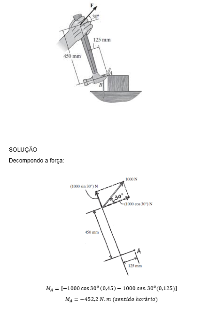 APOL 1 Para retirar pregos cravados na madeira, é comum que se utilize um martelo como uma alavanca que provoca momento, conforme a figura a seguir: Sabendo que F = 1000 N , determine o momento dessa força em relação ao ponto . ΣM=0 A caminhonete deve ser rebocada usando-se duas cordas. Determine a intensidade das forças FA e FB que atuam em cada corda a fim de produzir uma força resultante de 950N, orientada ao longo do eixo x positivo. Considere que θ=50°. (Hibbeler, Estática, 10ª ed, 2005) Fr=√A2+B2−2ABcosγ Asinα=Bsinβ=Csinγ FA=774,45N e FB=345,77N Um restaurante decide aproveitar um sistema de fios e anéis que possui para pendurar um candelabro de 50 kg, conforme a figura a seguir: Em qual fio é desenvolvida a tensão máxima? Qual a intensidade da tração? FAB = 622 N Determine a intensidade e o sentido da força de equilíbrio FAB exercida ao longo do elo AB pelo dispositivo de tração mostrado. A massa suspensa é de 10 kg. Despreze as dimensões da polia em A. ΣFx=0 ΣFy=0 FAB=98,10N e θ=15° Determine o peso máximo do vaso de planta que pode ser suportado, sem exceder uma força de 50 lb nem no cabo AB nem no AC. (Hibbeler, Estática, 10ª ed, 2005) APOL 2 Se o carrinho de pedreiro e seu conteúdo têm massa de 60 kg e centro de massa G, determine a intensidade da força resultante que o homem deve exercer em cada um dos braços do carrinho para mantê-lo em equilíbrio. (Estática, 10ª ed, Hibbeler) ΣM=0 Para estudar a resposta dinâmica ou o movimento acelerado de um corpo, é importante localizar o centro de massa do mesmo. Para que este ponto coincida com o centro geométrico (centroide), é necessário que o corpo: possua material uniforme e homogêneo; A resposta é dada por definição. Ver Hibbeler – Estática, página 340. Determine a localização do centro de gravidade do triciclo. As localizações dos centros de gravidade e os pesos de cada componente aparecem tabelados na figura. Se o triciclo é simétrico em relação ao plano x-y, determine as reações normais que cada uma de suas rodas exerce no solo. (Estática, 10ª ed, Hibbeler) A Você acertou! Aula 3, tema 1 Determine a intensidade das reações na viga em A e B. Despreze a espessura dela. (Estática, 10ª ed, Hibbeler) ΣM=0 Determine o momento de inércia da área de seção transversal da viga em relação ao eixo x′ que passa pelo centroide C da seção reta. Despreze as dimensões dos cantos de soldas em A e B para esses cálculos; considere que ¯y=104,3mm. (Estática, 10ª ed, Hibbeler) As cargas distribuídas podem ser substituídas por uma força resultante na posição do centroide. A coluna é usada para sustentar o piso superior, que exerce uma força de 3000 lb no topo dela. O efeito da pressão do solo na lateral da coluna é distribuído como mostra a figura. Substitua esse carregamento por uma força resultante equivalente e especifique em que ponto a força atua ao longo da coluna, a partir de sua base A. (Estática, 10ª ed., Hibbeler) Você acertou! Aula 3, tema 3 No projeto de eixos, é necessário conhecer o torque aplicado em cada ponto. O eixo, mostrado na figura, está apoiado por dois mancais de deslizamento A e B. As quatro polias encaixadas no eixo são usadas para transmitir potência ao maquinário adjacente. Sendo os torques aplicados ás polias. Determine os torques internos nos pontos C, D e E. (Estática, 10ª ed., Hibbeler) ΣM=0 Você acertou! Aula 4, tema 1 Determine a força nos membros BC, CG e GF, da treliça Warren. Indique se os membros estão sob tração ou compressão. FBC=7,70 kN (T); FCG=0,770 kN (C); FGF=8,08 kN (T); Determine a força máxima desenvolvida na treliça. Indique em qual membro esta força é desenvolvida, e se ela é de tração ou compressão. Considere cada nó como um pino. Faça P = 4 kN. FED=17,89 kN (C) Determine os diagramas de esforço cortante e de momento fletor para a viga em balanço. Qual o momento fletor máximo (em módulo) desenvolvido na viga? M=2,795 kN.m APOL APOL 4 Você acertou! Aula 5, tema 1 Os diâmetros das hastes AB e BC são 4 mm e 6 mm, respectivamente. Se for aplicada uma carga de 8 kN ao anel em B, determine a tensão normal média em cada haste se . "a" é a alternativa correta