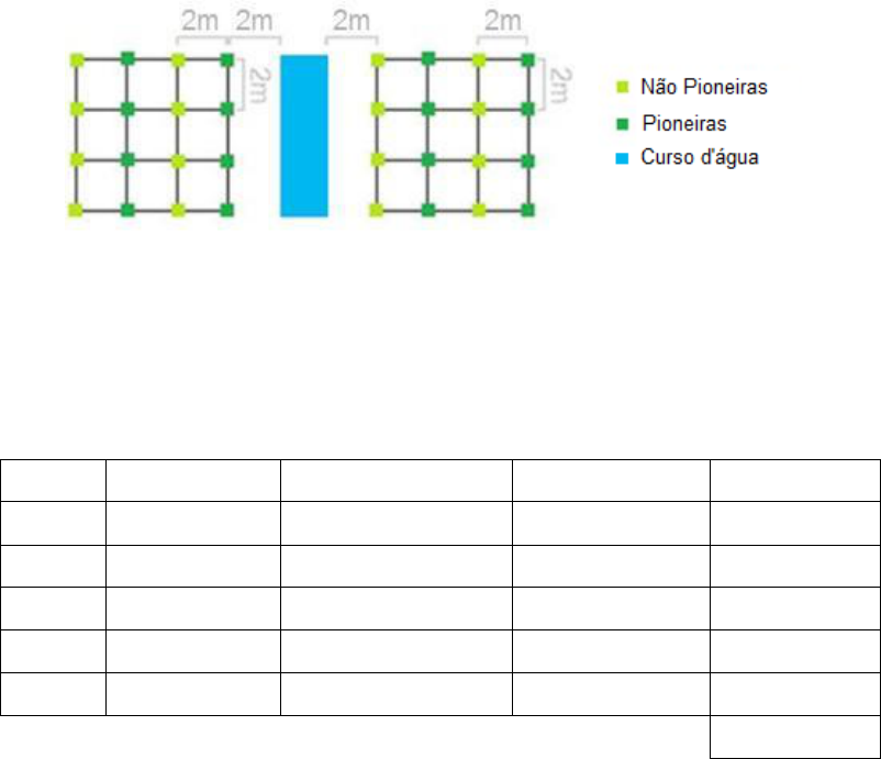 PROJETO DE REFLORESTAMENTO Disciplina: Recuperação de Áreas Degradadas O modelo a ser implantado na recuperação da área será o reflorestamento sucessional com plantio em linha com várias espécies, sendo uma de pioneiras (pioneiras e secundárias iniciais) e outra de não pioneiras (secundárias tardias e climáticas). O espaçamento do plantio será de 2 x 2 m. As espécies serão combinadas de acordo com seu grupo ecológico (pioneiras, secundárias iniciais, secundárias tardias ou clímax), de tal forma que as espécies pioneiras e secundárias iniciais de rápido crescimento, venham a sombrear as mudas das espécies que se desenvolvem melhor à sombra (secundárias tardias e clímax). Será respeitada a tolerância das espécies a cada tipo de solo seja ele úmido/encharcado ou bem drenado. Segue abaixo, na figura 1, esquema de distribuição das mudas no campo: Figura 1 - Croqui do modelo de plantio Os valores encontrados nas medições realizadas são apresentados na tabela 1. A largura da mata ciliar em cada margem foi definida de acordo com a Lei nº 12.651, de 25 de maio de 2012. Tabela 1 – Valores correspondentes a área de reflorestamento Pontos Largura (m) Comprimento (m) Mata ciliar (m) Área (ha) N - 314,2 50 0,79 AC 30 1210 50 12,1 BF 1 1180 30 7,2 CD 1 1010 30 6,06 CE 1 1420 30 8,52 Total = 34,67 A área de recuperação é de, aproximadamente, 34,67 ha. De acordo com a IN IEMA N° 17/2006, para áreas maiores que 1 ha são exigidas pelo menos 30 espécies nativas, portanto, optou-se por utilizar este número de espécies. Considerando um aumento de 20% para reposição das eventuais perdas nos replantios; um espaçamento de 2,5 m entre os mourões; e uma quantidade de 3 fios de arame, com um aumento 10% para sua implantação, temos: Ponto N Trechos AC, BF, CD e CE: Tabela 2 – Quantificação dos dados Pontos Mudas (un.) Cercas (m) Mourões (un.) Arames (m) N 2370 314,2 127 1036,86 AC 36360 2359 946 7884,7 BF 21276 2360 946 7788 CD 18216 2020 810 6666 CE 25596 2840 1138 9372 TOTAL 103.818 9.893,2 3.943 32.647,56 De acordo com o modelo de plantio apresentado na figura 1, sabe-se que a linha ao redor do curso d´água é composta por pioneiras; à medida que vai se afastando do rio, há alternância entre os grupos ecológicos (pioneiras e não pioneiras); e a última linha (mais afastada do rio) também é composta por pioneiras, portanto, temos: Ponto N Foi escolhida uma quantidade de 60% para pioneiras e 40% para não pioneiras, portanto: Trechos AC, BF, CD e CE: Pontos Pioneiras (un.) Não pioneiras (un.) N 1422 948 AC 18908 17452 BF 11347 9929 CD 9715 8501 CE 13651 11945 TOTAL 55.043 48.775