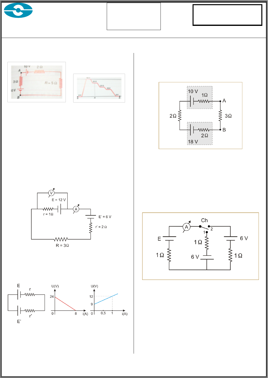 LISTA 5 Professor: ELTON PITA SÉRIE: 1º ANO DATA: 23 / 11 / 2015FÍSICA RECEPTOR ELÉTRICO GABARITO LISTA 03 Professor: ELTON PITA DATA: 04 / 08 / 2017 1 2 Exemplo: i = 3A UAB(gerador) = 31V 01. Um motor de corrente contínua tem valores nominais 3,0V e 0,2A. Funcionando nessas condições, a resistência interna r’ do motor é de 4,0Ω. Determine: a f.c.e.m. nominal do motor; a sua potência útil e a dissipada; o seu rendimento. E’ = 2,2V Pútil = 0,44W Pdissipada = 0,16W Rendimento = 73,33% i = 1A GERADOR ASSOCIADO A RECEPTOR em série: i = 15/6 A 02. Considere o circuito abaixo. Qual dos elementos indicados é o gerador? Qual é o sentido da corrente elétrica que percorre o resistor de 3 Ω? De A para B ou de B para A? Qual é a tensão elétrica entre os terminais do resistor de 2 Ω? gerador: 18V; corrente em 3: de A para B; tensão em 2: 8/3 V. 03. A chave Ch pode ocupar as posições 1 ou 2. Com a chave na posição 1, o amperímetro ideal indica 6 A. Qual é o valor da força eletromotriz E do gerador? Passa-se a chave para a posição 2. Qual é a nova intensidade da corrente elétrica que o amperímetro indica? E = 6V i2 = 0 04. No circuito esquematizado, com a chave ch aberta o amperímetro ideal indica uma corrente elétrica de 2 A. Determine o valor de E considerando-o menor do que 24 V. A seguir, fecha-se a chave ch. Nestas condições, qual é a nova indicação do amperímetro? E = 12V iNOVA = 2,4A GERADOR, RECEPTOR E RESISTOR associados em série: i = 5/3A 05. (FEI-SP) Um gerador de rendimento igual a 90% recebe de uma turbina hidráulica uma potência P = 20 kW. Esse gerador alimenta um motor elétrico de rendimento igual a 80%. Qual a potência P’ disponível no eixo desse motor? P’ = 0,8 . 0,9 . 20kW P’ = 14,4 kW 06. (Ufla-MG) Um motor elétrico (receptor), de resistência interna de 10 Ω, está ligado a uma tomada de 200 V, recebendo uma potência de 1 600 W. Calcule: a) a potência elétrica dissipada internamente; b) a força contraeletromotriz do motor; c) o rendimento do motor. a) 640W b) 120V c) 60% 07. Calcule a maior intensidade de corrente elétrica no circuito a seguir, em que estão presentes quatro baterias. 2A 08. a) a diferença de potencial entre os pontos Q e P; b) a diferença de potencial entre os pontos Q e P, se o circuito for cortado no ponto S. a) 21V b) 24V 09. Um gerador de 48 V e resistência interna igual a 0,7 Ω está carregando uma bateria de 12 V e 0,3 Ω de resistência interna. Em série com eles foi colocado um resistor de 5 Ω. Calcule a intensidade da corrente elétrica no circuito. i = 6A 2