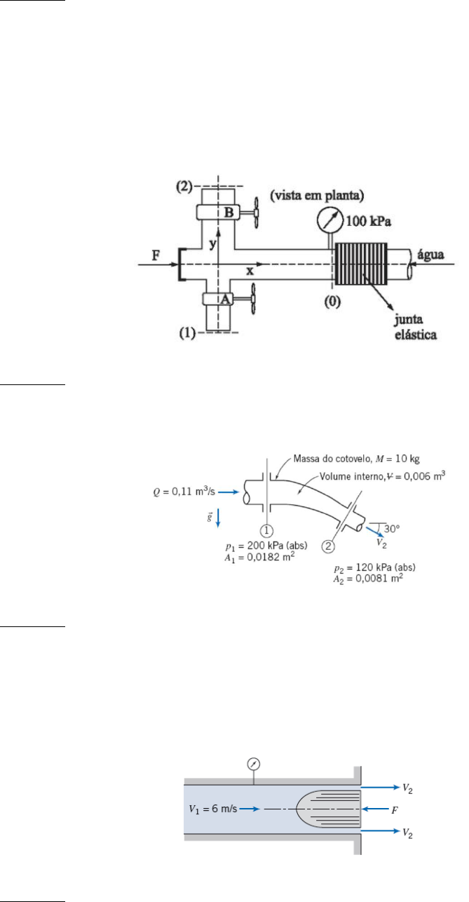 Questão 1 No esquema que se segue, podem ocorrer duas situações: O registro (B) fechado e o registro (A) aberto, a água é despejada por (1); O registro (A) fechado e o registro (B) aberto, a água é despejada por (2). Em ambos os casos, a pressão indicada na figura é a mesma, bem como se tem a mesma força F = 1090 N, necessário para o equilíbrio segundo a direção x. Determinar, para cada uma das situações citadas, qual deve ser a força para o equilíbrio, segundo a direção y. Dados: γágua = 10000 N/m³; A0 = 100 cm²; A1 = 50 cm²; A2 = 75 cm²; g = 10 m/s². Questão 2 Um cotovelo redutor de 30º é mostrado. O fluido é a água. Avalie as componentes da força que devem ser aplicadas pelos tubos adjacentes para manter o cotovelo estático. Questão 3 Água escoa, com baixa velocidade, através de um tubo circular com diâmetro interno de 50 mm. Um tampão arredondado e liso, de 38 mm de diâmetro, é mantido na extremidade do tubo onde a água é descarregada para a atmosfera. Ignore os efeitos do atrito e considere perfis uniformes de velocidade em cada seção. Determine a pressão medida pelo manômetro e a força requerida para manter o tampão no lugar. Questão 4 Dado o dispositivo da figura, calcular a vazão do escoamento da água no conduto. Dados: γágua = 10000 N/m³; γm = 6000; p2 = 20 kPa; A = 10-2 m²; g = 10 m/s². Desprezar perdas e considerar o perfil de velocidade uniforme. Questão 5 Dois tubos de ferro galvanizado de diâmetro D estão conectados a um grande reservatório de água conforme mostrado. O tubo A tem comprimento L e o tubo B tem comprimento 2L. Ambos os tubos descarregam para a atmosfera. Por qual tubo passará a maior vazão? Justifique (sem calcular a vazão em cada tubo). Calcule as vazões se H = 10 m, D = 50 mm e L = 10 m. Questão 6 Dois reservatórios são conectados por meio de três tubos limpos de ferro fundido em série, L1 = 600 m, D1 = 0,3 m, L2 = 900 m, D2 = 0,4 m, L3 = 1500 m, D3 = 0,45 m. Para uma vazão de 0,11 m³/s de água a 15 ºC, determine a diferença de elevação entre os reservatórios. Questão 7 Na instalação da figura, determinar a potência da bomba necessária para produzir uma vazão de 10 L/s, supondo seu rendimento de 70 %. Dados: D4 = 2,5”; D3 = 4”; aço; ν = 10-6 m²/s; γ = 10000 N/m³; Leq1 = 20 m; Leq2 = 2 m; Leq6 = Leq7 = 1 m; Ks5 = 10; Ks8 = 1