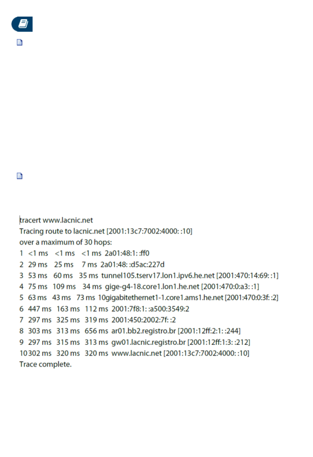 REDES AVANÇADAS 1a Questão (Ref.: 1055850) Pontos: 1,0 / 1,0 O IPv6 nasceu para atender ao crescimento exponencial da Internet e iminente esgotamento do espaço de endereços IPv4, bem como da necessidade de esquemas de endereçamento mais simples para redes IP. Descreva pelo menos três implementações presentes no IPv6, que são mais eficientes, se comparadas às respectivas implementações no IPv4. Resposta: Fragmentação apenas nos sistemas finais (nos hosts), liberando os roteadores dessa tarefa que consome muito recurso de processamento e memória dos mesmos; Otimização da tabela de roteamento, melhorando o tempo de rota e memória de cada roteador e Autoconfiguração de endereço baseado no endereço MAC, tornando o erro de endereçamento automático quase em extinção. Gabarito: Maior espaço de endereço; eliminação de NAT público-privada; eliminação de endereços de broadcast; cabeçalho simplificado para melhorar a eficiência no roteamento e encaminhamento; suporte à mobilidade;suporte à segurança (IPSec obrigatório);definição simplificada do prefixo de rede ou sub-rede; possibilidade de vários endereços por interface; autoconfiguração de endereços; mais eficiente na agregação rota; fragmentação somente nos sistemas finais. 2a Questão (Ref.: 1056659) Pontos: 1,0 / 1,0 Tendo como base a figura a seguir, explique como funciona a ferramenta para rastreamento de rotas (traceroute) normalmente incorporadas no sistema operacional dos dispositivos. Em sua resposta, analise o trace realizado para o endereço www.lacnic.net (esboçado na figura) e detalhe todas as informações apresentadas pela saída da ferramenta tracert: Resposta: O rastreamento de rota verifica quantos saltos (quantos roteadores) o pacote da para alcançar um endereço IP na Internet. Gabarito: O traceroute lista as redes que os pacotes necessitam percorrer até o dispositivo final em uma rede remota. Esse tipo de software permite conhecer o caminho ou as rotas, bem como o atraso em redes IP. Na figura, a ferramenta Traceroute exibe a lista de roteadores ao longo do caminho, entre o dispositivo de origem e o servidor www.lacnic.net, de modo que são coletados estimativas de tempo de três pacotes, até cada roteador ao longo do caminho. Desse modo, essa ferramenta permite que o administrador de rede identifique a rota utilizada para alcançar o dispositivo de destino. Por exemplo, a lista de saltos exibida na figura acima possibilita identificar problemas no fluxo de dados quando não conseguimos acessar um site remoto. 3a Questão (Ref.: 1055845) Pontos: 1,0 / 1,0 1. Mostre que você compreendeu as mudanças propostas pela versão 6 do protocolo IP. A seguir são listadas algumas motivações que levaram à criação da versão 6 do protocolo IP (Internet Protocol). Qual dentre as alternativas, não é uma motivação para criação da versão 6 do protocolo IP: Fragmentação somente nos sistemas finais. Endereços de 128 bits. Cabeçalhos simples, extensíveis e estruturados (sem soma de verificação). Broadcast é obrigatório. Opções de segurança (criptografia) e autenticação nativas. 4a Questão (Ref.: 1055851) Pontos: 1,0 / 1,0 Dentre as características listadas a seguir, qual delas é implementada pelo IPv6? Endereços broadcast. Cabeçalho mais simples. Uso de NAT. Tratamento dos pacotes IP sem priorização. Fragmentação realizada nos enlaces ao longo do caminho. 5a Questão (Ref.: 1106208) Pontos: 1,0 / 1,0 O principal motivo para a implantação do IPv6 é a necessidade de mais endereços, porque os endereços IPv4 disponíveis não são suficientes. No IPv6 os endereços: anycast identificam uma única interface, de modo que um pacote enviado a um endereço anycast seja entregue a uma única interface. manycast identificam um conjunto de interfaces de forma que um pacote enviado a esse endereço sejam entregues a todas as interfaces associadas a esse endereço. são representados por seis grupos de 16 bits separados por dois-pontos (:) e escritos com numeração hexadecimal. broadcast não existem. No IPv4 eles eram responsáveis por direcionar um pacote para todos os nós de um mesmo domínio. multicast são utilizados para identificar um grupo de interfaces, porém, com a propriedade de que um pacote enviado a um endereço multicast é encaminhado apenas à interface do grupo mais próxima da origem do pacote. 6a Questão (Ref.: 1064758) Pontos: 1,0 / 1,0 Dado o seguinte endereço IPV6 ::1. Com base neste endereço podemos afirmar que é um endereçamento: Unicast Global de Documentação Unicast Link-Local (EUI64) Unicast Loopback Unicast Unique-Local (ULA) Multicast Escopo: Global 7a Questão (Ref.: 1003908) Pontos: 1,0 / 1,0 Qual das alternativas a seguir possui a mensagem utilizada pelo protocolo DHCPv6 na forma Stateful, com a ação de iniciar a comunicação entre host cliente e o servidor DHCPv6. Discover Request Reply Solicit Advertise 8a Questão (Ref.: 1056654) Pontos: 1,0 / 1,0 Em qual das alternativas a seguir, as mensagens apresentadas são todos do tipo mensagens de erro ICMPv6: Parameter Problem, Time Exceeded, Router Advertisement e Router Solicitation. Destination Unreachable, Packet Too Big, Time Exceeded e Parameter Problem. Packet Too Big, Router Advertisement, Neighobor Solicitation e Destination Unreachable. Parameter Problem, Echo Request, Echo Relay e Time Exceeded. Time Exceeded, Echo Request, Echo Relay e Neighbor Advertisement. 9a Questão (Ref.: 1056664) Pontos: 0,0 / 0,5 10. Qual dentre os comandos abaixo tem a sintaxe correta para a configuração de uma rota estática em um roteador Cisco? ipv6 route 2001:db8:cafe:0001::/64 FA00::12:2/64 ipv6 route 2001:db8:cafe:0001::/64 ipv6 route 2001:db8:cafe:0001::/64 2001:db8:cafe::0001:1 ipv6 route 2001:db8:cafe:0001::/64 FA00::12:2 ipv6 route 2001:db8:cafe:0001:: 2001:db8:cafe::0002:1/64 10a Questão (Ref.: 583319) Pontos: 0,5 / 0,5 Antes que a migração do endereçamento Ipv4 para o Ip