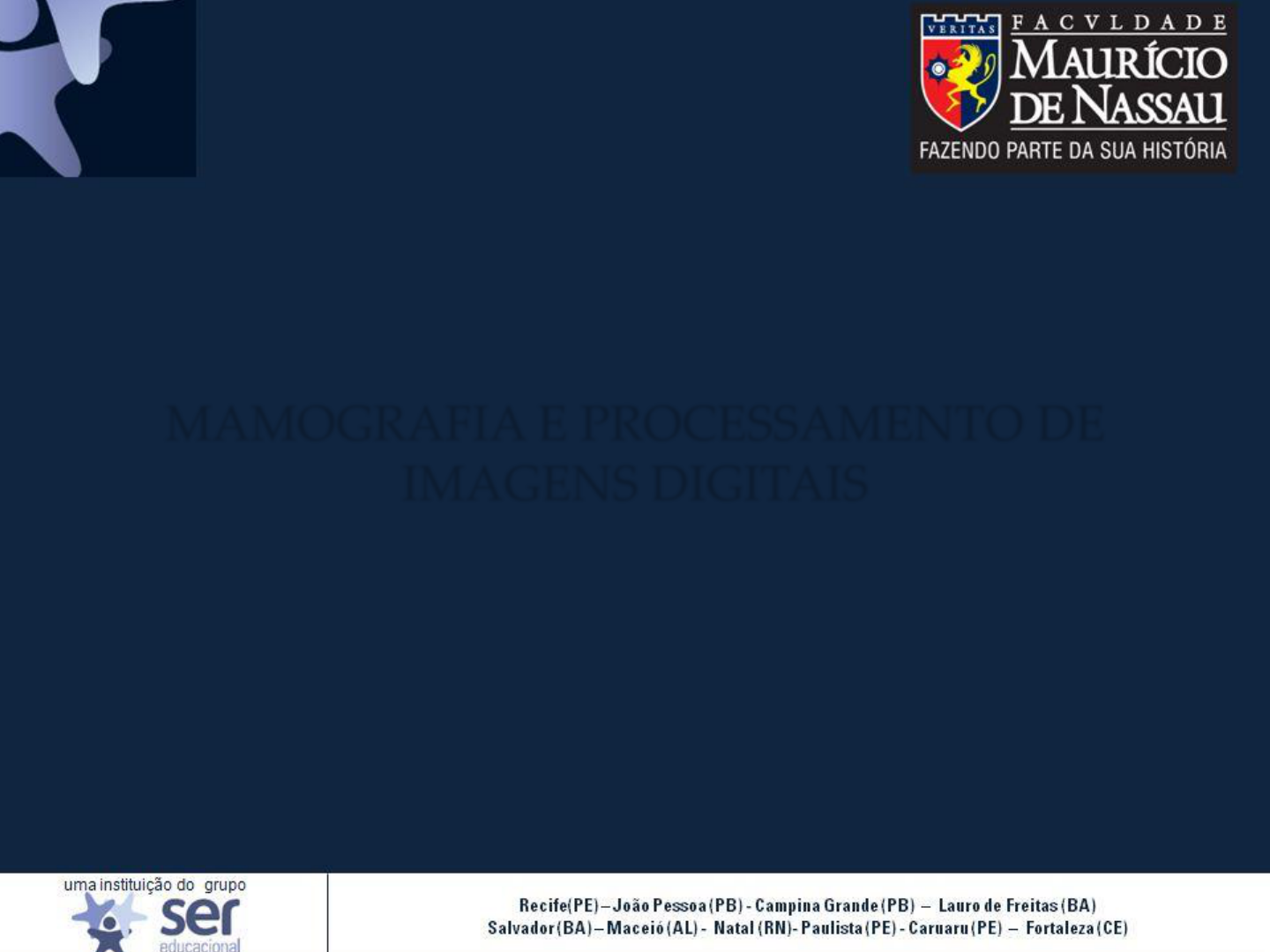 MAMOGRAFIA E PROCESSAMENTO DE IMAGENS DIGITAIS TNR EUDES INACIO DA SILVA Componentes de um equipamento de Radiografia Digital 1. Máquina de raios X; 2. Sensores: CCD (Charged Coupled Device), CMOS (Complimentary Metal Oxide Semiconductor), PSP (Photo-Stimulable Phosphor); 3. Scanner Laser scanner (PSP somente); 4. Computador com monitor e modem ou cabo de rede de alta velocidade; 5. Impressora; Detectores CCD e CMOS Estes sensores digitais são compostos de chip puro de silício dividido em vetor de pixels (elementos de imagem). Quando os raios X atingem a superfície do sensor, a energia é armazenada no pixel; a quantidade de energia armazenada é determinada intensidade do raios X que bate em um pixel particular. Devido à incidência de raios x no detector são geradas cargas elétricas. As cargas são então eletronicamente removidas, e na sequência, criam um sinal de uma voltagem proporcional à energia armazenada em cada pixel. Estes sinais produzem a imagem digital vista no monitor. Os sistemas CCD e CMOS produzem uma imagem "instantânea" e podem ser útil para emergências. PSP (Photostimulable phosphor) Estes fósforos absorvem a energia do raio X até certo ponto semelhante aos fósforos usados em telas intensificadoras. Raios X atingem o fósforo e excitam elétrons nos átomos, alguns dos quais produzem luz; mas a maioria dos elétrons ficam armadilhados (presos) dentro do fósforo. Quando o sensor é escaneado com um laser de rubi, os elétrons armadilhados são libertados, enquanto causando emissão de luz de curto-comprimento de onda na região azul do espectro eletromagnético. Quanto mais raios X absorvidos pelo fósforo, mais luminosa será a luz. A luz emitida é detectada por um tubo fotomultiplicador e a informação é digitalizada para formar a imagem. Sistema de detecção é um conjunto de semicondutores que recebem a radiação e a transformam em sinal elétrico; Sem intervenção do operador; Características físicas do detector digital de campo total têm demonstrado maior eficiência quanto à : Cintilador + CCD O dispositivo de carga acoplada (CCD) é um chip eletrônico (sensor) que contém elementos sensíveis à luz, similar aos CCDs encontrado em câmaras fotográficas. O processo de formação de imagem começa com a incidência dos raios X que saem dos pacientes e chegam a um material cintilador (iodeto de césio dopado com tálio, CsI:Tl, ou óxissulfito de gadolínio, Gd2O2S) que tem a propriedade de converter a energia dos raios X em luz. A luz alcança o CCD e, então, é transformada em cargas elétricas Esse sinal analógico, em forma de cargas, é convertido em sinal digital no conversor de sinal analógico- digital (analog- to-digital converter - ADC). • Segundo Coutinho et al. (UFRJ COPPE) as doses glandulares médias (DGMs), para pacientes que fazem o exame de mamografia digital (DR) são, em média, 33% mais baixas do que as que fazem em equipamentos convencionais (tela-filme). As DGMs para as pacientes que fazem o exame em equipamentos de radiografia computadorizada (CR) são, em média, 25% mais altas do que as que fazem em equipamentos convencionais. Sistemas digitais diretos Esses sistemas possuem muitos componentes : • Fonte de alta tensão; • Eletrodo do topo; • Camada dielétrica; • Fotocondutor; • Eletrodo de coleta; • Transistor de filme fino (TFF); • Capacitor de armazenamento de cargas; • Vidro como substrato. O componente principal é o fotocondutor, que geralmente é o selênio amorfo (a-Se), que tem a função de converter os fótons de raios X diretamente em cargas elétricas. Sensibiliza Documenta Verifica Processo Convencional Processo Digital Sensibiliza Verifica Documenta Pixel • É a menor parte de uma imagem digital e cada um destes pontos contém informações que determinam suas características. • Unidade de medida para descrever a dimensão geométrica de uma imagem. • Quanto mais pixel tiver uma imagem, melhor será a resolução. • Cada pixel carrega a informação sobre o nível de cinza ou cor que ele representa. Matriz • Número de linhas e colunas • Tamanhos das matrizes: 64x64 128x128 256x256 512x512 Detalhe da Imagem • Tamanho do pixel afeta o detalhe da imagem • Boa visibilidade de detalhe requer pixel pequenos que são selecionados com tamanho de matrizes grandes. • Campo de visão, que está relacionado com à área examinada. Capacidade de Armazenamento • Está relacionado ao número de pixel • Matrizes grandes têm muitos pixels, por isso necessitam de grande capacidade de armazenamento e tempo de processamento, comparado a matrizes de tamanho menor. Produção da Imagem Digital e Conversão • As imagens digitais não são formadas diretamente como as imagens radiográfica; elas são criadas por um processo de conversão. • O processo de conversão depende da fonte e forma como os dados ou imagens são adquiridos, que varia de uma modalidade de imagem para outra. Processamento da Imagem • O computador é parte do equipamento de processamento e pode ser programado para mudar as características da imagem de diferentes formas. • O equipamento determina um intervalo de localização da exposição e ajusta a sensibilidade efetiva do receptor e determina a condição da exposição atual. PROCESSAMENTO DA IMAGEM DIGITAL • Reduzir o ruído; Ajustar e otimizar as características de contraste; • Extrair características de regiões de interesse; • Aumentar a visibilidade de detalhes; A melhor resolução espacial Controle de Exposição Automático • Na mamografia digital, o brilho da imagem e o contraste são controlados por ajustes no display do sistema, independentemente da aquisição da imagem. • É determinar o nível de radiação para determinar a diferença entre o sinal e o ruído e garantir que a intensidade de radiação não excederá a capacidade do detector ou digitalizador. São feitas duas incidências em cada mama e, eventualmente