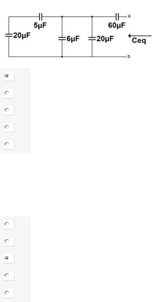 Questão 1/4 - Instalações Elétricas Industriais Capacitor é um componente que armazena cargas elétricas num campo elétrico, acumulando um desiquilibrio interno de carga elétrica. Calcule a capacitância equivalente vista pelos terminais a e b do circuito a seguir: A 20μF20μF B 111μF111μF C 40μF40μF D 2μF2μF E 2F2F Questão 2/4 - Instalações Elétricas Industriais Os motores, os transformadores e outros equipamentos de unidades consumidoras têm como força a energia elétrica, que é utilizada de duas formas distintas: a energia reativa e a energia ativa. A primeira delas, a energia reativa não realiza trabalho efetivo, mas é necessária e consumida na geração do campo eletromagnético responsável pelo funcionamento de motores, transformadores e geradores. Qual é a unidade de medida da energia reativa? A V B A C kVArh D kW E Km Questão 3/4 - Instalações Elétricas Industriais Um capacitor é um dispositivo que consiste em duas placas condutoras (chamadas armaduras), separadas por um material isolante (dielétrico), que serve para armazenar cargas. A capacidade que tem um capacitor para armazenar cargas depende da sua capacitância (C) que, por sua vez, depende da área das placas, da espessura do dielétrico e do material de que é feito o dielétrico. Calcule a reatância de um capacitor de 5μF5μF na frequência de 50Hz (use o valor com arredondamento) A 5Ω5Ω B 50Ω50Ω C 600Ω600Ω D 637Ω637Ω E 5∗10−2Ω5∗10−2Ω Questão 4/4 - Instalações Elétricas Industriais Circuitos na prática possuem, ambos, resistência e indutância, isto significa que a corrente, ao percorrer tal circuito, encontrará dois tipos de oposição: a oferecida pela resistência e a oposição da força eletromotriz de autoindução (reatância indutiva). Tomamos como exemplo o circuito em paralelo a seguir: A partir dessas informações calcule a impedância total (Z) desse circuito. Qual será o valor de Z? A 48Ω48Ω B 60Ω60Ω C 80Ω80Ω D 140Ω140Ω E 20Ω20Ω