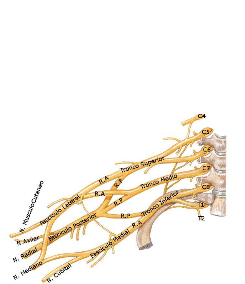 INVERVAÇÃO DO MS O plexo braquial - Ramos Anteriores de C5, C6, C7, C8 e T1. Por que C8?! R: Porque de C1 sai tanto um ramo por cima quanto por baixo, isso faz aumentar um número na contagem total. C5+ C6= tronco superior C7= tronco médio C8+ T1= tronco inferior Os troncos se bifurcam em um ramo anterior e um ramo posterior Ramo anterior superior + ramo anterior médio = fascículo lateral Ramo anterior inferior= fascículo medial Ramo posterior superior+ ramo posterior médio + ramo posterior inferior= Fascículo posterior Dos fascículos, vão se gerar nervos: Fascículo lateral= nervo musculo cutâneo Fascículo posterior= nervos radial e axilar Fascículo medial= nervo cubital Fascículo lateral + medial = nervo mediano RAMOS DO PLEXO BRAQUIAL C5: nervo dorsal da escápula (inerva o levantador da escápula) C5, C6 e C7: nervo torácico longo (inerva o serrátil anterior) LESÃO= ESCÁPULA ALADA Tronco superior: nervo supraescapular e nervo para o subclávio Fascículos: - Lateral: nervo peitoral lateral (inerva o peitoral) - Medial: nervo peitoral medial, nervo cutâneo medial do braço (é apenas sensorial e inerva a região medial do braço) e nervo cutâneo medial do antebraço. -Posterior: 1, 2, 3, sendo 1 e 3 nervos subescapulares(inerva o subescapular e o redondo maior) e o 2, toracodorsal. RAMOS TERMINAIS Nervo axilar: músculos deltoide e redondo menor LESÃO: incapacidade de abdução até 45° do braço e atrofia da região do ombro Nervo musculo cutâneo: é motor e sensitivo. Inerva musculatura anterior do braço e antebraço, percorre a face lateral e se torna cutâneo, sendo ali chamado de cutâneo lateral do antebraço. LESÃO: PARESIA E INCAPACIDADE DE FLEXÃO E EXTENSÃO DO ANTEBRAÇO. Nervo radial: parte posterior do membro, tríceps braquial. No antebraço, inerva o grupamento extensor e se encontra na borda lateral. Na mão ele é apenas cutâneo. LESÃO: MÃO CAÍDA, FLEXÃO DO PUNHO. Nervo ulnar: não atua no braço, já no antebraço, atravessa pelo sulvo do nervo ulnar, sempre no lado medial e inerva os músculos mediais da face anterior, como o flexor ulnar do carpo. Passa no lado medial do punho, por baixo do hámulo do hamato. Na mão, se distribui para a região hipotenar, inerva a maioria dos músculos médios, excetos os lumbricais, e o adutor do polegar. LESÃO: NÃO FLETE OS DOIS ÚLTIMOS DEDOS E NEM FAZ O MOVIMENTO DE OPONÊNCIA. Nervo mediano: não atua no braço, atua na parte média do antebraço, em toda a musculatura não inervada pelo ulnar. Na mão, passa por dentro do túneo do carpo. LESÃO: MÃO DE BENÇÃO, ATROFIA DA REGIÃO TENAR, MÃO SEMIESCA .