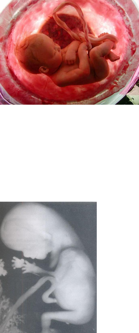 Período Fetal: Nona semana ao nascimento: Resumo de eventos de maior relevância Nona a décima segunda semana (9-12s) Aceleração do crescimento corpóreo em relação à cabeça A formação de urina inicia entre a semana 9 e 12 Face larga, olhos separados e pálpebras fundidas (semana 9) O intestino já retornou para o abdome na semana 11. Final de 12 semanas já aparecem os centros de ossificação primária A genitália externa masc. e fem. assemelham-se até o fim da nona semana; A forma fetal madura não está estabelecida até o fim da semana 12 Um feto de 11 semanas Semanas 13 a 16 Crescimento rápido Movimentos dos olhos em 14 semanas Movimentos coordenados dos membros em 14 semanas Determinação do padrão de pelos do couro cabeludo na semana 14 Reconhecimento da genitália externa na semana 14 Cabeça pequena na semana 16 em relação ao feto de 12s Na semana 16 os ovários já diferenciaram e o feto tem características mais humanas FETO DE 13 SEMANAS Décima sétima à vigésima semana (17-20s) movimentos fetais (“chutes”) pela mãe Pele fetal coberta pelo vernix caseosa com função protetora. Corpo coberto por uma lanugem ou lanugo, auxiliando manter a vernix caseosa presa à pele Visibilidade de cabelos e sobrancelhas em 20 semanas Formação da gordura parda Ganho significativo de peso Presença de unhas nos dedos das mãos e dos pés (24semanas) Aumento da capacidade fetal de reagir a sons Início da secreção do surfactante (24 semanas) pelas células epiteliais secretoras (pneumatócitos II) FETO DE 17 SEMANAS Semanas 26-29 Maior desenvolvimento pulmonar Amadurecimento do SNC no controle de ritmos respiratórios da temperatura corpórea Com 26 semanas os olhos estão abertos Quantidade de gordura subcutânea suficiente para eliminação de rugas Término da eritropoese no baço à semana 28, quando a medula óssea torna-se a principal fonte deste processo. Semanas 30-34 Reflexo pupilar pode ser induzido em 30 semanas Pele rosada e lisa Membros com aspecto rechonchudo OBS: Nascimento fetal com peso na média nasce neste período é classificado como prematuro pela data OBS2: Em contraste aos prematuros classificados pelo peso. Semanas 35-38 Com 35 semanas o feto têm uma preensão palmar forte e exibe uma orientação espontânea para a luz Com 36 semanas, as circunferências da cabeça e do abdome são quase iguais No final da gestação (37-38s) o sistema nervoso está maduro para execução de funções integrativas Durante as últimas semanas gestacionais o feto ganha cerca de 14g de gordura por dia A cabeça continua sendo uma das maiores partes do feto FETO DE 36 SEMANAS NASCIMENTO... Fatores que influenciam o crescimento fetal: Glicose – fonte energética primária para o metabolismo e crescimento fetal Insulina; IGL - I – estimula o crescimento fetal Agentes relacionados ao R.C.I.U. Tabagismo - é associado ao Gestações múltiplas Drogas Fluxo uteroplacentário deficiente Defeitos placentários Fatores genéticos Glicose – fonte energética primária para o metabolismo e crescimento fetal Insulina; IGL - I – estimula o crescimento fetal Agentes relacionados ao R.C.I.U. Tabagismo - é associado ao Gestações Técnicas de avaliação do estado fetal Amniocentese diagnóstica Exame de vilosidades coriônicas Cultivo Celular Transfusão fetal intra-uterina em casos urgentes de D.H.R.N. Amostragem de sangue por punção percutânea do cordão umbilical Ultra-sonografia Dosagem de alfa-fetoproteína ESQUEMA DA AMNIOCENTESE Exercícios Clínicos 1) Discuta a sugestão de que a suplementação com vitaminas à época da concepção pode evitar patologias como a espinha bífida 2) Qual o risco de indução de aborto ou de infecção materna ou fetal durante uma amniocentese? 3) Em que época da gestação a mãe é capaz “bebê chutar”? Qual o significado desta ocorrência? 4) Qual o significado dos termos natimorto e sofrimento fetal? Placenta e Membranas Fetais Placenta É um órgão materno-fetal, de origem dupla: Porção fetal – originária do saco coriônico Porção materna – derivada do endométrio Funções da placenta e das membranas fetais: Proteção Nutrição Respiração Excreção Produção de hormônios Metabolismo da placenta Síntese de glicogênio Síntese de colesterol Síntese de ácidos graxos Função de transporte Secreção endócrina Mecanismos de transporte via membrana placentária: Difusão simples Difusão facilitada Transporte ativo Pinocitose Hormônios protéicos sintetizados pela placenta hCG hCS (somatotrofina coriônica humana) ou hPL (lactogênio placentário humano) hCT (tireotrofina placentária humana) hCACTH (corticotrofina coriônica humana) OBS: É importante LEMBRAR que a hCG começa a ser secretada pelo sinciotrofoblasto durante a segunda semana e as concentrações no sangue materno e na urina chegam ao máximo na oitava semana. Anormalidades placentárias A) Placenta acreta - Refere-se à aderência anormal de vilosidades coriônicas ao miométrio da parede uterina B) Placente percreta - Quando as vilosidades coriônicas penetram em toda a profundidade do miométrio ou no perimétrio (cobertura periotoneal) C) Placenta Prévia Ocorre quando o blastocisto se implanta próximo ao orifício interno do útero ou mesmo sobre este orifício Sangramentos gestacionais tardios podem estar associados à esta patologia placentária (vide VÍDEO) e nesta circunstância, o feto é retirado via cesariana devido à obstrução placentária na região do orifício uterino interno. Cordão umbilical Possui duas artérias e uma veia envolvidas por tecido conjuntivo mucóide (geléia de Wharton) Cordões muito longos tem a tendência ao prolapso. Cerca de 1% das gestações nós verdadeiros formam-se no cordão, com possibilidade de morte fetal resultante de anóxia. Ocasionalmente ocorre passagem de uma alça do cordão em torno do feto (vide VÍDEO). Ultra-sonografia doppler pode ser usada para detecção de an