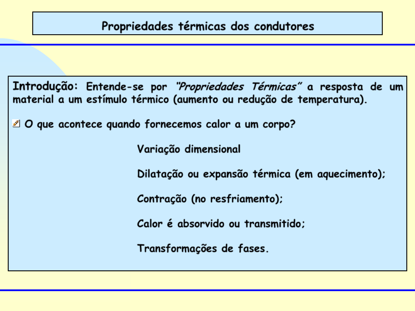 1 Propriedades térmicas dos condutores Introdução: Entende-se por “Propriedades Térmicas” a resposta de um material a um estímulo térmico (aumento ou redução de temperatura). O que acontece quando fornecemos calor a um corpo? Variação dimensional Dilatação ou expansão térmica (em aquecimento); Contração (no resfriamento); Calor é absorvido ou transmitido; Transformações de fases. 2 Propriedades térmicas dos condutores Todos os corpos possuem energia interna. Esta energia está de certa maneira "armazenada" nos corpos, e vem, entre outras coisas, do movimento ou da vibração dos átomos e moléculas que formam o corpo. Veja a animação abaixo. Os pontinhos vermelhos representam as moléculas de um sólido qualquer. Logicamente este é um exemplo bem simplificado. As vibrações são muito mais rápidas e não ocorrem de maneira tão organizada assim. Nos sólido as moléculas não se locomovem de um lado para outro do material, somente vibram. No caso dos líquidos e gases, as moléculas conseguem, além de vibrar, locomover- se de um lado para o outro, principalmente nos gases. 3 Propriedades térmicas dos condutores A energia vibracional de um material consiste de uma série de ondas elásticas de comprimento de onda muito pequeno e freqüências muito altas, que se propagam através do material com a velocidade do som. A energia vibracional é quantizada, e um quantum desta energia é chamado fônon (designa um quantum de vibração em um retículo cristalino rígido). O fônon é análogo ao quantum de radiação eletromagnética, o fóton. O espalhamento dos elétrons livres que ocorre durante a condução elétrica é devido às ondas vibracionais. O estudo dos fônons é importante na física do estado sólido por facilitar a compreensão de muitas propriedades dos sólidos, como por exemplo o calor específico, a condução térmica, a condutividade elétrica e a propagação do som. 4 Propriedades térmicas dos condutores Fônons = ondas elásticas 5 Propriedades Térmicas mais importante: Resistência ao calor; Resistência ao frio; Calor específico; Condutividade térmica; Dilatação. 6 Propriedades térmicas dos condutores Capacidade térmica molar: ou capacidade calorífica, C, (J/mol.K) de um material é a quantidade de energia requerida para provocar a variação de temperatura desse material. Para normalizar - a quantidade de energia (calor) (J) necessária para aumentar em um grau (K ou C) a temperatura de um mol de um material. Esta propriedade representa a capacidade do material de absorver calor do meio circundante. Na maioria dos sólidos, o conteúdo térmico e a energia vibracional dos átomos estão diretamente relacionados. A contribuição eletrônica para a capacidade térmica é, em geral, insignificante, a não ser para temperaturas próximas a zero graus Kelvin. 8 Propriedades térmicas dos condutores Calor especifico de uma substância: Calor específico de uma substância (c) a razão entre a quantidade de calor que a substância troca e o produto entre a sua massa e a variação de temperatura sofrida. Esta grandeza tem sua unidade de medida no Sistema Internacional de Unidades ( S.I ) o J / kg.K, porém a mais usada é a cal/g.oC Quantidade de calor Massa vezes variação de temperatura 9 Propriedades térmicas dos condutores Os fenômenos de transferência de calor de um corpo podem ser medidos através da equação da calorimetria: TcmQ .. onde: Q quantidade de calor m massa c calor específico T variação de temperatura Observações: T > To T > 0 Q > 0 (calor recebido pelo corpo: o corpo ganha calor) (+) T < To T < 0 Q < 0 (calor cedido pelo corpo: o corpo perde calor) (-) 10 Significado Físico do Calor Específico Digamos que o calor específico de uma determinada substância seja expresso em cal/g.oC, isto significa que o calor específico informa a quantidade de energia, em calorias, que deve ser fornecida a cada 1 grama dessa substância para que a sua temperatura se eleve em 1oC. Por exemplo, fornecendo-se 1cal a 1g de água, sua temperatura se elevará de 1oC. Já no caso do alumínio, basta fornecer 0,22cal a 1g do mesmo, para que sua temperatura aumente de 1oC. Quanto menor o calor específico maior é a capacidade de absorver calor. Calor específico de alguns materiais: 11 Comparação entre calores específicos materiais: 12 Propriedades térmicas dos condutores Condução térmica: fenômeno pelo qual o calor é transportado em um material de regiões de alta temperatura para regiões de baixa temperatura. Condutividade térmica: habilidade do material de transferir calor de uma região mais quente para uma região mais fria. A condutividade térmica pode ser definida em termos de: A equação acima só é válida quando o fluxo de calor for estacionário (fluxo de calor que não se altera com o tempo) dx dT k A Q O calor é transportado de regiões de quentes para regiões frias. Q/A = fluxo de calor k = condutividade térmica dT/dx = gradiente de temperatura 13 O fluxo de calor é proporcional ao gradiente de temperatura na direção de propagação do calor, ou seja, à diferença de temperatura a cada unidade de comprimento ao longo do percurso percorrido pelo calor, ou seja: Gradiente de temperatura Condutividade térmica Condutividade Térmica (k): Habilidade do material de transferir calor de uma região mais quente para uma região mais fria. Condutividade térmica (k): 14 A constante k tem certa correspondência com a lei de Ohm, que relaciona a corrente elétrica (i) que passa através de um material com a tensão (V) aplicada no material. V é equivalente ao gradiente de temperatura (quanto maior a diferença de temperatura maior o transporte de calor), i é equivalente ao fluxo de calor e a resistência elétrica (R) é equivalente ao inverso da condutividade térmica (a resistência elétrica representa a resistência que o material oferece ao transporte de carga elétrica. A condutividade térmic