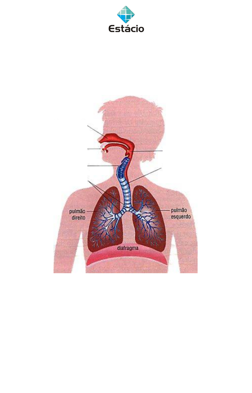 Curso: Farmácia/Fisioterapia Professor (a): Dagmar T. V. de Queiroz Disciplina: Anatomia Sistêmica ESTUDO DIRIGIDO SISTEMA RESPIRATÓRIO Identifique as estruturas indicadas pelas setas: [fechar resposta] a) Sistema respiratório. b) Um: traquéia; dois: brônquios: três: bronquíolos; quatro: parede pulmonar ou simplesmente pulmão. c) Alvéolos pulmonares. d) Alvéolos pulmonares. 02) Descreva o caminho que o ar atmosférico percorre no aparelho respiratório humano, citando seus segmentos anatômicos. [fechar resposta] O ar penetra pelas fossas nasais, passa pela faringe, laringe e traquéias e chegando aos pulmões, onde segue pelos brônquios e bronquíolos até chegar aos alvéolos, onde ocorrem as trocas gasosas. A diferença entre o ar inspirado e expirado está na concentração de oxigênio e gás carbônico. No ar inspirado há maior quantidade de oxigênio e menor de gás carbônico. No ar expirado ocorre o contrário, há maior concentração de gás carbônico e menor de oxigênio. 03) Explique o que é, e dê a função do diafragma. 04) A faringe é um órgão comum a dois sistemas orgânicos. Quais são esses sistemas? 05) O que são alvéolos pulmonares? Qual a sua função? 06) A respiração pela boca é útil quando precisamos de mais oxigênio (durante um exercício físico, por exemplo), porém é muito melhor respirarmos pelo nariz. Por quê? [fechar resposta] a) O ar passa pelas fossas nasais, faringe, laringe, traquéia, brônquios, bronquíolos ë alvéolos pulmonares. Sendo que os bronquíolos e alvéolos pulmonares fazem parte dos pulmões. b) O diafragma é um músculo que separa o tórax do abdome, sua função é auxiliar os movimentos de expansão e contração da caixa torácica e dos pulmões. O diafragma e os músculos intercostais estão envolvidos nos mecanismos de inspiração e expiração do ar. c) A faringe é um órgão comum aos sistemas digestivo e respiratório. d) Alvéolos pulmonares são estruturas em forma de "cachos" localizadas nas extremidades dos bronquíolos pulmonares. É o local onde ocorre a hematose, ou seja, a transformação do sangue venoso em arterial. e) O ar que entra pela boca não é filtrado e aquecido. As fossas nasais têm a função de aquecer, filtrar e umedecer o ar. A filtração ocorre através de um conjunto de cílios. 07) De que maneira o muco secretado pela nossa traquéia protege nosso aparelho respiratório? 08) A epiglote e as cordas vocais são importantes estruturas do aparelho respiratório. Onde se localizam? Qual a função de cada uma? 09) Como o oxigênio e o gás carbônico são transportados através do sangue? 10) "A respiração pulmonar baseia-se essencialmente no transporte de oxigênio do ar ambiental para as células e do transporte do gás carbônico das células para a atmosfera." Responda: a) O que é feito com o oxigênio nas células? b) Explique como se realiza o transporte de gás carbônico? 11) Leia atentamente o texto a seguir: "Respirar é uma ação automática. Nós respiramos enquanto estamos acordados ou dormindo sem que, para isso, tenhamos que fazer qualquer esforço consciente. Podemos variar o ritmo da respiração, como em geral acontece quando paramos para pensar sobre isso, e podemos conscientemente respirar mais profundamente". O que não podemos fazer é parar de respirar por mais de um minuto. Se a respiração é contida por muito tempo, nosso encéfalo assume o controle, enviando automaticamente impulsos nervosos ao diafragma e aos músculos intercostais, instruindo-os a se contraírem. O ritmo e a profundidade da respiração também são controlados quimicamente. Durante o esforço, os músculos aumentam a produção de gás carbônico, que começa a se acumular no sangue. O centro respiratório do bulbo detecta esse aumento e acelera o ritmo e a profundidade dos movimentos respiratórios de maneira a eliminar o excesso indesejável de gás carbônico através dos pulmões."". Responda: a) Por que respiramos diferentemente quando estamos dormindo e quando corremos? b) Qual o principal mecanismo que nosso corpo usa para informar a necessidade de mudar o ritmo respiratório? [fechar resposta] a) O desenho indica respiração cutânea. Um invertebrado terrestre que apresenta esse tipo de respiração é a minhoca (anelídeo). Um vertebrado terrestre que apresenta esse tipo de respiração na fase adulta é o sapo (anfíbio da ordem anura). b) Porque os anfíbios (sapos, rãs e pererecas) possuem um pulmão muito pequeno que não consegue realizar trocas gasosas necessárias para a vida do animal, por isso que esses animais possuem respiração cutânea na fase adulta. 12) O que provoca a entrada e a saída de ar na respiração pulmonar, sabendo-se que os pulmões não possuem movimentos ativos? [fechar resposta] a) Os animais que possuem respiração cutânea possuem: epiderme fina, úmida e permeável e bem vascularizada. b) É o processo onde o gás carbônico, produzido no organismo é trocado pelo oxigênio atmosférico. Realizada por processo mecânico (difusão) nos pulmões ou outras estruturas respiratórias dos animais como poríferos e cnidários. c) Contrações da musculatura intercostal nos representantes das classes dos répteis, aves e mamíferos. Sendo que os mamíferos possuem também o diafragma para auxiliar nos movimentos de inspiração (entrada do ar) e expiração (saída do ar). 13) As hemácias ou glóbulos vermelhos têm vida média de apenas 120 dias no sangue circulante. Isso significa que essas células têm que ser constantemente produzidas. Responda: a) Em que local do organismo ocorre a produção de hemácias? b) Qual a principal substância presente nas hemácias? Que elemento da dieta é essencial para sua formação? c) Aponte uma situação que estimula o aumento da produção de hemácias. 14) Vários atletas do continente americano foram convidados a participar de uma competição de atletismo na cidade do Rio de Janeiro. Ass