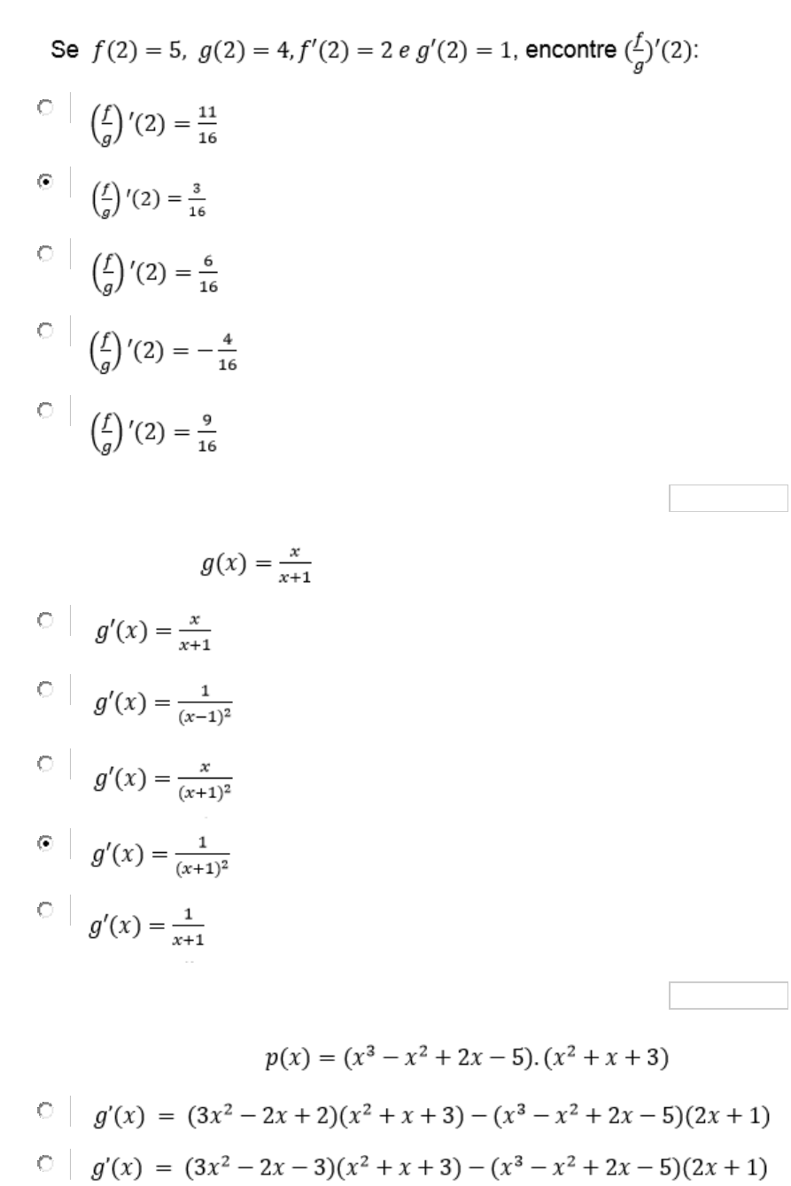 PERGUNTA 1 a. b. c. d. e. 0,175 pontos PERGUNTA 2 A derivada da função é a. b. c. d. e. 0,175 pontos PERGUNTA 3 A derivada da função a. b. c. d. e. 0,175 pontos PERGUNTA 4 A reta tangente ao gráfico da funçãono ponto x = 1 é a. b. c. d. e. Determine a derivada da função f(x) = sen x. cos x a. f´(x)= 1 b. f ´(x)= 2 cos2 x c. f ´(x)= cos2 x - sen2 x d. f ´(x)= 2sen2 x e. f ´(x)= sen2 x + cos2 x