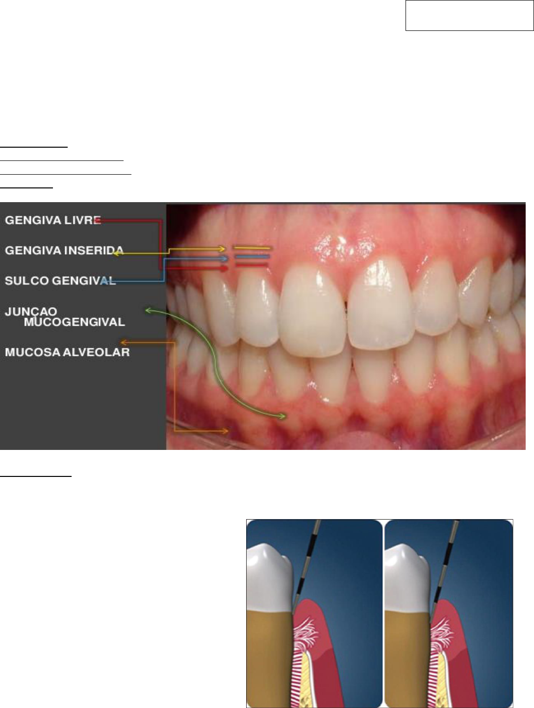 Periodontia ANATOMIA E HISTOLOGIA DO PERIODONTO Periodonto de proteção: Gengiva Periodonto de sustentação: Ligamento periodontal; Osso alveolar; Cemento radicular. TECIDO GENGIVAL Caracteriza o periodonto de revestimento; Barreira de proteção. Mucosa oral – mucosa mastigatória (gengiva e palato duro); Mucosa especializada – recobre o dorso da língua; Mucosa de revestimento – recobre o restante. Gengiva: parte da mucosa mastigatória que reveste o processo alveolar e circunda a porção cervical do dente. Coloração róseo claro. Gengiva livre – cor rósea, superfície opaca e consistência firme; - Vestibular/lingual e palatina, também chamada de gengiva interdental; - Margem gengival livre (MGL) até a ranhura gengival (30-40% da população) MARGEM GENGIVAL ↓ FREQUENTEMENTE ARREDONDADA ↓ PEQUENA INVAGINAÇÃO DE SULCO ENTRE O DENTE E A GENGIVA PERI: em torno de. ODONTO: dente Gengiva interdental (papila interdental) – forma: contato entre os dentes, largura da superfície proximal destes pela anatomia da JCE. Dentes anteriores: forma piramidal –ponto de contato; Dentes posteriores: forma achatada (sela) –superfície de contato; Área de COL: área separada pela porção vestibular e versão lingual/palatina Epitélio delgado não queratinizado. Gengiva inserida – textura firme e cor rósea Pontilhados delicados (aspecto casca de laranja) Da ranhura gengival à linha ou junção mucogengival firmemente inserida no osso alveolar e cemento. Mucosa alveolar – frouxa, móvel, coloração vermelho mais escuro. EPITÉLIO Protege as estruturas mais profundas; Permite a troca seletiva com o ambiente bucal. 3 tipos de epitélio: Oral – voltado para a cavidade oral/externo. Do sulco – voltado para o dente, sem ficar em contato com a superfície do dente (sulcular). Juncional – promove o contato da gengiva com o dente. Epitélio oral (bucal) – Queratinócitos: 90% Melanócitos; Células de Langerhans; Células inflamatórias; Células de Merkel. Gengiva Epitélio oral externo Epitélio pavimentoso estratificado queratinizado Camada córnea: Célula sofreu diversas alterações; Perda da capacidade de produção de energia; Citoplasma preenchido por queratina; Queratinização do epitélio; Paraqueratinizada com núcleo; Ortoqueratinizada sem núcleo. CÉLULAS DE LANGERHANS: células de defesa CÉLULAS DE MERKEL: função sensorial e tátil. Camada granulosa: Grânulos de queratinócitos; Diminuição de organela; Transição acentuada das células entre a camada granular e córnea; Processo de Queratinização. Camada espinhosa: Poliédricas; Hemidesmossomos; Projeções citoplasmáticas curtas – espinhos. Camada basal: Cilíndricas ou cubicas; Capacidade de divisão; Muitas organelas. *A união e interdigitação das cristas epiteliais e das papilas do tecido conjuntivo resulta nos “furinhos” da gengiva inserida (aspecto de casca de laranja). EPITÉLIO DO SULCO (ES) Epitélio pavimentoso estratificado queratinizado; Semelhante ao epitélio oral; Se estende da crista da margem gengival até o início do epitélio Juncional; Células cúbicas. EPITÉLIO JUNCIONAL (EJ) Epitélio pavimentoso estratificado queratinizado; Porção coronal mais espesso (15 a 30 camadas); EJ aderida a superfície dentária através de uma lâmina basal (semelhante a camada basal) Hemidesmossomos – reforçado p/ fibras gengivais; Em constante renovação (mitose) células p/ sulco; 3 zonas do epitélio Juncional: apical – células germinativas; Médio – adesividade; Coronal – maior permeabilidade. FLUIDO GENGIVAL Substancia eliminada dentro do sulco –proveniente do tecido conjuntivo. Função: limpar o sulco; Adesividade ao epitélio –produção de proteína plasmática-; Atividade antimicrobiana; Iniciar a atividade dos anticorpos; Na inflamação –fluido aumentado- “exudato inflamatório”. A cárie chega através da zona coronal TECIDO CONJUNTIVO (TC) Lâmina própria; Tecido predominante na gengiva; Constituído por: fibras colágenas (60% do volume total); Fibroblastos (5%); Vasos, nervos e matriz extracelular (35%). FIBRAS GENGIVAIS Fibras circulares (FC); Fibras dentogengivais (DGV); Fibras dentoperiosticas (DPF); Fibras transeptais (TF). Função: Proporcionar tonicidade e resistência à gengiva marginal livre; Contorno e suporte para a gengiva inserida; Proporcionar a posição mais coronária da inserção do tecido conjuntivo na superfície dentária; Protegem o epitélio Juncional e o ligamento periodontal; Dão suporte à papila dentária. Outros feixes de fibra: oxitalâmicas; Reticulares; Elásticas. Se espalham ao redor ou entre os feixes principais. CÉLULAS Fibroblastos; Mastócitos; Células endoteliais; Macrófagos. Leucócitos PMN; Linfócitos; ESPAÇO BIOLÓGICO Espaço biológico – distancia biológica (aproximadamente +/- 3,0mm) Epitélio biológico (2,04mm): Epitélio Juncional – 0,94mm + Inserção conjuntiva – 1,07mm Distância biológica (2,73mm): Início no sulco gengival – 0,69mm Epitélio juncional – 0,97mm Fim na inserção conjuntiva – 1,07mm PERIODONTO DE SUSTENTAÇÃO Ligamento periodontal: é um tecido conjuntivo frouxo, ricamente vascularizado e celular, que circunda as raízes dos dentes e une o cemento radicular à lamina ou ao osso alveolar. Em direção coronal, esse ligamento é continuo, com a lâmina própria da gengiva e está separado delas pelos feixes de fibras colágenas que ligam a crista alveolar a raiz (as fibras da crista alveolar). Funções: proporcionar um invólucro dos tecidos moles para proteger vasos e nervos de injurias mecânicas; Transmissão de força ao osso; Fixar um dente ao osso; Amortecer, resistir ao impacto de forças oclusais; Fonadora e remodeladora de cemento, ligamento e osso alveolar; Função nutricional (para cemento, osso e gengiva) e sensorial (tato, pressão e dor); Drenagem linfática. Constituído por: elementos celulares; Fibras; Substâncias fundamentais Elementos
