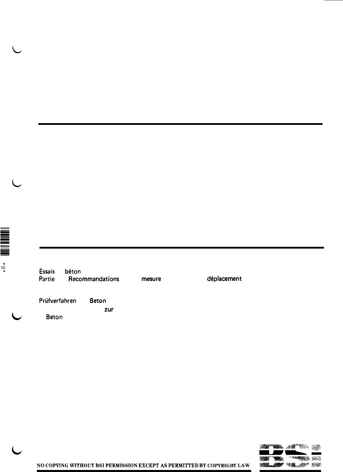 BS 1881 : Part 203 : 1986 UDC 666.972.017 : 691.32 : 620.1 British Standard Testing concrete Part 203. Recommendations for measurement of velocity of ultrasonic pulses in concrete Essais du b&on Partie 203. Recommandations pour la mesure de la vitesse de dbplacement des impulsions ultrasonores dans le b&on Prtifverfahren von Beton Teil 203. Empfehlungen zur Messung der Geschwindigkeit von Ultraschallimpulsen in Beton NO COPYING WITHOUT BSI PERMISSION EXCEPT AS PERMITTED BY COPYRIGHT LAW BS 1881:Part203: 1986 Foreword d This Part of BS 1881 has been prepared under the direction of the Cement, Gypsum, Aggregates and Quarry Products Standards Committee. It supersedes BS 4408 : Part 5 : 1974, which is withdrawn. All aspects of testing concrete are being included as Parts of BS 1881, from sampling fresh concrete to assessing concrete in structures. Part 201 gives general guidance on the choice of nondestructive test methods and should be consulted for advice on methods which can be used to complement the measurement of ultrasonic pulse velocity. Ultrasonic testing of concrete has been in use in a large number of countries for many years, in laboratories, in precast works and on site. The technique generally used is the measurement of ultrasonic wave group velocity from the transit time of a pulse between separate transmitting and receiving transducers through a known path distance in the concrete. This provides a measurement of the mean ratio of elastic stiffness to density along the path and has been found to be a useful index of concrete quality. The velocity is a function of the composition, degree of compaction, maturity and free water content which are inherent in concrete products and structures. Under certain conditions and for properly defined ranges of material, useful correlations may be established between the velocity and properties such as the modulus of elasticity and strength. This ultrasonic technique is completely distinct from the pulse-echo technique commonly used for the detection of localized defects in metals. The high frequency waves necessary for metals cannot travel through concrete as they are rapidly scattered and dispersed by the aggregate particles and pores. However, individual defects can be detected if they are sufficiently extensive to influence pulse transit times by increasing the effective path length or cutting out the signal altogether. All ultrasonic pulses passing through concrete are d attenuated by an amount depending on their frequency and the properties of the concrete. This attenuation is not easy to measure and techniques based on this aspect of pulse propagation have not been widely used, but helpful additional information may be obtained under certain circumstances. Specialist literature should be consulted. This standard is concerned with the measurement of the velocity of transmission of longitudinal ultrasonic pulses through concrete and it is hoped that better understanding of the measuring technique will result from its use. It includes some recommendations on the interpretation of test results and their correlation with elastic modulus and strength tests. Compliance with a British Standard does not of itself confer immunity from legal obligations. L 0BNID Amendment No. 1 AMD 6659 published and effective from 28 February 1991 toBS1881 :Part203: 1986 Testing concrete Part 203. Recommendations for measurement of velocity of ultrasonic pulses in concrete Revised text ----------------___------------------------------- AMD 6669 Clause 5.5 Setting the zero for the timing equipment February 1991 In paragraph 2 delete the second sentence and substitute the following: ‘A bar having a pulse transit time of about 25 ps is suitable (see also 5.6) .’ L AMD 6669 February 1991 Clause 5.6 Checking the accuracy of transit time measurements In paragraph 2, line 3 delete ‘accurately’ and substitute the following: ‘to an accuracy of + 0.2 vs. This performance check should be carried out at intervals no longer than 5 years or if the instrument is damaged or malfunctions in such a way that it has to be returned to the manufacturer for repair. In all cases the performance check should be carried out and certified either by the manufacturer or by an accredited laboratory, in both cases using reference bars of which the transit times are traceable to the National Standard of Time.’ Delete note 1. Delete paragraph 3 and note 2 and substitute the following: ‘The two reference bars should have pulse transit times of about 25 ps and 100 ps, respectively, and these times should be marked on the bars to the nearest 0.1 vs. The shorter of the reference bars should first be used to set the zero for the equipment, as explained in 5.5. The longer of the reference bars should then be used to check the accuracy of pulse transit time measurement by the equipment. Measurements are made on these reference bars by placing a transducer at each end and taking the transit time reading as described in 5.4. The measurement obtained should not differ from the known value for the longer reference bar by more than f 0.5 %.’ -------------------------------------------------- AhlD 6669 February 1991 Clause 9.3 Estimating the depth of a surface crack Delete equation 6 and substitute the following: p; 3Tz2+2T3 ’ -25 , T2 T3 ) 1 AMD 6669 Clause 12 Determination of the modulus of elasticity and dynamic Poisson’s c February 1991 ratio Delete equation 10 and substitute the following: ‘(1 +u) (1 - 20) = 4n2 L2 1O-6 ’ (1 -u) V2 --________-_________---------------- -------- _----- L AMD 9999 February 1991 Table 3. Values of dynamic Poisson’s ratio Delete the heading to column 1 and substitute the following: ‘n L lOma ’ V ------_--__--_______------------------------------ c 9102 CAB/4 3 Amendment No. 2 published and effective from 30 August 1991 toBS1661: Part203: 1966 Testing concrete Part 203. Recommendations for measurement of velocity of ultrasonic pulses in concrete