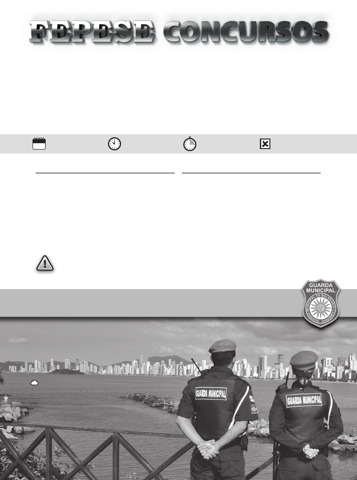 Instruções Para fazer a prova você usará: este caderno de prova; um cartão-resposta que contém o seu nome, número de inscri- ção e espaço para assinatura. Verifique, no caderno de prova, se: faltam folhas e a sequência de questões está correta. há imperfeições gráficas que possam causar dúvidas. Comunique imediatamente ao fiscal qualquer irregularidade. Atenção! Não é permitido qualquer tipo de consulta durante a realização da prova. Para cada questão são apresentadas 5 (cinco) alternativas dife- rentes de respostas (a, b, c, d, e). Apenas uma delas constitui a resposta correta em relação ao enunciado da questão. A interpretação das questões é parte integrante da prova, não sendo permitidas perguntas aos fiscais. Não destaque folhas da prova. Ao terminar a prova, entregue ao fiscal o caderno de prova comple- to e o cartão-resposta devidamente preenchido e assinado. FUNDAÇÃO DE ESTUDOS E PESQUISAS SOCIOECONÔMICOS Prefeitura Municipal de Balneário Camboriú Secretaria de Gestão Administrativa Concurso Público • Edital 001/2014 http://guardabc.fepese.org.br junho 15 15 de junho das 10 às 13 h 3 h de duração* 40 questões Confira o número que você obteve no ato da inscrição com o que está indicado no cartão-resposta. * A duração da prova inclui o tempo para o preenchimento do cartão-resposta. Caderno de Prova AR • ARMEIRO . Prefeitura Municipal de Balneário Camboriú Página 3 3. Assinale a alternativa em que todas as palavras são oxítonas. a. ( ) pé, lá, pasta b. ( ) mesa, tábua, régua c. ( ) livro, prova, caderno d. ( X ) parabéns, até, televisão e. ( ) óculos, parâmetros, título 4. Assinale a alternativa cuja frase apresenta antônimos. a. ( ) Ele é simpático e muito atencioso. b. ( X ) Nem entrava, nem saia, estava indeciso. c. ( ) Aquela jovem é alta, esbelta e simpática. d. ( ) A prova do concurso foi difícil e reflexiva. e. ( ) Ou vens alegre e satisfeito ou a festa não acontecerá. 5. Assinale a alternativa em que o sujeito da frase está corretamente sublinhado. a. ( X ) Todos os anos, esta cidade recebe muitos turistas no verão. b. ( ) Quem quer que a rainha mais bonita da cidade seja eleita? c. ( ) A Prefeitura de Balneário Camboriú está com diferentes frentes de trabalho por toda a cidade. d. ( ) É preciso fazer o conserto de tubulações, a execução de bocas de lobo e calçadas e a limpeza de estradas. e. ( ) A Defesa Civil informa que há previsão de chuvas contínuas com intensidade moderada a forte para a região do Vale do Itajaí. Português 5 questões 1. Analise o texto abaixo: Estava solitário mas não triste lembrei o velho ditado de meu pai a noite é uma criança. Assinale a alternativa que apresenta correta pontua- ção do texto. a. ( ) Estava solitário mas não triste, lembrei o velho ditado, de meu pai; a noite é uma criança! b. ( ) Estava solitário; mas não triste, lembrei o velho ditado de meu pai: “A noite é uma criança”. c. ( ) Estava solitário: mas não triste, lembrei o velho, ditado de meu pai. A noite é uma criança! d. ( ) Estava solitário, mas não triste; lembrei, o velho ditado de meu pai… a noite é uma criança? e. ( X ) Estava solitário, mas não triste; lembrei o velho ditado de meu pai: “a noite é uma criança”. 2. Assinale a alternativa correta quanto à concordân- cia nominal. a. ( ) Ela mesmo fez a entrega da encomenda. b. ( ) Estou meia preocupada, disse a jovem senhora ao seu colega de trabalho. c. ( X ) É proibida a entrada de mercadorias ilegais nesta cidade. d. ( ) “Muito obrigado”, respondeu-me aquela senhora. e. ( ) Custou muito caro, naquele contexto, as des- pesas assumidas pelo casal. Conhecimentos Gerais (10 questões) Página 4 Secretaria de Gestão Administrativa 8. Analise as afirmativas abaixo a respeito da econo- mia brasileira em nossos dias. 1. A agroindústria é um dos principais segmen- tos da economia brasileira, com importância tanto no abastecimento interno como no desempenho exportador do Brasil. 2. Mais de 1/4 das exportações brasileiras são oriundas da agricultura, razão pela qual essa atividade tem grande importância em nossa economia. 3. Um dos problemas da economia brasileira está na falta de infraestrutura. A dificuldade de transporte gera pesados aumentos nos custos das mercadorias, diminuindo a compe- tividade de nossos produtos no exterior. Assinale a alternativa que indica todas as afirmativas corretas. a. ( ) É correta apenas a afirmativa 3. b. ( ) São corretas apenas as afirmativas 1 e 2. c. ( ) São corretas apenas as afirmativas 1 e 3. d. ( ) São corretas apenas as afirmativas 2 e 3. e. ( X ) São corretas as afirmativas 1, 2 e 3. 9. Na década de 1970 o arqueólogo Padre João Alfredo Rohr identificou na Praia de Laranjeiras um importante sitio arqueológico. Muitas das peças encontradas estão hoje expostas no Museu do Parque Ciro Gewaerd. As referidas descobertas comprovam que Balneário Camboriú foi: a. ( ) descoberta pelo navegador espanhol, a ser- viço de Portugal, Sebastião Caboto. b. ( X ) primitivamente povoada por indígenas da chamada cultura dos Sambaquis. c. ( ) colonizada, desde o século XVI, por imigrantes alemães que fundaram, na Praia de Laranjeiras, uma aldeia denominada Neue Deutchland. d. ( ) colonizada por imigrantes alemães que funda- ram, na Praia de Laranjeiras, uma aldeia deno- minada Neue Vater. e. ( ) diferentemente do que se pensava, surgiu no século XVI, quando navegadores portugueses naufragaram no local hoje conhecido como Praia das Laranjeiras. Estudos Sociais 5 questões 6. Analise o mapa. 1 2 3 Assinale a alternativa que indica os Estados identificados no mapa com os números 1, 2 e 3, respectivamente. a. ( ) 1. Tocantins ; 2. Bahia ; 3. Minas Gerais b. ( ) 1. Rondônia ; 2. Minas Gerais ; 3. São Paulo c. ( ) 1. Mato Grosso do Sul ; 2. São Paulo ; 3. Bahia d. ( X ) 1. Mato Grosso ; 2. Bahia ; 3. São Paulo e. ( ) 1. Goiás ; 2. Mato Grosso ;