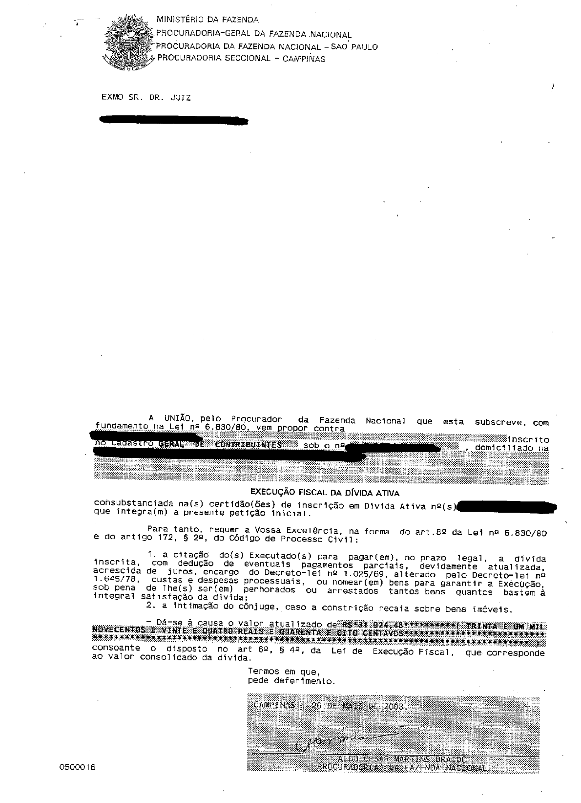 Execução Fiscal petição e CDA
