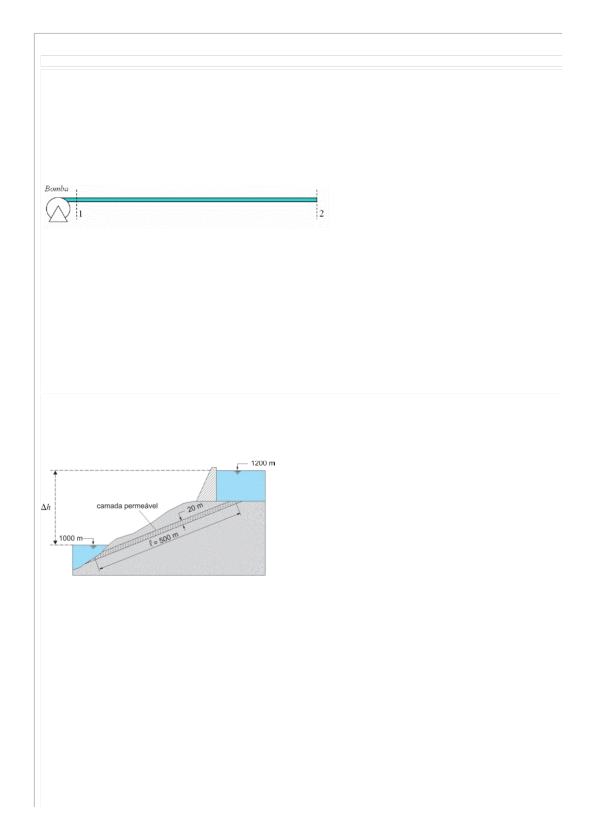 12/12/2016 UNIP Universidade Paulista : DisciplinaOnline Sistemas de conteúdo online para Alunos. http://online.unip.br/imprimir/imprimirconteudo 1/6 Exercício 1: As cabeças borrifadoras num sistema agrícola devem ser supridas com água através de 500 pés de tubo de PVC utilizando uma bomba acionada por motor de combustão interna. Na sua faixa de operação de maior eficiência, a vazão de descarga da bomba é de 1500 gpm a uma pressão não superior a 65psig. Para uma operação satisfatória, os borrifadores devem trabalhar a 30psig ou mais. As perdas localizadas e as variações de elevação podem ser desprezadas. Determine a perda de carga distribuída. (Dados: =998kg/m3, =1,02×106m2/s, PVC=0,015mm, LPVC=152m, 1psi=6897Pa) A 12 m B 17,2 m C 21 m D 24,6 m E 25,9 m O aluno respondeu e acertou. Alternativa(D) Comentários: A resposta correta B resposta correta C resposta correta D resposta correta Exercício 2: Após a construção de uma barragem, detectouse a presença de uma camada permeável de espessura uniforme igual a 20 m e que se estende ao longo de toda a barragem, cuja seção transversal está ilustrada abaixo. Essa camada provoca, por infiltração, a perda de volume de água armazenada. (Enade 2008) Sabese que, sob condições de fluxo laminar, a velocidade de fluxo aparente da água através de um meio poroso pode ser calculada pela Lei de Darcy, que estabelece que essa velocidade é igual ao produto do coeficiente de permeabilidade do meio pelo gradiente hidráulico — perda de carga hidráulica por unidade de comprimento percorrido pelo fluido, ou seja, Dh/l. A vazão de água através do meio é o produto da velocidade de fluxo pela área da seção atravessada pela água, normal à direção do fluxo. Suponha que o coeficiente de permeabilidade da camada permeável seja igual a 104 m/s, que ocorram perdas de carga hidráulica somente no trecho percorrido pela água dentro dessa camada e que a barragem e as demais camadas presentes sejam impermeáveis. Sob essas condições, a vazão (Q) por unidade de comprimento ao longo da extensão da barragem, que é perdida por infiltração através da camada permeável, satisfaz à seguinte condição: A Q < 10 5 m 3 /s/m B 10 5 m 3 /s/m < Q <10 4 m 3 /s/m C 10 4 m 3 /s/m < Q <10 3 m 3 /s/m D 10 3 m 3 /s/m < Q <10 2 m 3 /s/m E Q > 10 2 m3/s/m O aluno respondeu e acertou. Alternativa(C) Comentários: 12/12/2016 UNIP Universidade Paulista : DisciplinaOnline Sistemas de conteúdo online para Alunos. http://online.unip.br/imprimir/imprimirconteudo 2/6 A resposta correta B resposta correta C resposta correta Exercício 3: Há uma instalação hidráulica em uma fazenda, conforme a figura abaixo, o sistema que liga os reservatórios A e B, de níveis constantes é constituído por tubulações de diâmetro constante e igual a 0,10m e de comprimento total Leq=100m e, pela máquina M, sendo L=80m. A perda de carga na tubulação é dada por J=0,2v2/2g. Dessa forma determine o tipo de máquina e a potência fornecida ou retirada no eixo da máquina. Considere g=9,8m/s2, agua=1000kg/m3, 1cv=735W. Assinale a alternativa correta: A Bomba e Pot=1,67cv B Turbina e Pot=5,18cv C Bomba e Pot=8,25cv D Turbina e Pot=1,67cv E Bomba e Pot=4,56cv O aluno respondeu e acertou. Alternativa(D) Comentários: A resposta correta B resposta correta C resposta correta D resposta correta Exercício 4: Água a 20º C (densidade=100kg/m3) escoa em um tubo de plástico de 8cm de diâmetro com taxa de escoamento de 20L/s. Determine o fator de atrito (f) usando o diagrama de Moody. 12/12/2016 UNIP Universidade Paulista : DisciplinaOnline Sistemas de conteúdo online para Alunos. http://online.unip.br/imprimir/imprimirconteudo 3/6 A 0,0134 B 0,0143 C 0,0154 D 0,0176 E 0,018 O aluno respondeu e acertou. Alternativa(B) Comentários: A resposta correta B resposta correta Exercício 5: Água a 20º C (=100kg/m3) escoa em um tubo de ferro fundido de 4cm de diâmetro com taxa de escoamento de 20L/s. Determine o fator de atrito (f usando o diagrama de Moody se a velocidade média for 0,025 m/s. A 0,064 B 0,084 C 0,008 D 0,01 E 0,012 O aluno respondeu e acertou. Alternativa(A) Comentários: B resposta correta C resposta correta D resposta correta E resposta correta B resposta correta A resposta correta Exercício 6: Água a 15º C (=1000kg/m3) escoa em um tubo de 3,8 cm de diâmetro com vazão de 1,65 L/s. Usando o diagrama de Moody, determine a perda de carga em uma seção de 180m de comprimento se o tubo for ferro galvanizado. Eq de DarcyWeisbach: hf=f(L/D)(v2/2g). 12/12/2016 UNIP Universidade Paulista : DisciplinaOnline Sistemas de conteúdo online para Alunos. http://online.unip.br/imprimir/imprimirconteudo 4/6 A 16,8m B 14,8m C 12,8m D 10,8m E 8,8m O aluno respondeu e acertou. Alternativa(A) Comentários: A resposta correta Exercício 7: Um fazendeiro quer drenar água a 10º C de um lago a 1200m de um campo posicionado a uma distância de 3m abaixo da superfície do lago. Determine o tamanho do tubo de drenagem que deve ser escolhido se ele quiser drenar 700L de água a cada minuto. Utilize o diagrama de Moody para lhe auxiliar. 12/12/2016 UNIP Universidade Paulista : DisciplinaOnline Sistemas de conteúdo online para Alunos. http://online.unip.br/imprimir/imprimirconteudo 5/6 A 3,5cm B 8,3cm C 12,1cm D 15,2cm E 16,4cm O aluno respondeu e acertou. Alternativa(C) Comentários: A resposta correta A resposta correta B resposta correta C resposta correta Exercício 8: Querosene, com viscosidade cinemática de 0,03 cm²/s, é conduzido no interior de um tubo de ferro galvanizado ao longo da distância de 1000 m, com vazão de 0,06 m³/s e perda de 0,16m. O diâmetro, em m, é de A 0,54 B 1,2 C 0,18 D 1,3 E 0,005 O aluno respondeu e acertou. Alternativa(A) Comentários: B resposta correta E resposta correta D resposta correta B resposta correta A resposta correta Exercício 9: Considere 70% do rendimento da bomba no interior de um tubo de ferro fundido revestid