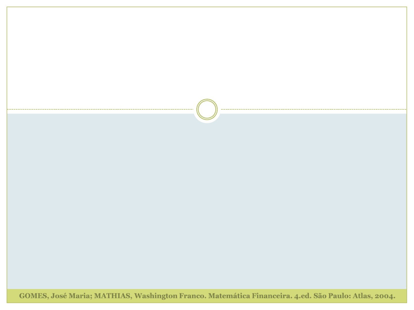 J U R O S C O M P O S T O S FOC T2 1 GOMES, José Maria; MATHIAS, Washington Franco. Matemática Financeira. 4.ed. São Paulo: Atlas, 2004. Juro e Montante No regime de juros compostos, o juro gerado pela aplicação será incorporado à mesma passando a participar da geração de juros no período seguinte. Diz-se que os juros são capitalizados, e como não só o capital inicial rende juros mas estes são devidos também sobre os juros formados anteriormente, temos o nome de juros compostos. GOMES, José Maria; MATHIAS, Washington Franco. Matemática Financeira. 4.ed. São Paulo: Atlas, 2004. 2 Diferença entre os regimes de capitalização 3 n Juros Simples Juros Compostos Juro por período Montante Juro por período Montante 1 1.000 x 0,2 = 200,00 $ 1.200 1.000 x 0,2 = 200,00 $ 1.200 2 1.000 x 0,2 = 200,00 $ 1.400 1.200 x 0,2 = 240,00 $ 1.440 3 1.000 x 0,2 = 200,00 $ 1.600 1.440 x 0,2 = 288,00 $ 1.728 4 1.000 x 0,2 = 200,00 $ 1.800 1.728 x 0,2 = 345,60 $ 2.074 GOMES, José Maria; MATHIAS, Washington Franco. Matemática Financeira. 4.ed. São Paulo: Atlas, 2004. Diferença entre os regimes de capitalização 4 GOMES, José Maria; MATHIAS, Washington Franco. Matemática Financeira. 4.ed. São Paulo: Atlas, 2004. $ 0 $ 500 $ 1,000 $ 1,500 $ 2,000 $ 2,500 0 1 2 3 4 Juros Simples Juros Compostos Montante 5 n Juros Compostos Cálculo do Montante 1 $ 1.000 × 1,2 = $ 1.200 2 $ 1.200 × 1,2 = $ 1.440 3 $ 1.440 × 1,2 = $ 1.728 4 $ 1.728 × 1,2 = $ 2.074 GOMES, José Maria; MATHIAS, Washington Franco. Matemática Financeira. 4.ed. São Paulo: Atlas, 2004. Montante 6 Nessa fórmula, a taxa de juros i refere-se à mesma medida de tempo utilizada para os n períodos, e deve ser expressa em sua forma unitária. n 0n 4 04 3 3434 3 03 2 2323 2 020212 01 )i1.(CC (...) )i1.(CC)i1.()i1.(CC)i1.(CC )i1.(CC)i1.()i1.(CC)i1.(CC )i1.(CC)i1).(i1.(CC)i1.(CC )i1.(CC GOMES, José Maria; MATHIAS, Washington Franco. Matemática Financeira. 4.ed. São Paulo: Atlas, 2004. Cálculo do juro 7 O juro Jn é calculado pela diferença entre o montante Cn em um período n e o capital inicial C0. 1)i1(.CJC)i1.(CJCCJ 107410002074JCCJ 72810001728JCCJ 44010001440JCCJ 20010001200JCCJ n 0n0 n 0n0nn 1044 1033 2022 1011 GOMES, José Maria; MATHIAS, Washington Franco. Matemática Financeira. 4.ed. São Paulo: Atlas, 2004. Cálculo do juro 8 A separação entre juros e principal apresenta aspectos práticos importantes, por exemplo, nos abatimentos fiscais que os juros geram para as pessoas física e jurídica. Qual o juro pago no caso do empréstimo de $ 1.000,00 à taxa de juros compostos de 2% a.m. pelo prazo de 10 meses? GOMES, José Maria; MATHIAS, Washington Franco. Matemática Financeira. 4.ed. São Paulo: Atlas, 2004. Valor atual e valor nominal 9 Valor atual: corresponde ao valor da aplicação em uma data inferior à do vencimento; Valor nominal: é o valor do título na data de seu vencimento. Sejam: V = valor atual na data zero (C0); N = valor nominal na data n (Cn); Tem-se que: n n )i1( N V)i1.(VN GOMES, José Maria; MATHIAS, Washington Franco. Matemática Financeira. 4.ed. São Paulo: Atlas, 2004. Exemplos 10 a) Por quanto devo comprar um título vencível daqui a 5 meses, com valor nominal de $ 1.131,40, se a taxa de juros compostos corrente for de 2,5% a.m.? b) Uma pessoa possui uma letra de câmbio que vence daqui a 1 ano, com valor nominal de $1.344,89. Foi-lhe proposta a troca daquele título por outro, vencível daqui a 3 meses e no valor de $1.080,00. Sabendo que a taxa corrente no mercado é de 2,5% a.m., pergunta-se se a proposta é vantajosa. GOMES, José Maria; MATHIAS, Washington Franco. Matemática Financeira. 4.ed. São Paulo: Atlas, 2004. Taxas equivalentes 11 Duas taxas são equivalentes se, considerados o mesmo prazo de aplicação e o mesmo capital, for indiferente aplicar em uma ou outra. De outro modo, considerando-se um mesmo capital aplicado por um mesmo intervalo de tempo a cada uma das taxas, ambas as taxas produzirão um mesmo montante se forem equivalentes. GOMES, José Maria; MATHIAS, Washington Franco. Matemática Financeira. 4.ed. São Paulo: Atlas, 2004. Taxas equivalentes 12 Sejam: I = referente a um intervalo de tempo p; Iq = referente a um intervalo de tempo igual à fração própria p/q (q>p). GOMES, José Maria; MATHIAS, Washington Franco. Matemática Financeira. 4.ed. São Paulo: Atlas, 2004. Taxas equivalentes 13 O capital C0 pode ser aplicado a duas taxa i e iq que teremos o mesmo montante: 1i1i i1i1i1)i1( )i1(i1)i1.(C)i1.(C )i1.(CC )i1.(CC q q q qq 1 q 1 q q q q q q0 1 0q q0q 1 01 GOMES, José Maria; MATHIAS, Washington Franco. Matemática Financeira. 4.ed. São Paulo: Atlas, 2004. Exemplos 14 a) Dada a taxa de juros de 9,2727% ao trimestre, determinar a taxa de juros compostos equivalente mensal. b) Suponha que: C0 = $ 1.000,00 iq = 2 % a.m. i = 26,824 % a.a. n = 1 ano Verifique se i e iq são equivalentes. GOMES, José Maria; MATHIAS, Washington Franco. Matemática Financeira. 4.ed. São Paulo: Atlas, 2004. Exemplos 15 c) Se um capital de $ 1.000,00 puder ser aplicado às taxas de 10 % a.a. ou de 33,1 % ao triênio, determinar a melhor aplicação. GOMES, José Maria; MATHIAS, Washington Franco. Matemática Financeira. 4.ed. São Paulo: Atlas, 2004. Períodos não-inteiros 16 Convenção exponencial Os juros do período não-inteiro são calculados utilizando-se a taxa equivalente. Procede-se em duas etapas: 1ª etapa: Calcula-se o montante correspondente à parte inteira de períodos, aplicando-se a fórmula de montante para juros compostos. 2ª etapa: Na fração de tempo não-inteiro restante, admite-se uma formação exponencial dos juros. GOMES, José Maria; MATHIAS, Washington Franco. Matemática Financeira. 4.ed. São Paulo: Atlas, 2004. Exemplo 17 Um capital de $ 1.000,00 é emprestado à taxa de juros compostos de 10% a.a., pelo prazo de 5 anos e 6 meses. Tendo por base a capitalização anual, qual será o montante? GOMES, José Maria; MATHIAS, Washington Franco. Mat