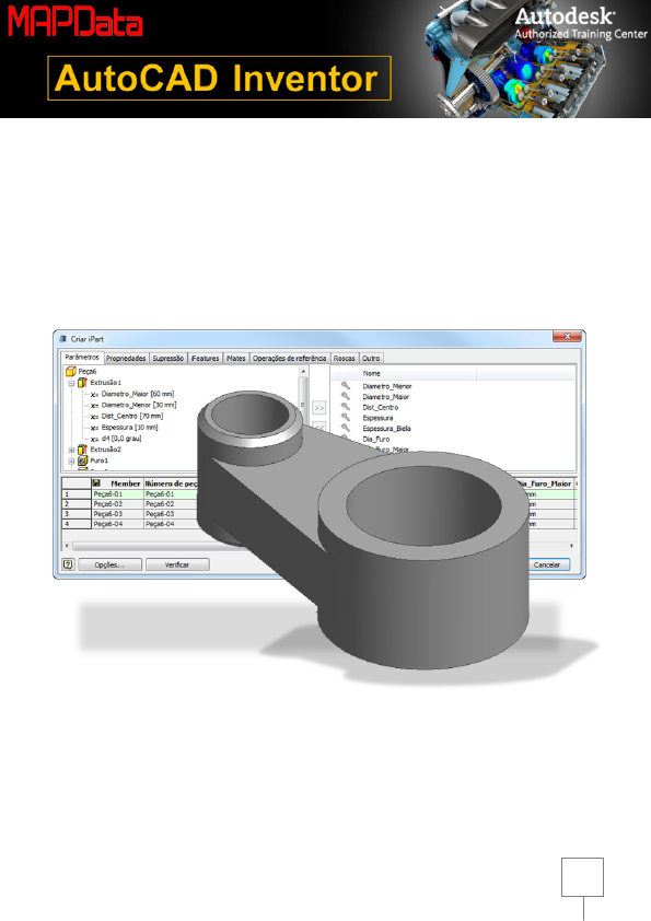 www.mapdata.com.br 1/14 Tutorial Criação de Famílias de Peças iPart www.mapdata.com.br 2/14 1 – Selecione o comando “Novo”, em seguida selecione a opção Padrao.ipt (Template) para iniciar um novo arquivo de peça Autodesk Inventor. 2 – Criar o esboço mostrado na figura abaixo seguindo os seguintes critérios: a. O círculo menor está na origem (0,0,0) e com a restrição “Fixa” (Fix) no ponto de origem projetado; b. Os dois círculos estão alinhados horizontalmente com a restrição “Horizontal”; c. As duas linhas inclinadas estão tangentes aos círculos, com 2 restrições de tangência cada linha. d. Obs.: Para visualizar as restrições nas geometrias basta pressionar a tecla F8 e para deixar de visualizá-las F9. 3 – Vamos agora adicionar as dimensões, para isso siga exatamente o seguinte procedimento: a. Acessar o comando “Cota”; b. Clicar no círculo menor, a dimensão já será mostrada; c. Clicar na área gráfica para posicionar a dimensão. Não se preocupe nesse instante com o valor da dimensão. d. Siga o mesmo procedimento para dimensionar o círculo maior. www.mapdata.com.br 3/14 4 – Adicione agora a dimensão para definir a distância entre centros dos círculos, para isso siga o seguinte procedimento: a. Acessar o comando “Cota”; b. Clicar no círculo menor e em seguida no círculo maior; c. Clicar na área gráfica para posicionar a dimensão. Não se preocupe nesse instante com o valor da dimensão. 5 – As dimensões serão controladas por variáveis nominadas, para isso siga o seguinte procedimento: a. Dê um duplo clique na dimensão do círculo menor. Será mostrada a caixa “Editar Cota”. Ao invés de alterarmos o valor da dimensão entrando somente com um valor numérico, digite Diametro_Menor=30. Isso significa que será criado uma variável chamada “Diametro_Menor” com valor de 30mm. b. Após digitado Diametro_Menor=30 clique no “check” verde para efetivar a modificação. c. Faça o mesmo procedimento para o círculo maior, entrando com Diametro_Maior=60 www.mapdata.com.br 4/14 d. Edite agora a dimensão da distância entre centros, entrando com Dist_Centro=70 6 – Finalize o esboço, para isso clique no comando “Encerrar Esboço” que se encontra no canto superior direito da área gráfica. 7 – Vamos agora criar a primeira operação (Feature) de extrusão. Siga os seguintes procedimentos: a. Clique em qualquer entidade de seu esboço. Automaticamente serão mostradas as ferramentas de “Manipulação Direta”; b. Selecione a ferramenta “Extrusão” (ver imagem abaixo). c. Após selecionar a ferramenta “Extrusão” será aberto seu respectivo Quadro de Diálogo, já com a opção “Perfil” ativada. d. Selecione as 3 áreas fechadas de sua geometria (áreas 1, 2 e 3 mostradas na imagem abaixo). Não clique ainda no botão OK para concluir o comando. www.mapdata.com.br 5/14 e. No Quadro de Diálogo Extrusão selecione a opção “Distância” e no campo logo abaixo entre com a variável Espessura=10 (Ver imagem abaixo). f. Clique no botão OK para concluir o comando. g. Os passos solicitados acima (Distância + Variável + OK) também poderão ser executados nas ferramentas de “Manipulação Direta” (ver imagem abaixo). 8 – Pronto, a primeira operação já está concluída. Seu modelo deverá estar conforme imagem abaixo. 9 – Vamos agora iniciar um novo Esboço (Sketch) para que possamos criar novas geometrias 2D, para isso siga os seguintes procedimentos: a. Clique na face superior na peça. Serão mostradas novas ferramentas de Manipulação Direta. b. Selecione a ferramenta “Criar Esboço” (Ver imagem abaixo). www.mapdata.com.br 6/14 c. Após a execução do passo anterior, será iniciado um novo Esboço (Sketch) e seu ambiente de trabalho deverá estar com as seguintes características: o O Grid será mostrado (se essa opção estiver habilitada em sua configuração do software); o Um novo Esboço (Esboço 2) foi criado na “Barra do Navegador”; o Todas as arestas da face do sólido foram projetadas (2 linhas e 2 arcos) para o esboço corrente; o Os centros dos arcos foram projetados para o esboço corrente. 10 – Crie agora 2 círculos e insira as restrições (constraints) necessárias, seguindo os seguintes passos: a. Ativar o comando Círculo que se encontra no Painel Desenhar; b. Clicar aleatoriamente na área gráfica criando os 2 círculos, nesse momento não se preocupe com as dimensões dos círculos; c. Insira as restrições de coincidente entre os círculos e os centros dos raios. Obs.: Durante a criação dos círculos é possível já incluir as restrições de coincidente, para isso basta criar os círculos posicionando nos centros dos raios. Antes de aplicar as restrições Após a aplicação das restrições “Coincidente” www.mapdata.com.br 7/14 11 – Inserir restrições de “Igualdade” entre os círculos e os arcos seguindo os seguintes procedimentos: a. Acessar o comando “Restrição Igualdade”; b. Selecionar o círculo e em seguida o arco em que está concêntrico; c. Repetir o mesmo procedimento para o outro círculo. Antes de aplicar as restrições Após a aplicação das restrições “Igualdade” 12 - Finalize o esboço, para isso clique no comando “Encerrar Esboço” que se encontra no canto superior direito da área gráfica (Caso tenha dúvida onde se localiza esse comando, veja item 6 nesse tutorial) 13 - Vamos agora criar uma nova operação (Feature) de extrusão. Siga os seguintes procedimentos: a. Clique em qualquer círculo de seu esboço. Automaticamente serão mostradas as ferramentas de “Manipulação Direta”; b. Selecione a ferramenta “Extrusão” (ver imagem abaixo). c. Após selecionada a ferramenta “Extrusão” será aberto seu respectivo Quadro de Diálogo, já com a opção “Perfil” ativada. d. Selecione as 2 áreas internas dos 2 círculos (áreas 1 e 2 mostradas na imagem abaixo). Não clique ai