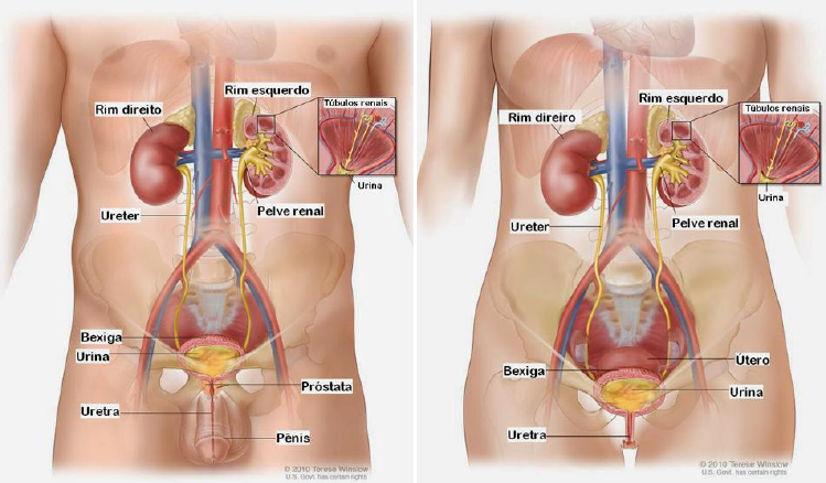 SISTEMA URINÁRIO Aline Lima da Silva 1) Introdução O sistema urinário é constituído por dois rins, dois ureteres, uma bexiga e uma uretra. Os rins produzem a urina, a qual é guiada até a bexiga pelos ureteres, sendo eliminada para o meio externo através da uretra. Por minuto, é produzido 125 ml de urina que contém diversos resíduos metabólitos, além de água, eletrólitos e não eletrólitos, os quais estão em excesso no organismo. A excreta desse sistema auxilia na manutenção da homeostase, ou seja, na manutenção do equilíbrio dinâmico do organismo, por meio dos processos de filtração, absorção ativa e passiva, além da excreção de substâncias presentes no sangue, processos que ocorrem ao longo dos túbulos urinários. Outra função exercida pelos rins é a de secreção de substâncias, tais como a enzima renina que regula a pressão arterial, a glicoproteína eritropoietina (EPO), responsável pela estimulação da síntese de eritrócitos na medula óssea e participa juntamente com o fígado e com a pele na ativação da vitamina D3. A figura abaixo mostra a disposição anatômica dos órgãos do sistema urinário tanto no homem quanto na mulher. Figura 1: SISTEMA URINÁRIO Fonte: https://sites.google.com/site/sistemaurinarioereprodutor/ (Acesso: 20/03/2018) A manutenção do meio interno pelos rins é realizada pelo equilíbrio entre a perda, através da sudorese, umidificação das vias aéreas e por meio das fezes, e o ganho de água, por meio da alimentação e da ingestão. Em resumo, o organismo está em constante movimento entre ativar o centro da sede ou formar a urina. Desse modo, percebe-se que o aumento da ingestão de líquidos ativa o sistema urinário, estimulando a produção de urina, ao passo que a queda dessa ingesta desloca o equilíbrio para a diminuição da produção de urina e para a ativação do centro da sede. 2) Rim Macroscopicamente, os rins apresentam um formato de “feijão”, por ter uma região mais larga e convexa e outra mais estreita e côncava, chamada de hilo renal. Recobrindo externamente o órgão, tem-se uma cápsula de tecido conjuntivo denso, rica em colágeno tipo I. O hilo é o local de entrada e de saída de artéria e veia renais, entrada de nervos e saída do ureter. Internamente, percebe-se que essa estrutura abre-se na pélvis renal, porção mais superior e dilatada do ureter, a qual apresenta tecido adiposo unilocular e dois a três cálices Anatomicamente, os rins podem ser divididos em duas regiões: a cortical, mais externa, e a medular, próxima ao hilo. A medula apresenta de 10 a 18 pirâmides renais cujos ápices desembocam na pélvis renal, através de uma porção dilatada chamada de papilas renais, as quais apresentam orifícios (área crivosa), permitindo a passagem da urina até o ureter. Já das bases piramidais partem os raios medulares, estruturas retilíneas, que penetram na zona cortical. Outra divisão que o rim pode sofrer é em lobo renal, área que compreende uma pirâmide renal e o tecido conjuntivo ao seu redor, e em lóbulo renal, região delimitada por duas artérias interlobulares, abrangendo um raio medular e o tecido conjuntivo ao seu redor. Embriologicamente, o túbulo urinífero apresenta duas áreas distintas: o néfron e o túbulo coletor. O primeiro é a responsável pela produção de urina, sendo classificado como unidade funcional dos rins, enquanto o segundo é responsável pelo transporte da urina até os ductos coletores. 3) Néfron Agora será apresentada uma visão geral das estruturas que compões o néfron. A primeira estrutura é o corpúsculo renal, o qual é formado pela arteríola aferente, a qual penetra no corpúsculo através do polo sanguíneo, e pela cápsula de Bowman. Esse vaso sanguíneo sofre diversas ramificações até tornarem-se vários capilares enovelados cujo conjunto é passa a ser chamado de glomérulo. Posteriormente, esses capilares anastomosam-se, formando a arteríola eferente que sairá do corpúsculo. O outro componente desta estrutura é a cápsula de Bowman, a qual é composta por dois folhetos e pelo espaço entre eles. Comunicando-se com o pólo urinário do corpúsculo, existe uma estrutura chamada de túbulo contorcido proximal, depois será a estrutura alça de Henle, primeiramente a alça descendente com seus segmentos espesso e delgado, seguida da alça ascendente, também com seus dois segmentos. Por último, a alça de Henle desemboca no túbulo contorcido distal, finalizando o néfron. A partir disso, começa os túbulos coletores que receberam a urina do TCD e desembocará no ducto coletor que, por sua vez, desemboca na papila renal localizada no ápice da pirâmide renal. Observa-se que um ducto é responsável por receber a urina de diversos néfrons, além disso, a estrutura denominada de raio medular, nada mais é do que esses ductos coletores. Existem dois tipos de néfrons: justamedulares e os corticais. O primeiro tipo está próximo ao limiar da região cortical com a medular e, por isso, apresenta parte da alça de Henle na porção medular, enquanto todas as outras estruturas estão na porção cortical. Já o segundo tipo, encontra-se exclusivamente na porção mais externa do rim e, por esse motivo, apresenta o segmento descendente delgado da alça de Henle muito curta e não apresenta o segmento ascendente delgado. Figura 4: NÉFRON Fonte: https://www.todamateria.com.br/nefron/ (Acesso: 25/03/2018) 4) Corpúsculo Renal Como dito anteriormente, o glomérulo é um conjunto de capilares enovelados, fenestrados (com poros) e sem diafragma. Adiantando um pouco a matéria de sistema cardiovascular, pode-se afirmar que o capilar é o vaso sanguíneo de menor calibre (diâmetro) que existe em nosso corpo, sendo constituído pelo tecido epitelial de revestimento pavimentoso e simples (endotélio), o qual suas células formam os poros (fenestras/ aberturas) que servem de canal dentro do endotélio, sendo que não há